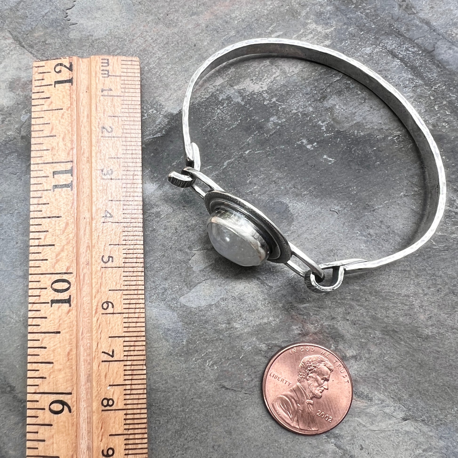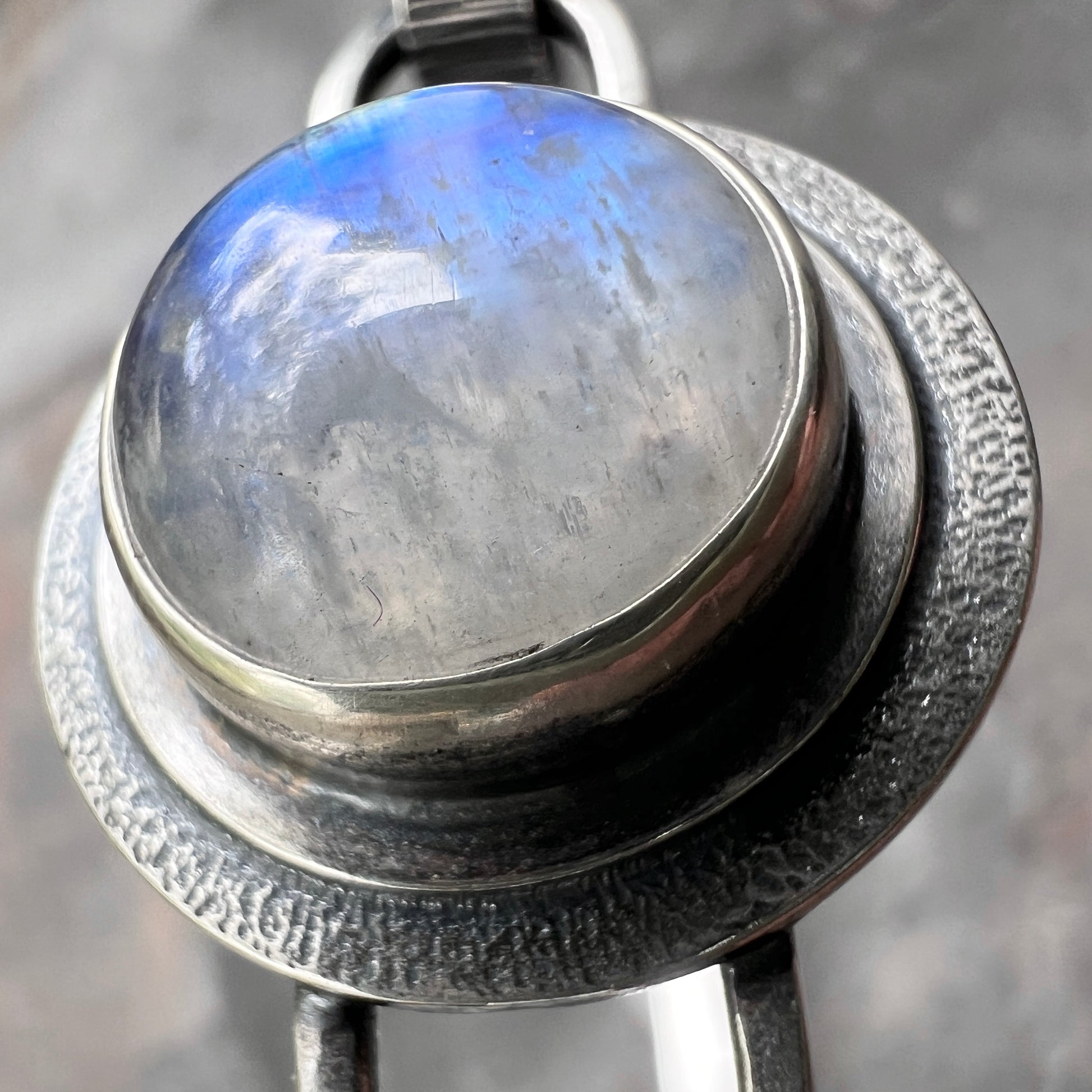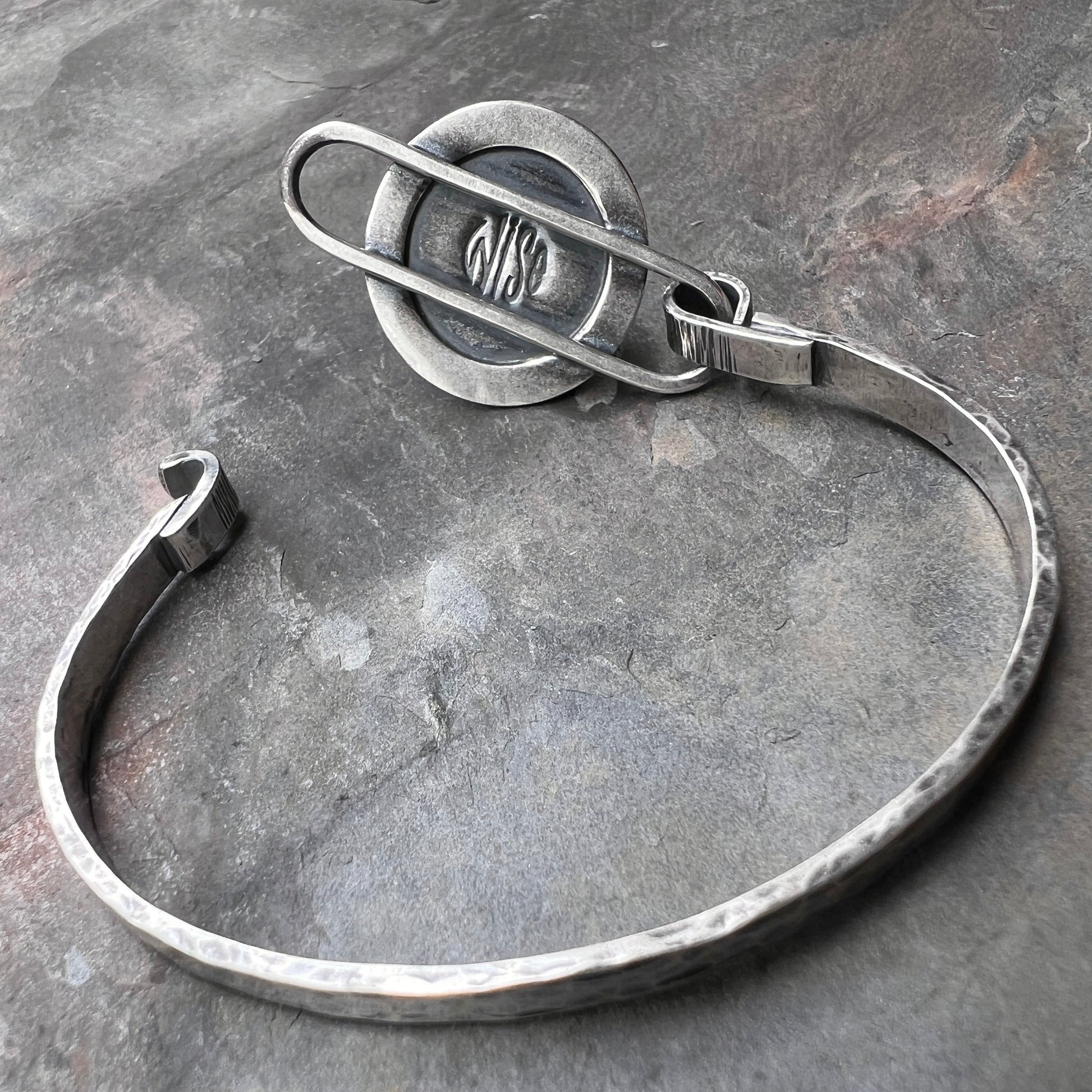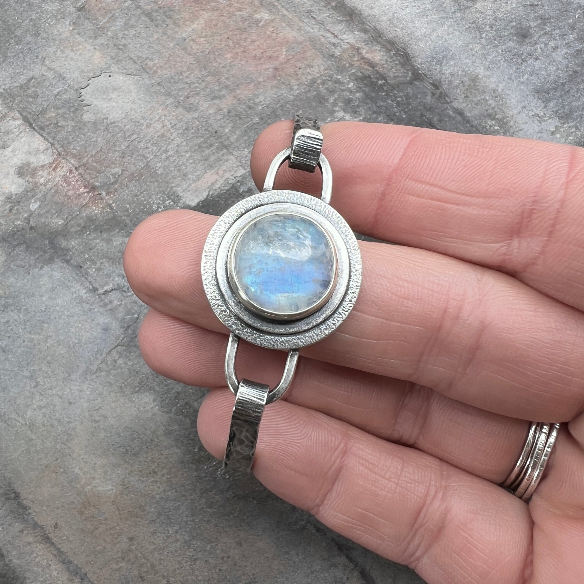 This artisan tension cuff bracelet is handmade from sterling silver and a genuine rainbow moonstone cabochon. The natural stone is framed by a textured silver border and features a hammered silver cuff. I have made this one of a kind bracelet by sawing, soldering, hammering, and finishing the design entirely by hand. The silver has been oxidized and polished to create an antique patina finish.