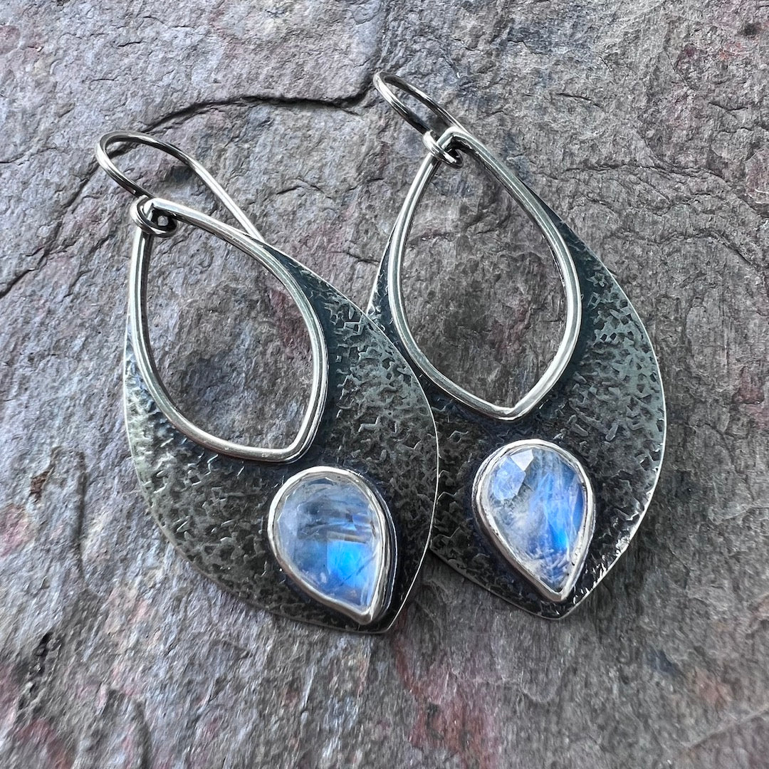 I have set a pair of one-of-a-kind Rainbow Moonstone gems in sterling and fine silver. The beautiful stones are accented by textured petal shapes I have cut from a sheet of pure sterling silver. I have made the earrings by forming, soldering, texturing, and finishing the design entirely by hand. Each stone flashes unique hues as light is reflected along the surface. Earrings hang from handformed sterling silver earwires. The silver has been oxidized and polished to create the patina finish.
