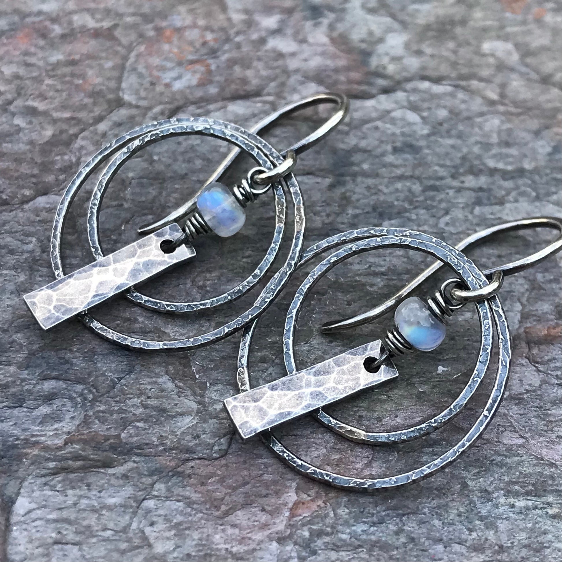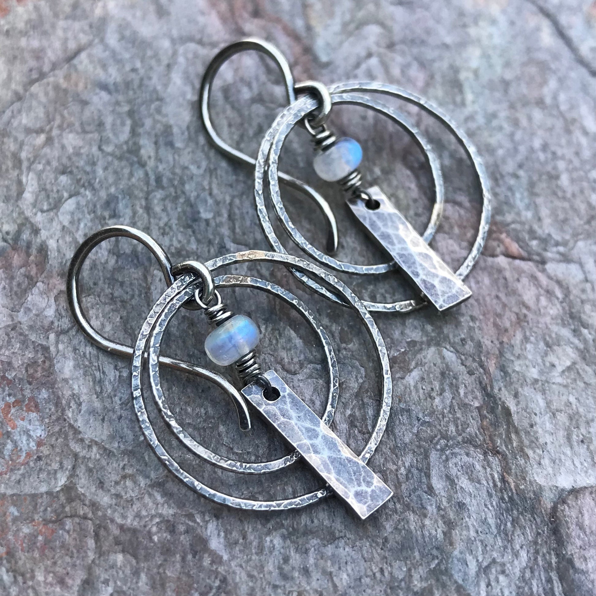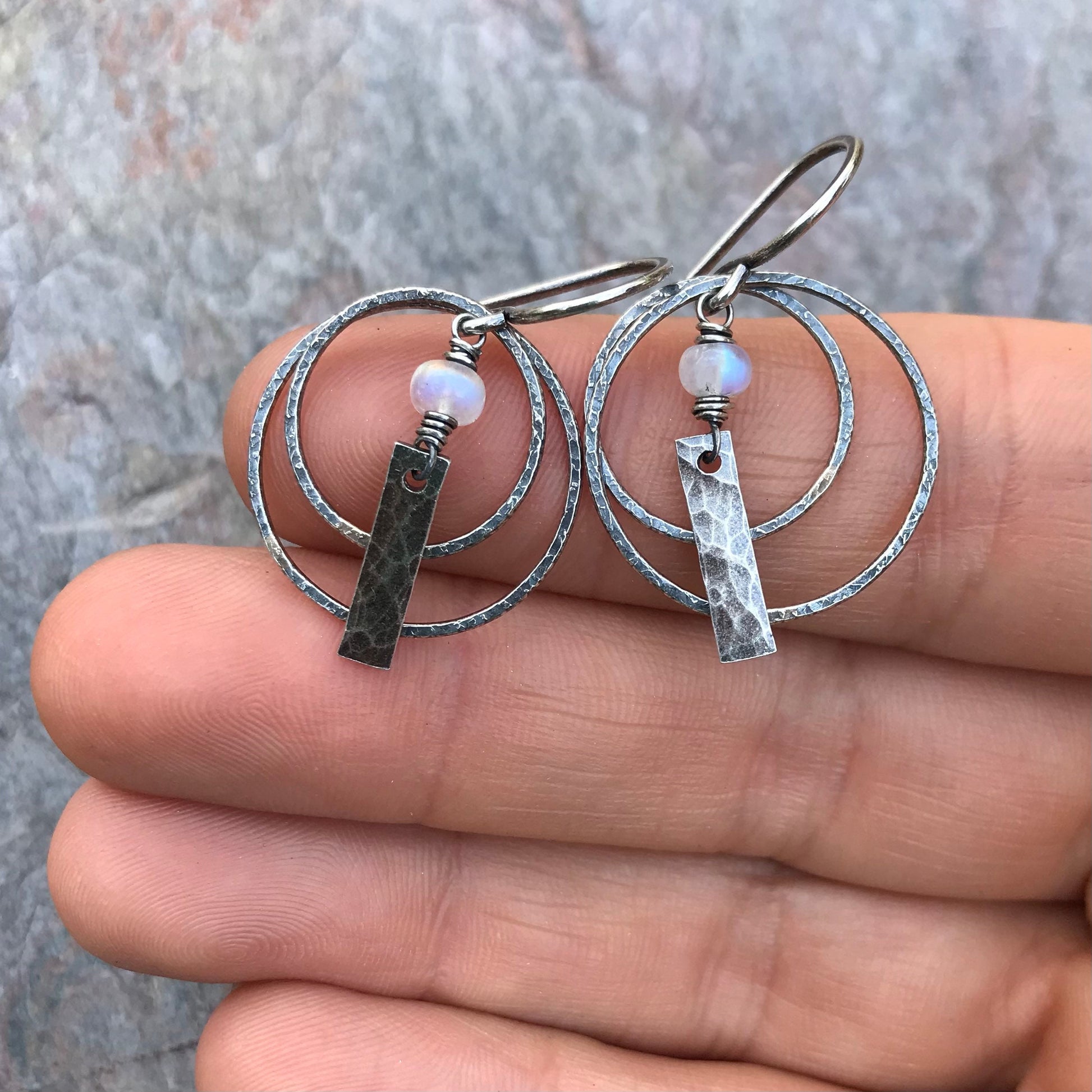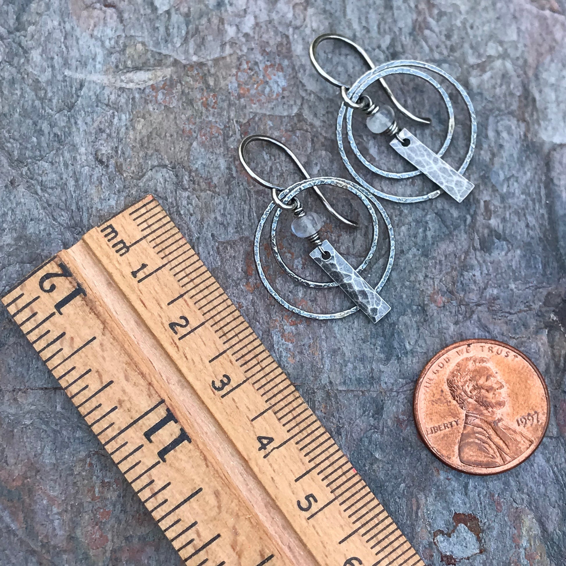 Rainbow Moonstone Sterling Silver Earrings - Rainbow Moonstone Circle and Bar Earrings