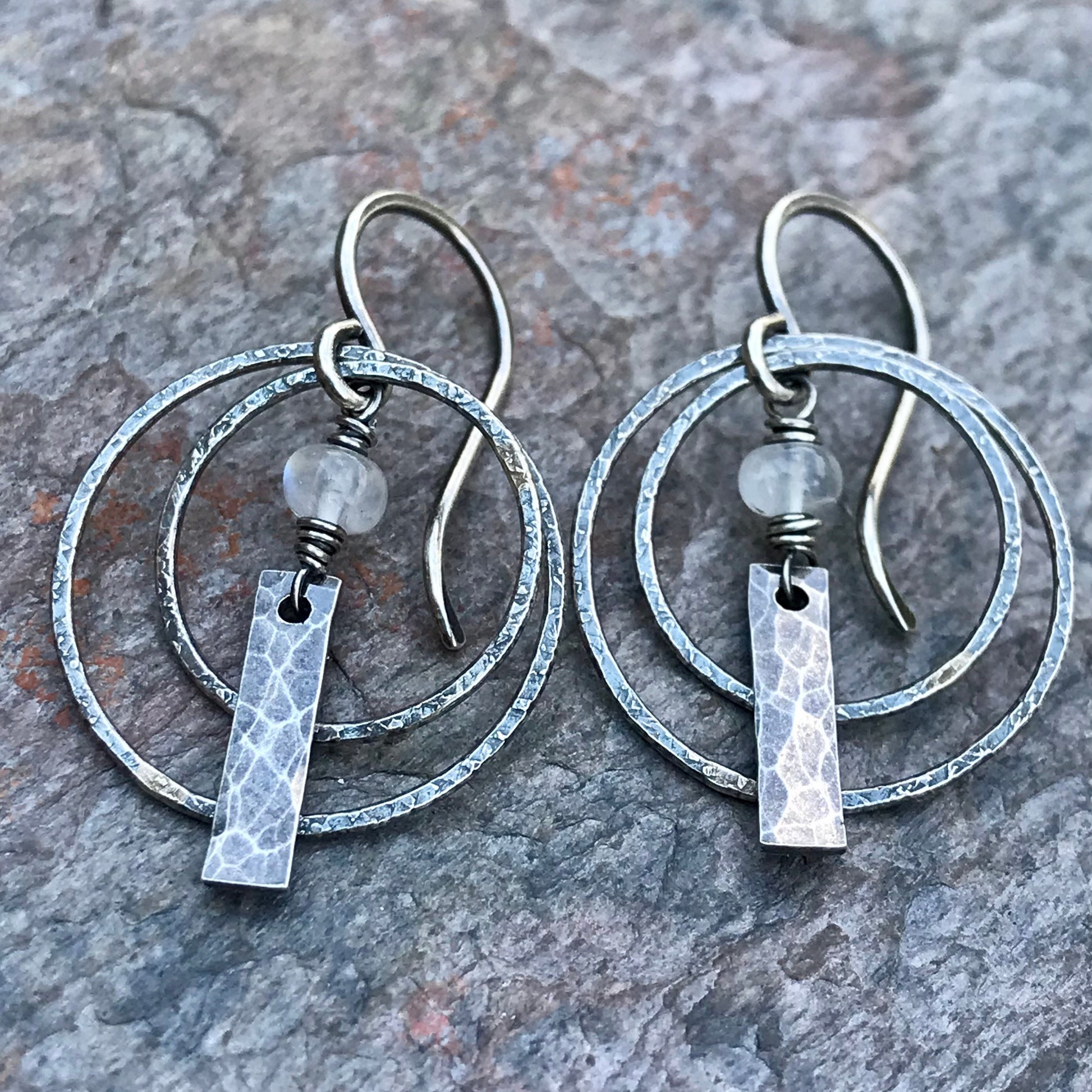 Smooth Rainbow Moonstone rondelles have been wrapped in sterling silver. The stones are framed by sterling silver rings which I have formed, soldered, and hammered by hand. Textured sterling silver bars dangle below the Rainbow Moonstone. The earrings hang from handformed sterling silver earwires.