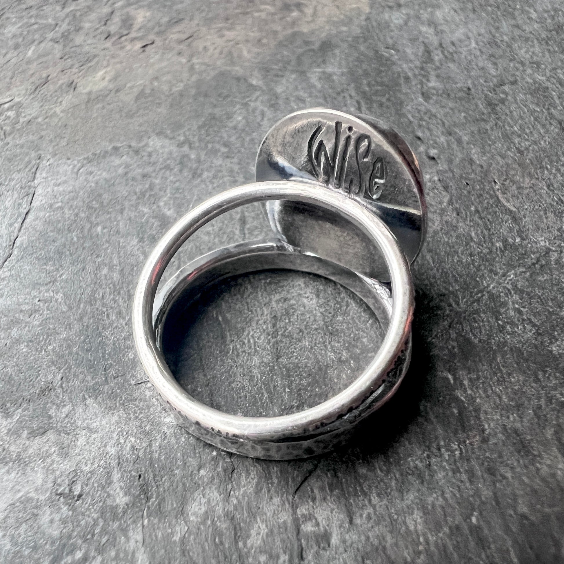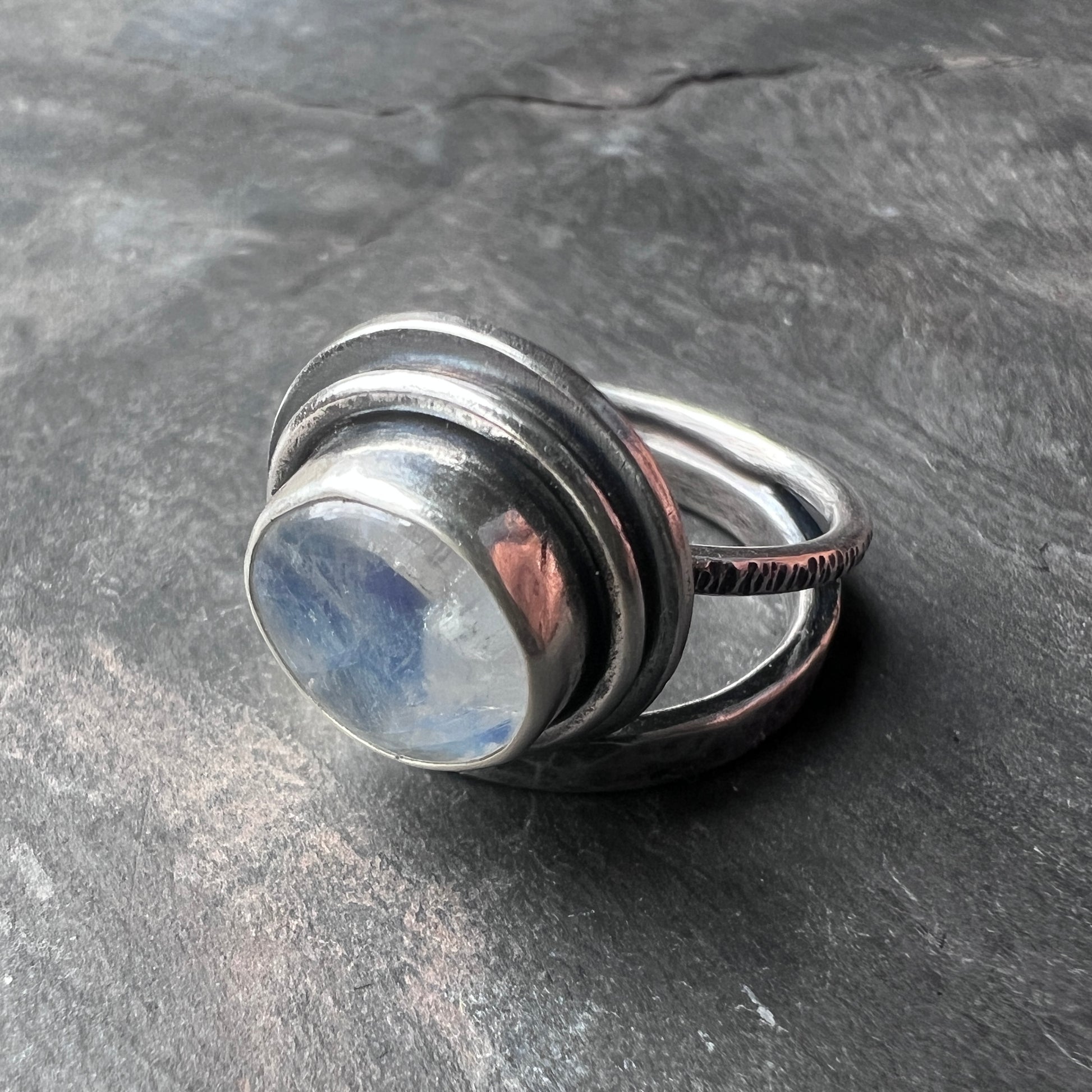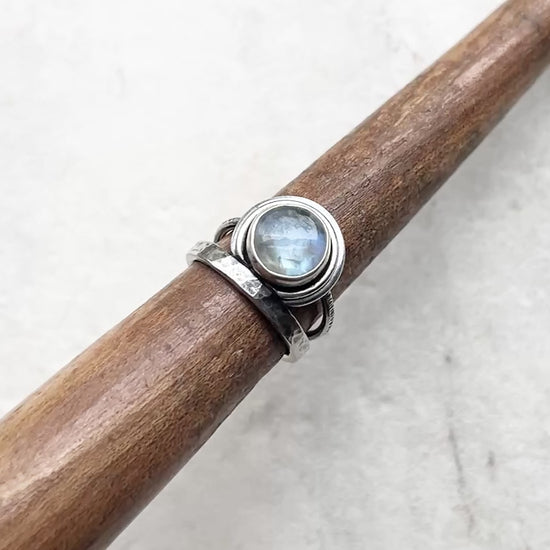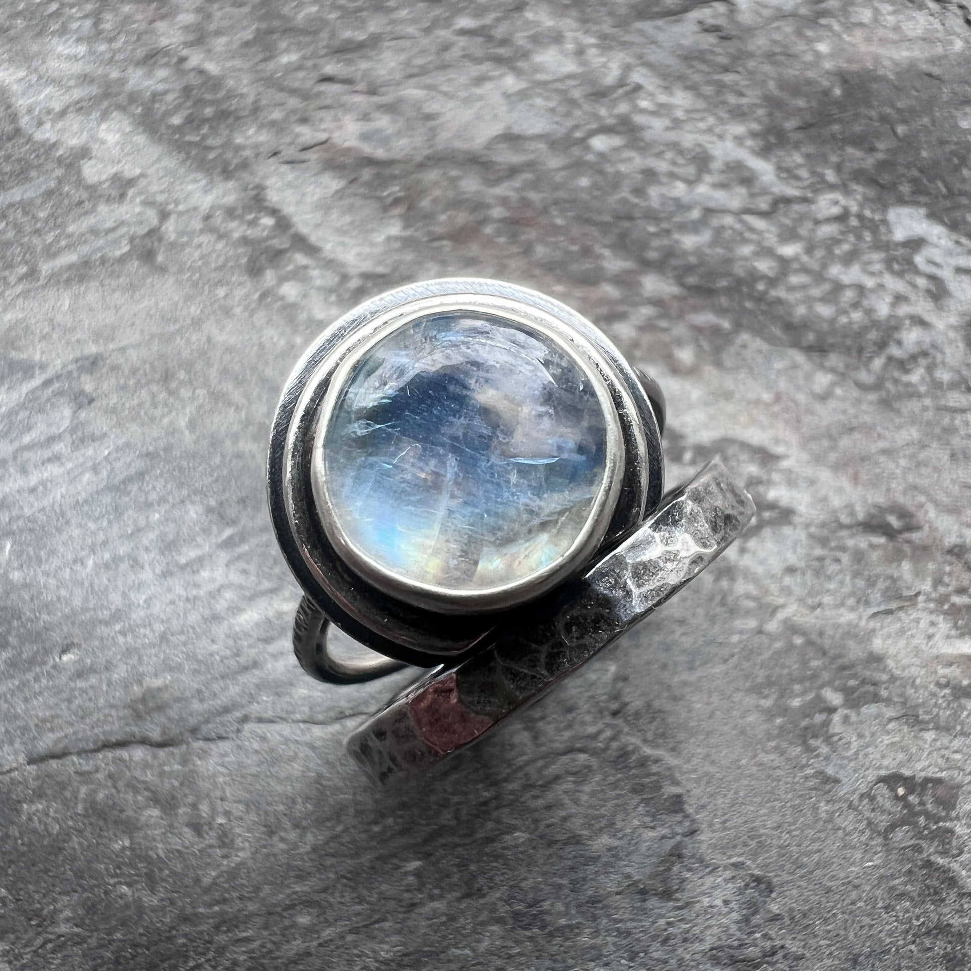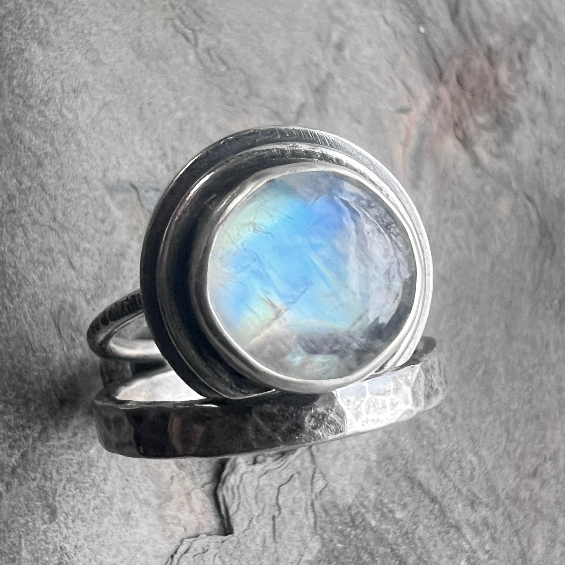 This ring is created from a genuine Rainbow Moonstone cabochon and sterling silver. The round natural stone is semi-transparent white with flashes of aqua, blue, and gold as light moves across the surface. The cabochon is framed by a circular silver border. The ring features a hammered sterling silver band. I have made this unique ring by forming, hammering, soldering, and finishing the piece entirely by hand. The silver has been oxidized and polished to create an antique patina finish.