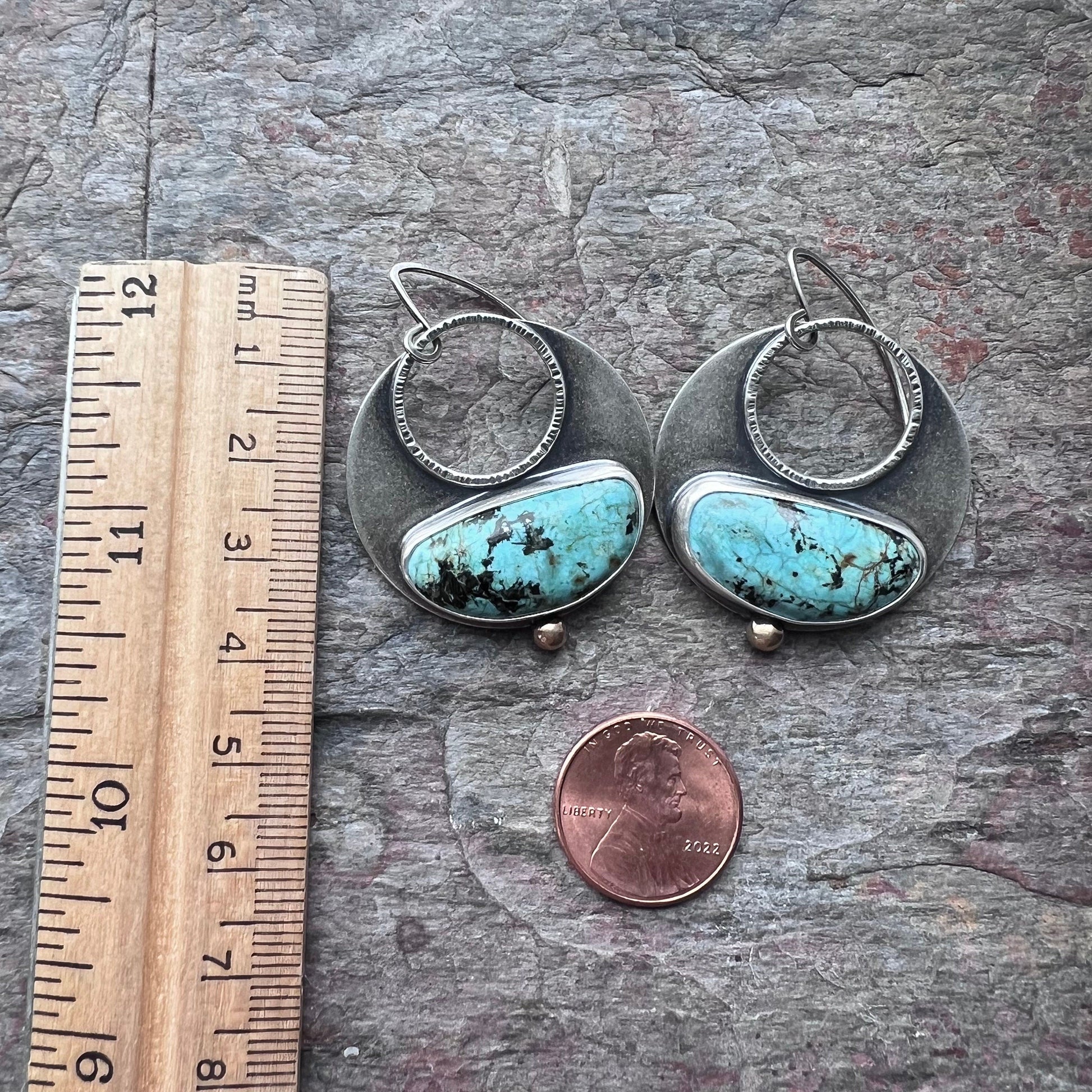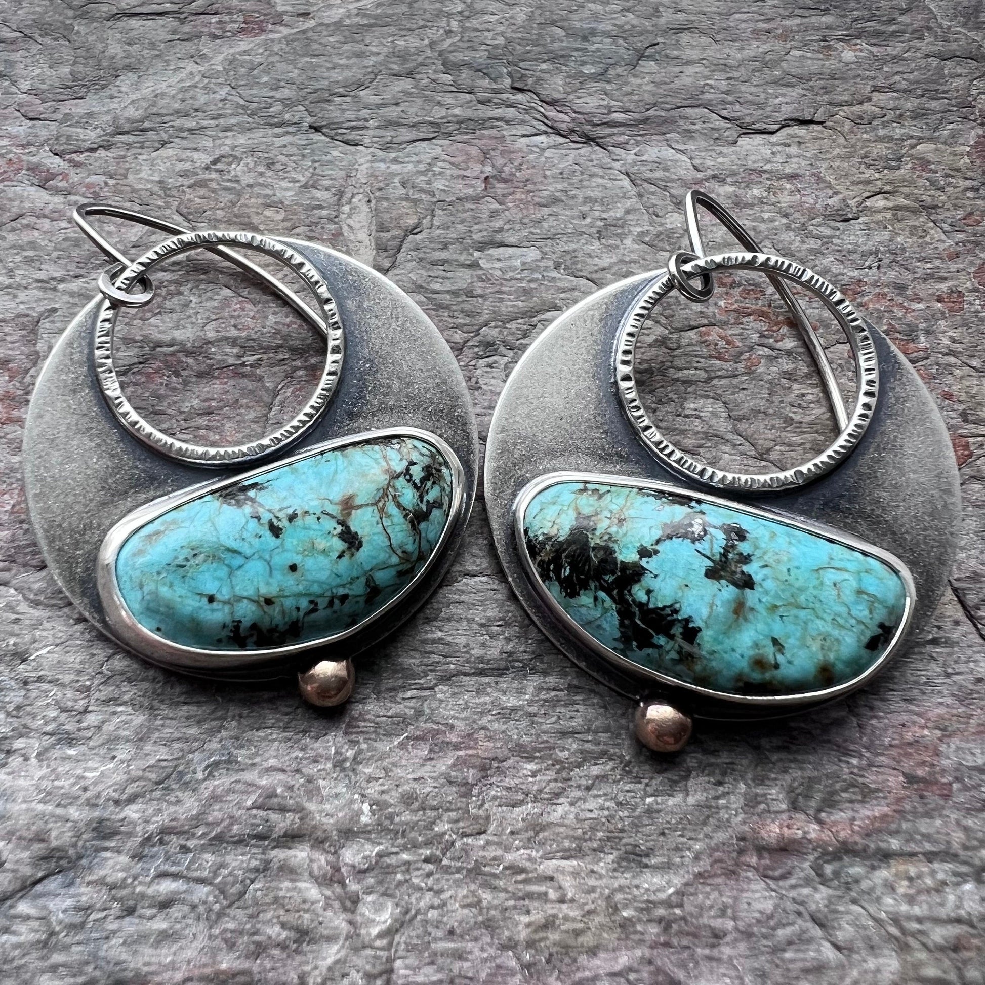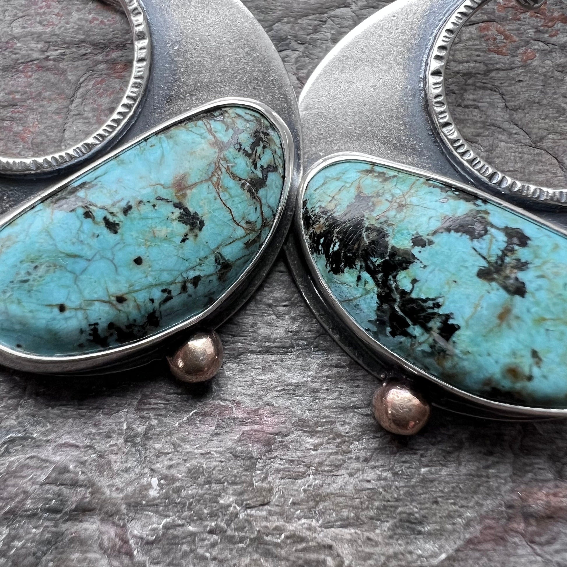 A pair of chrysocolla cabochons have been set in sterling and fine silver. The stones are accented by golden granules made from jeweler's grade brass. I have made these one-of-a-kind earrings by sawing, soldering, texturing, and finishing the design entirely by hand. Earrings dangle from handformed sterling silver earwires. The silver has been oxidized and polished to create a patina finish.