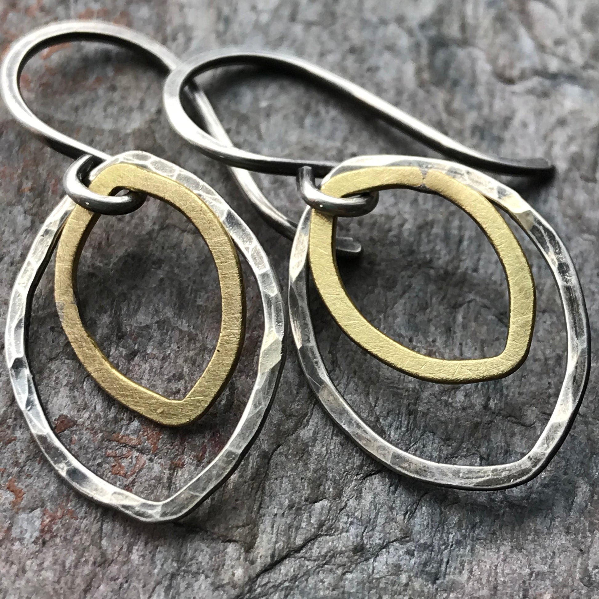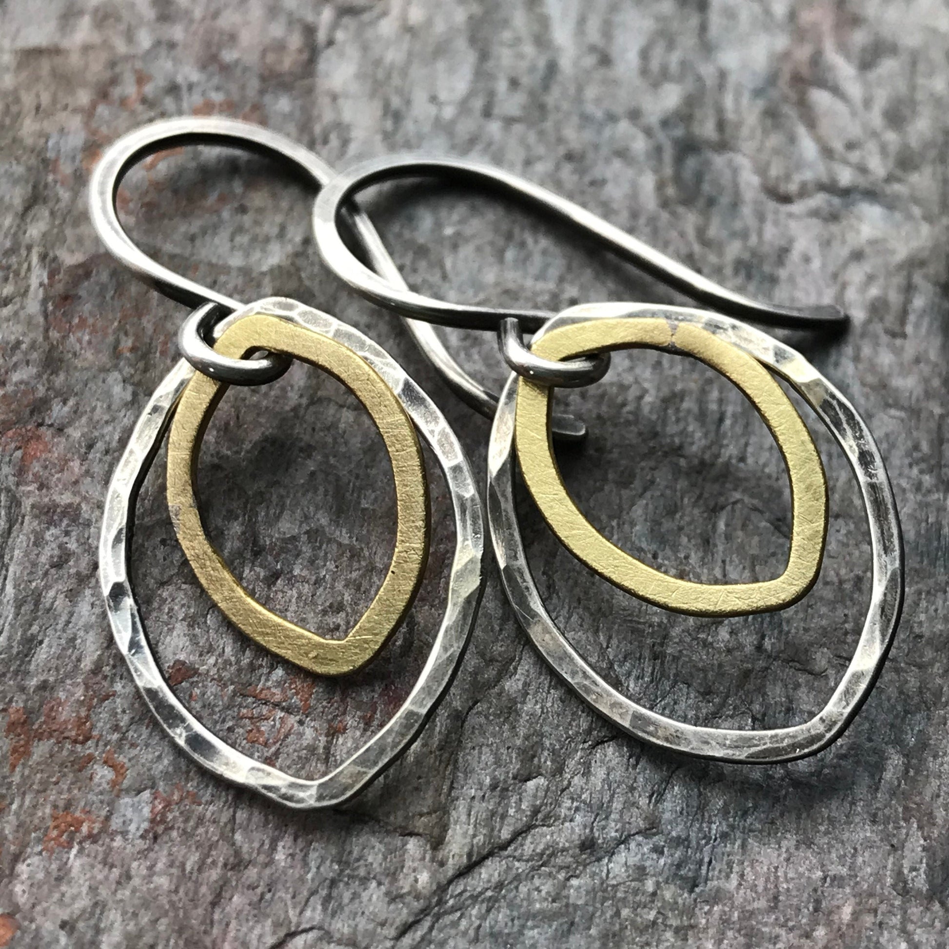 Handformed sterling silver and brass petals hang from handmade sterling silver earwires. The outer petals have been created by forming, soldering, and hammering pure sterling silver. The inner petals have been creating by forming, soldering, and hammering solid brass.