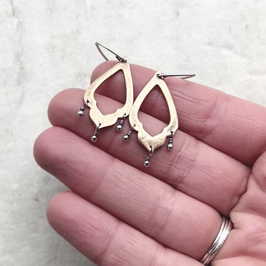 These chandelier dangle earrings are handmade from sterling silver and golden bronze. I have cut each fancy drop shape from solid bronze. I then carefully wrapped a set of six beaded silver balls which dangle from the bronze drops. The earrings hang from handmade sterling silver earwires. The silver has been oxidized and polished to create an antique patina finish.