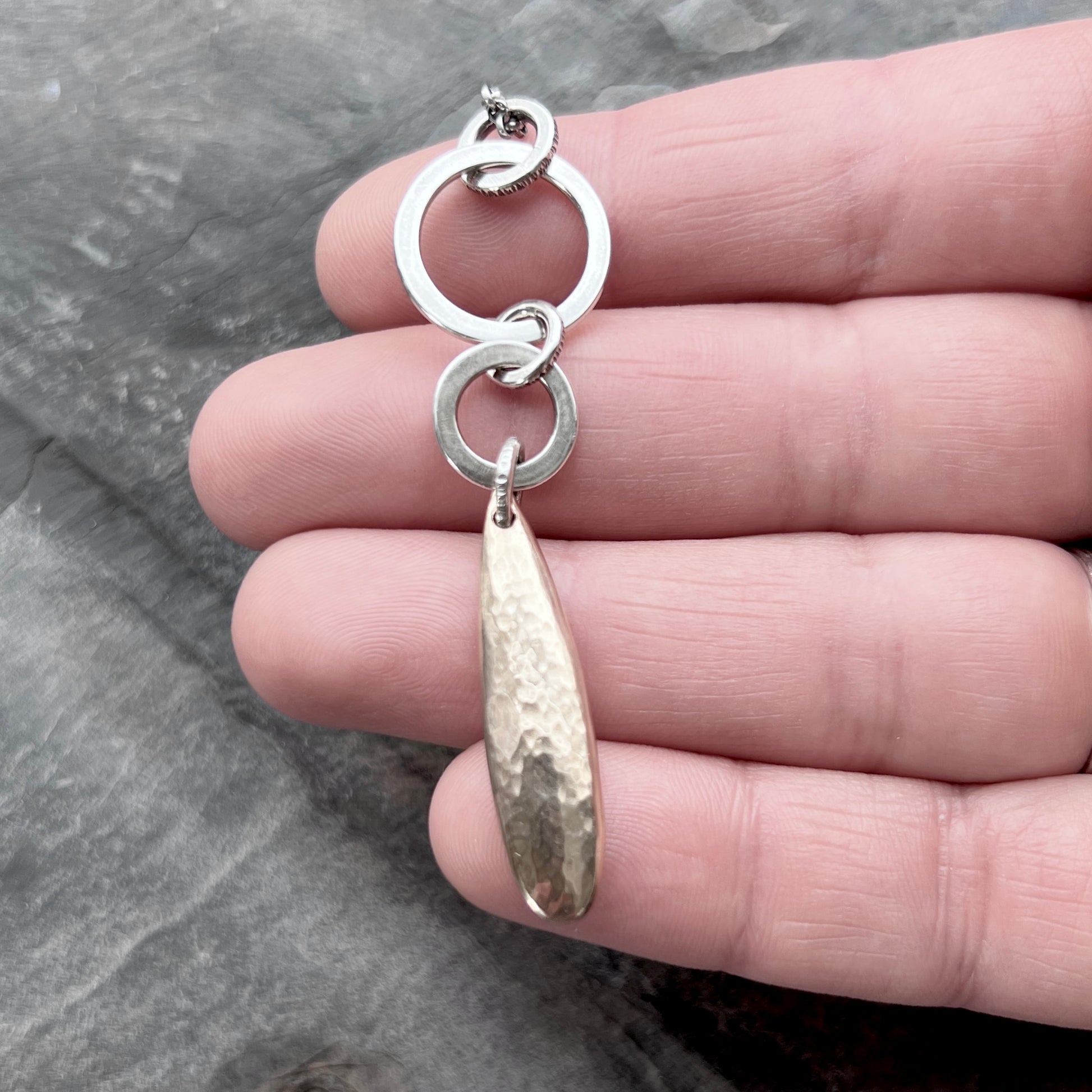 Sterling Silver and Bronze Teardrop on Rings Necklace | Minimalist Hammered Drop Pendant