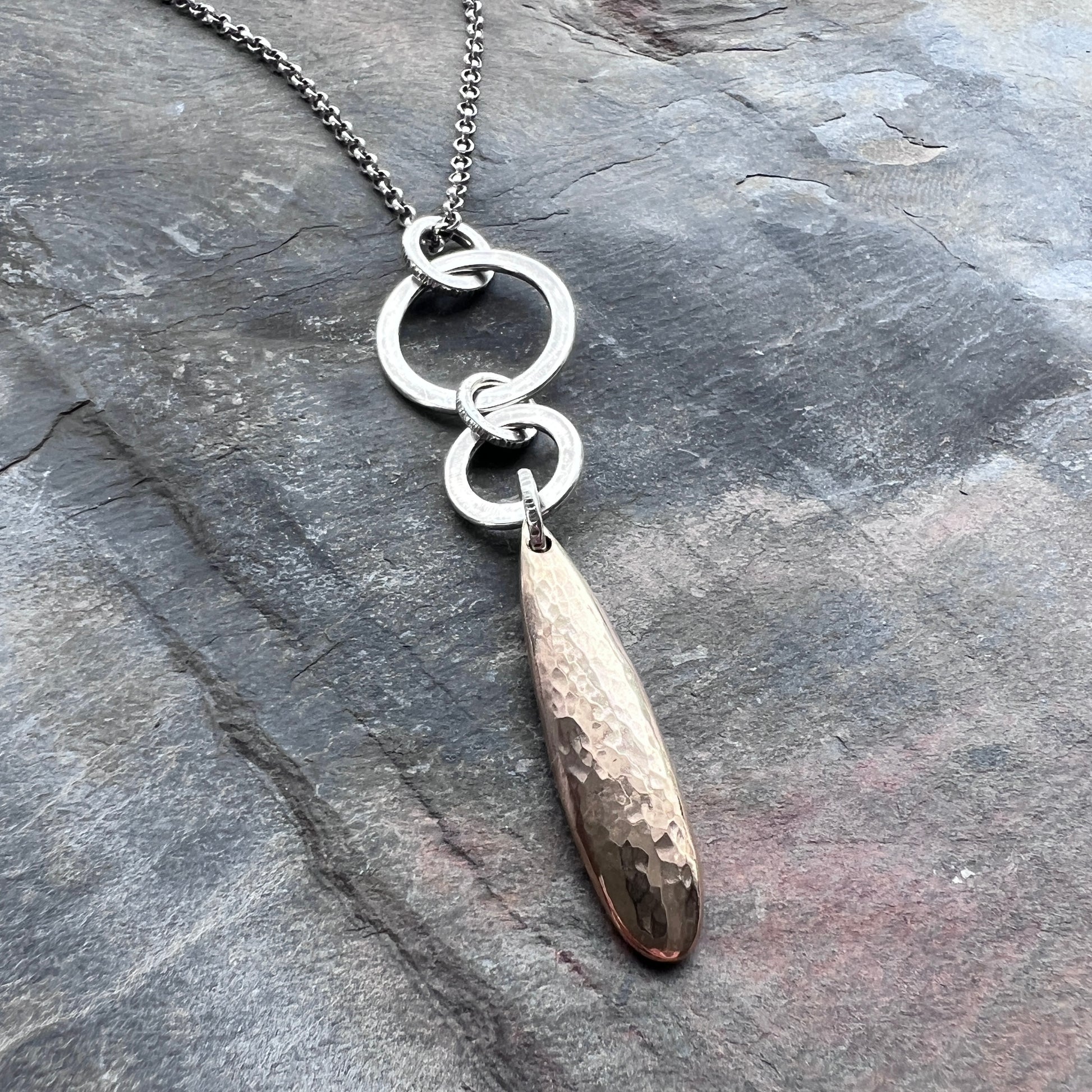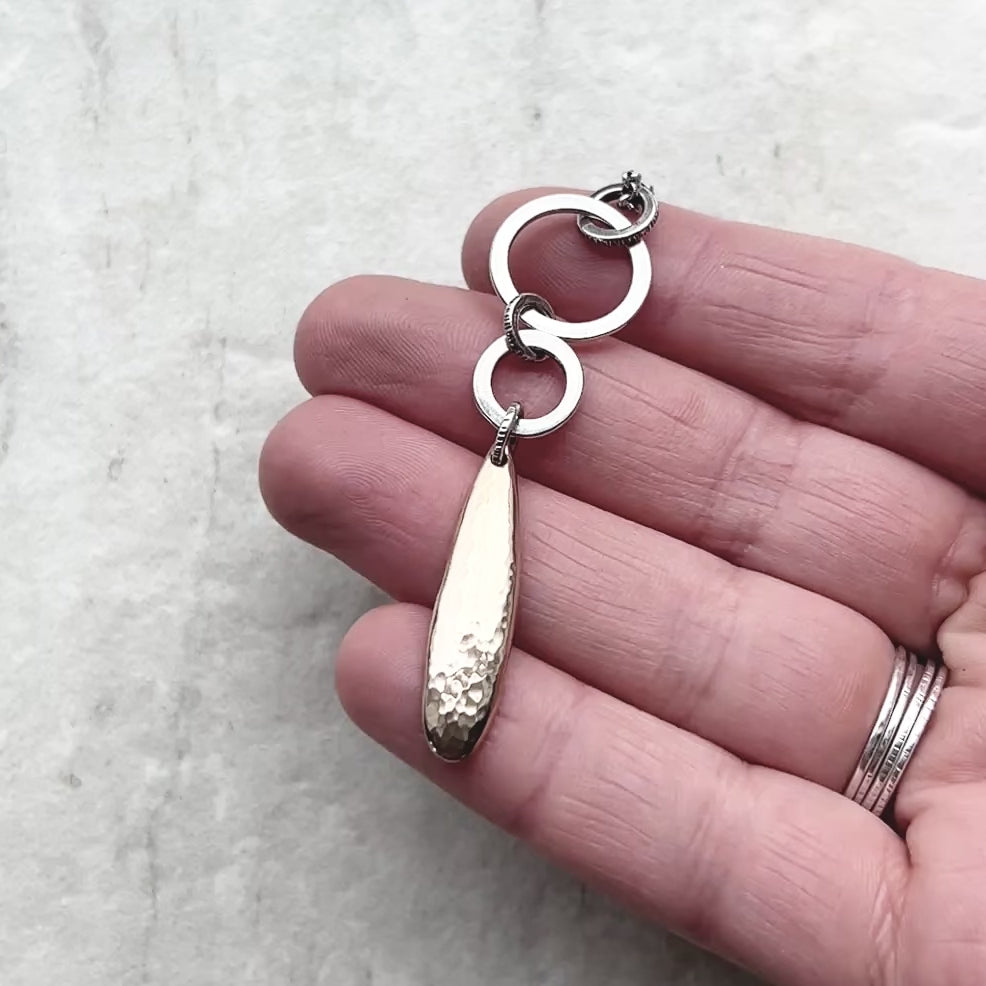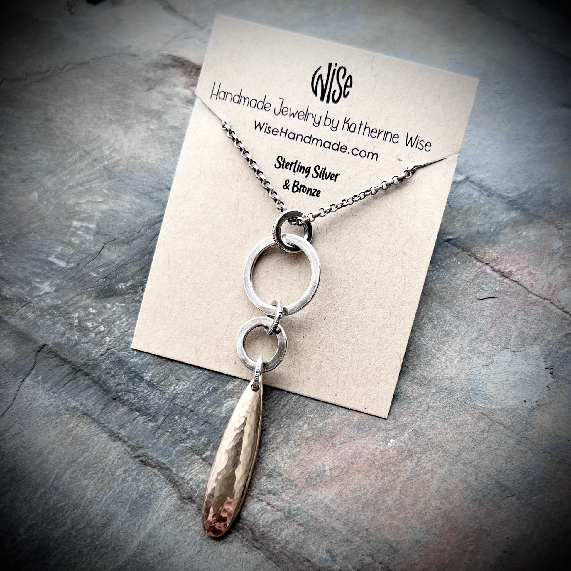 This mixed metal teardrop pendant necklace has been created entirely from sterling silver and solid bronze. At the top of the pendant is a set of sterling silver rings which I have formed and soldered by hand. Below the rings is a bronze teardrop. I hammer each elongated teardrop by hand to create a sparkling texture on front side of the teardrop. The pendant hangs from a sterling silver chain.