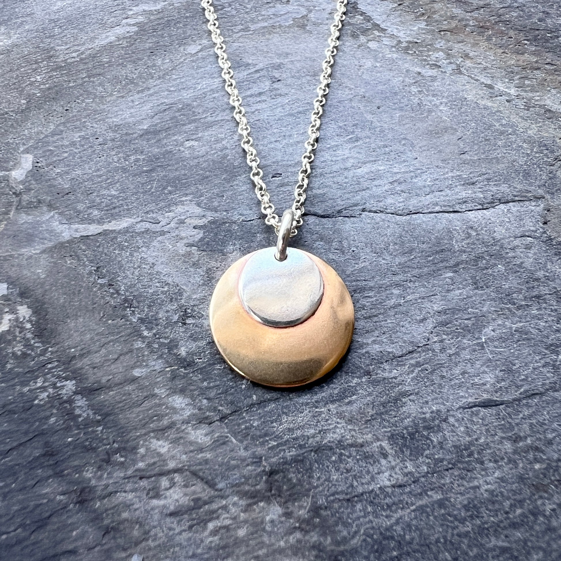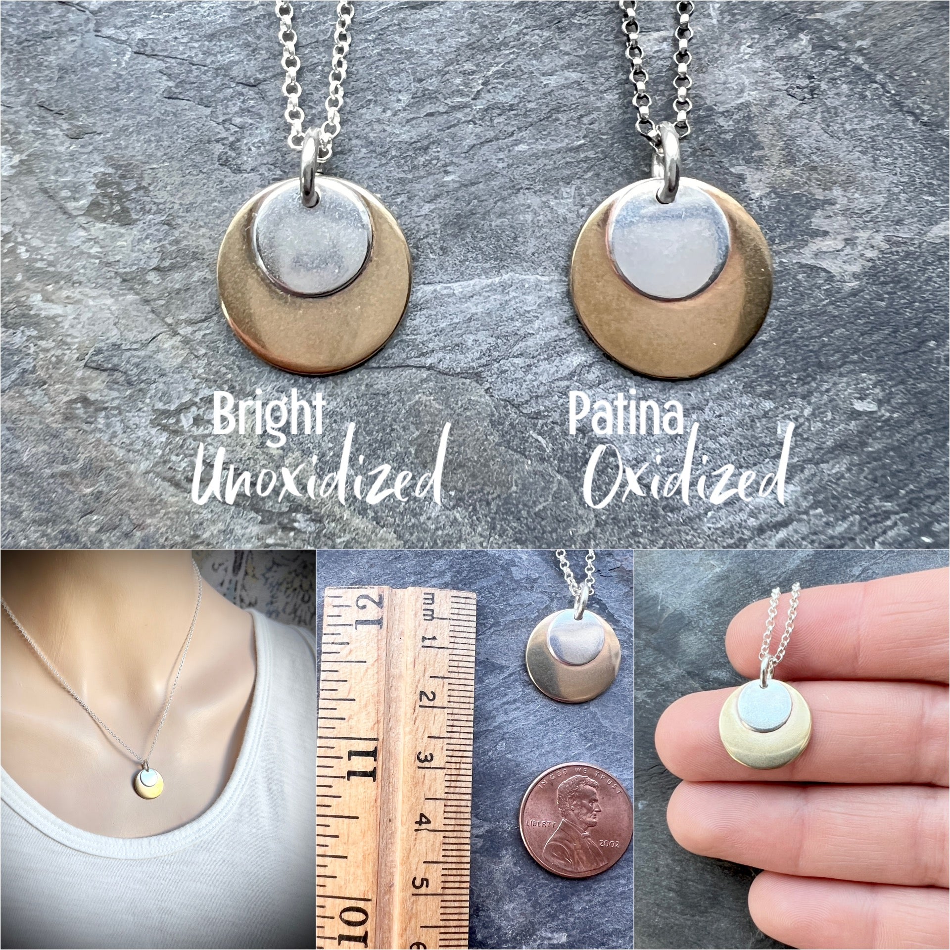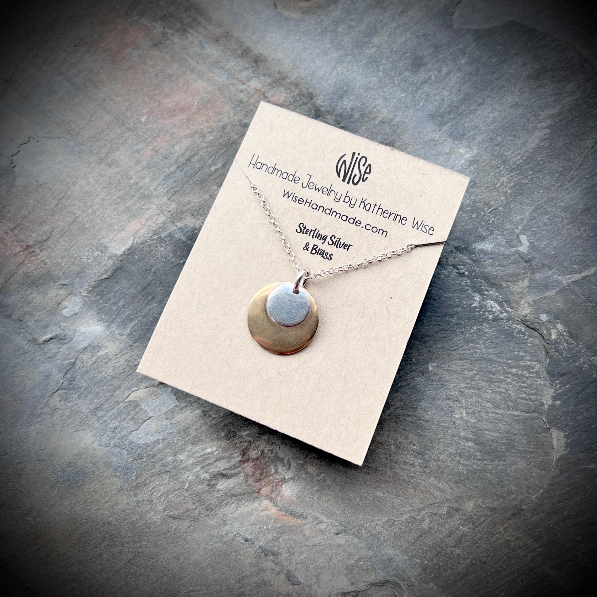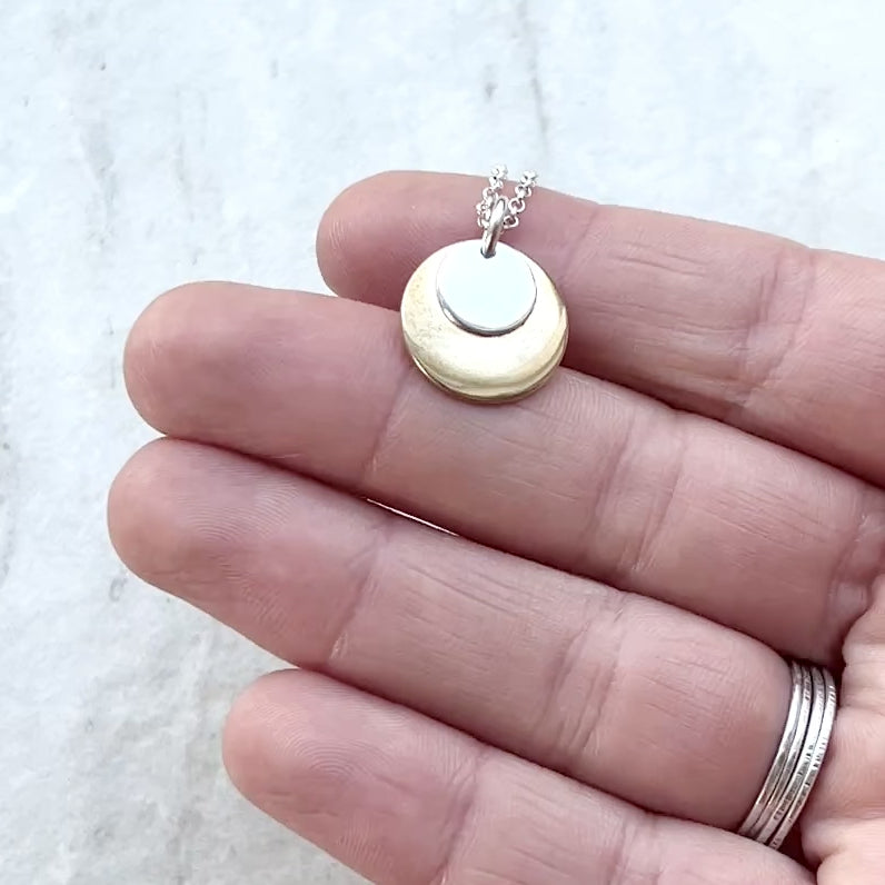 This mixed metal pendant necklace is handmade from sterling silver and golden jeweler's brass. I cut a circle from a sheet of solid silver. I then soldered the silver to a brass circle and gave the metal a light satin finish. The pendant hangs from a lightweight sterling silver chain.