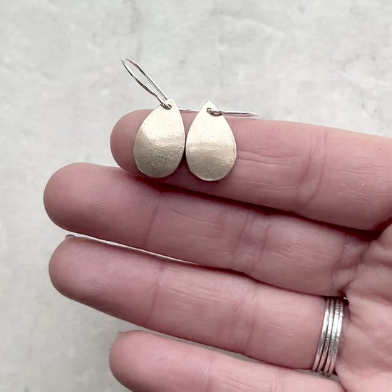 These mixed metal dangle earrings are handmade from golden bronze and solid sterling silver. I cut a pair of teardrops from a sheet of solid bronze . I then polish and finish each teardrop by hand to give the bronze an aged satin finish. The earrings dangle from handmade sterling silver earwires.