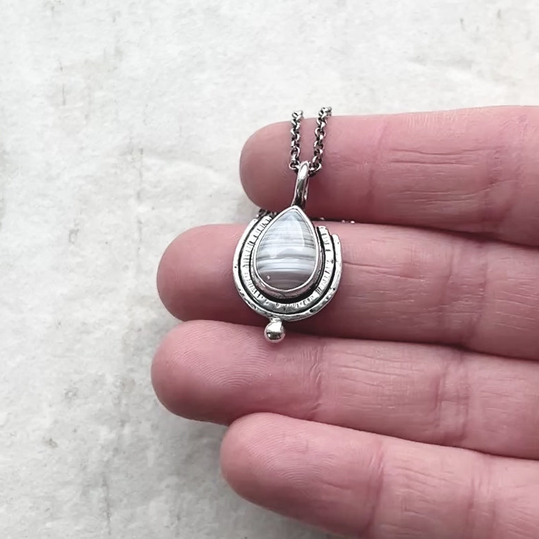 This pendant necklace design is handmade from sterling silver and natural banded agate. A genuine agate cabochon is set in sterling silver. It is accented by silver arcs and a silver ball at the bottom of the pendant. I make each unique pendant by sawing, soldering, texturing, and finishing the design entirely by hand. The silver has been oxidized and polished to create an antique patina finish.