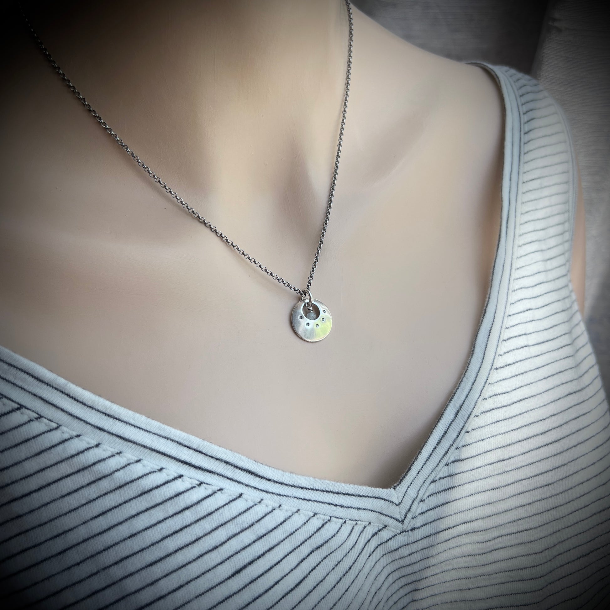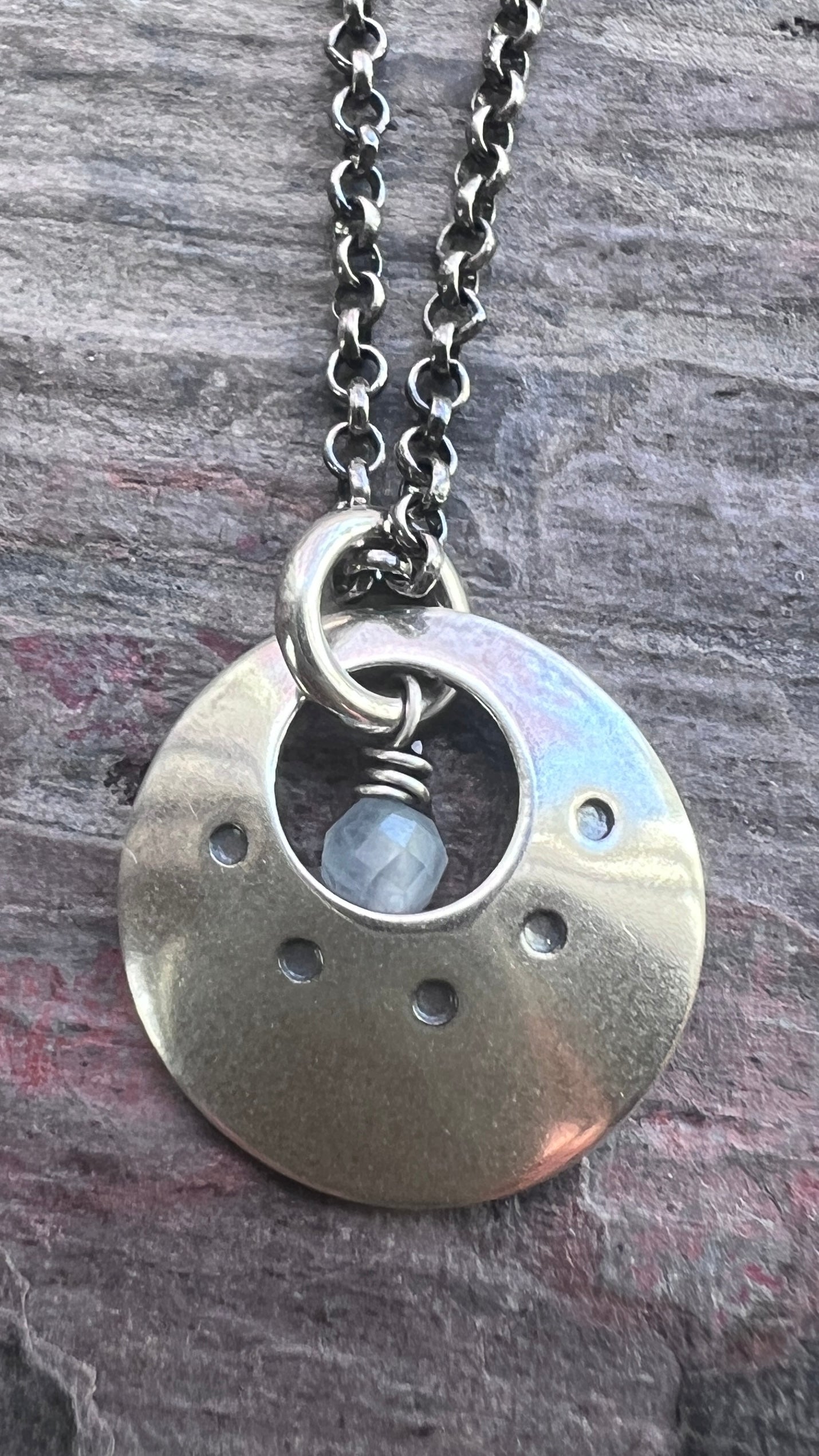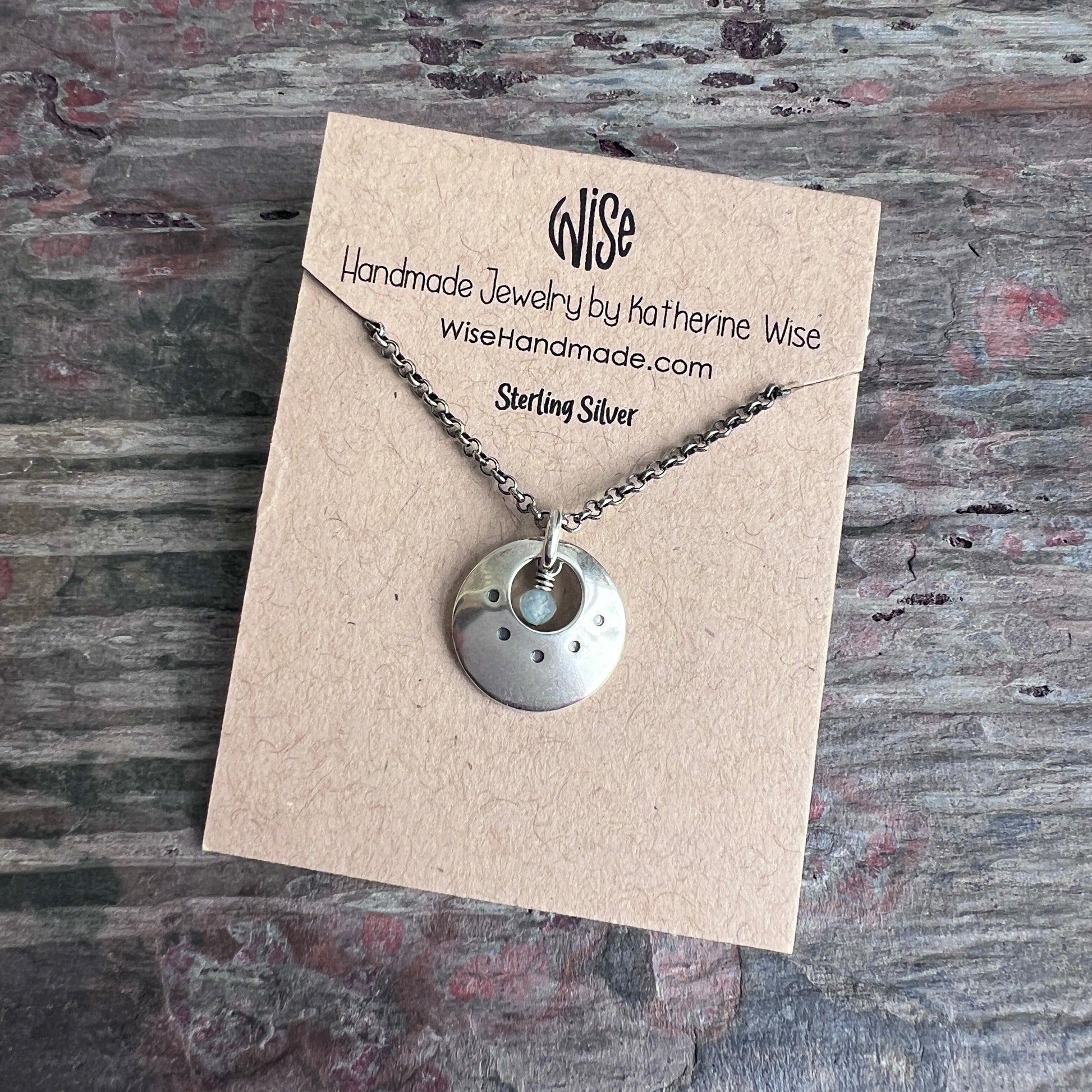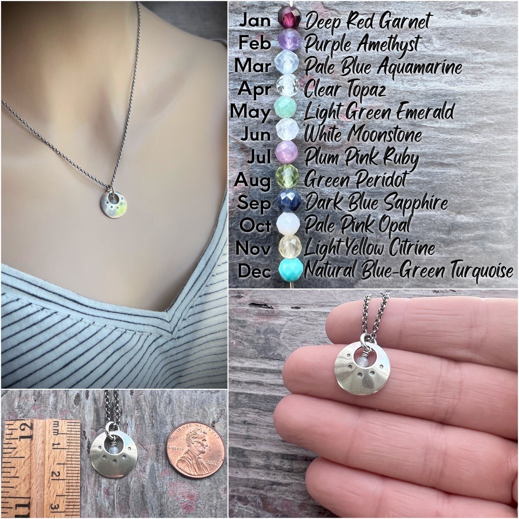 This customizable necklace is made from solid sterling silver and a genuine gem birthstone. The tiny natural gemstone is wrapped in sterling silver wire. Framing the stone is a circle which I have cut, formed, and stamped by hand. The necklace can be personalized with the birthstone of your choice. The pendant dangles from a sterling silver chain which features a lobster claw clasp and a 3-inch extender allowing the chain to be slightly adjustable. The silver has been oxidized and polished to create a light patina finish.