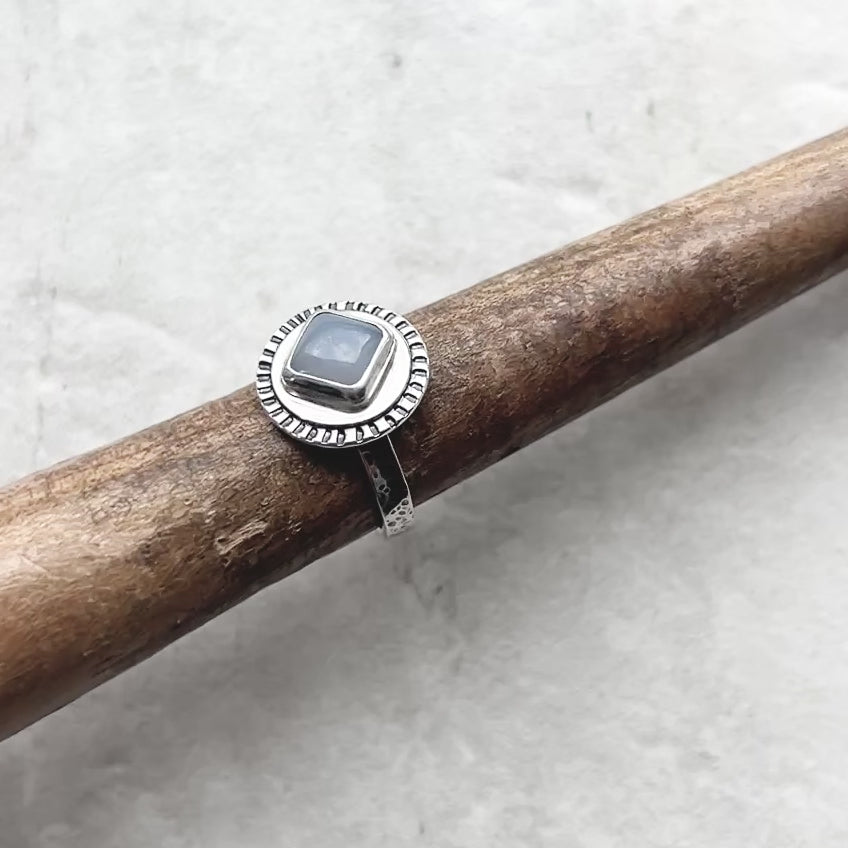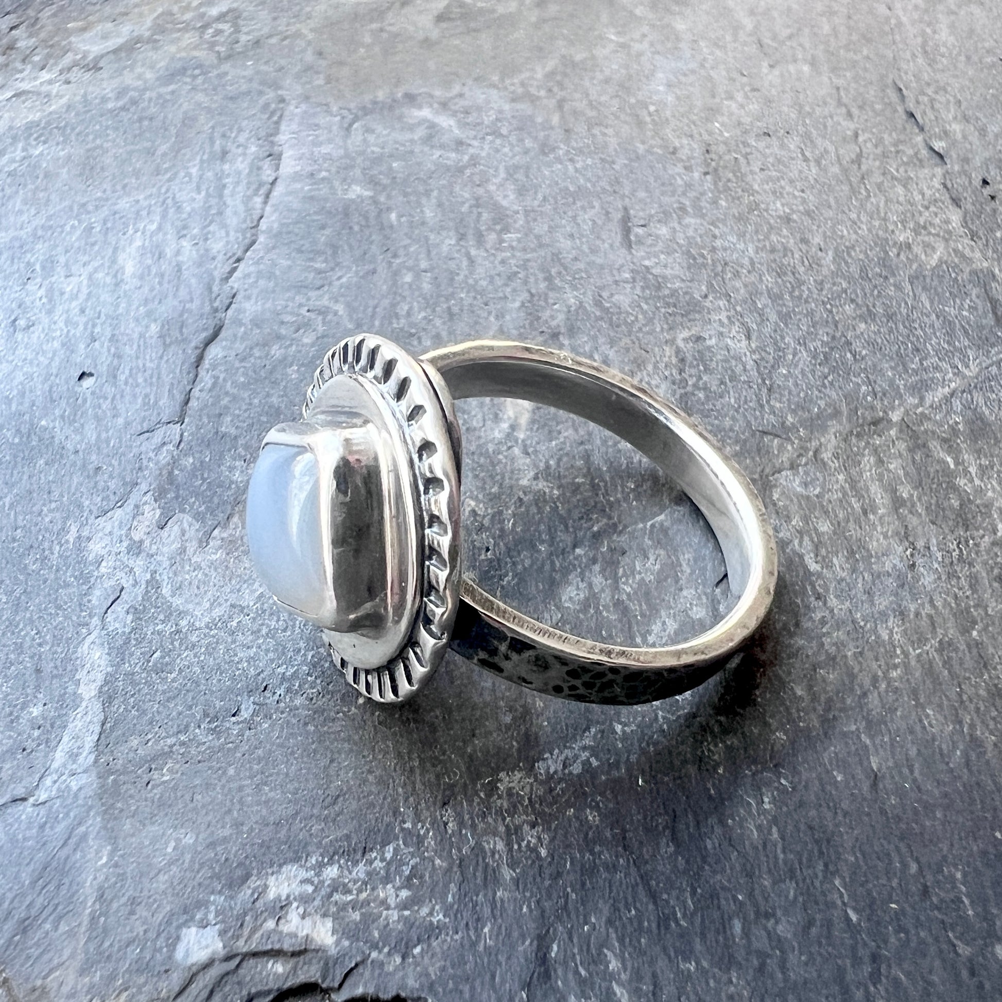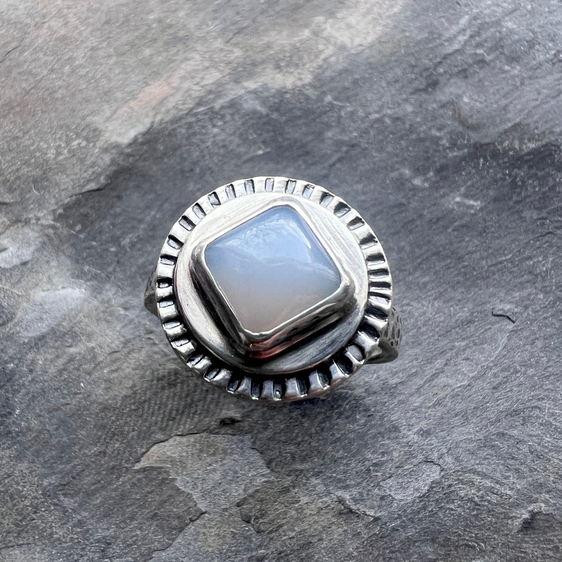 This ring is created from a genuine chalcedony cabochon and sterling silver. The square natural stone is framed by a circular silver border. The ring features a hammered sterling silver band. I have made this unique ring by forming, hammering, soldering, and finishing the piece entirely by hand. The silver has been oxidized and polished to create an antique patina finish.