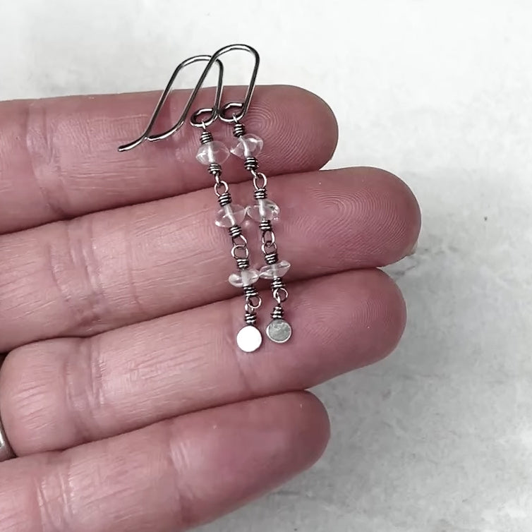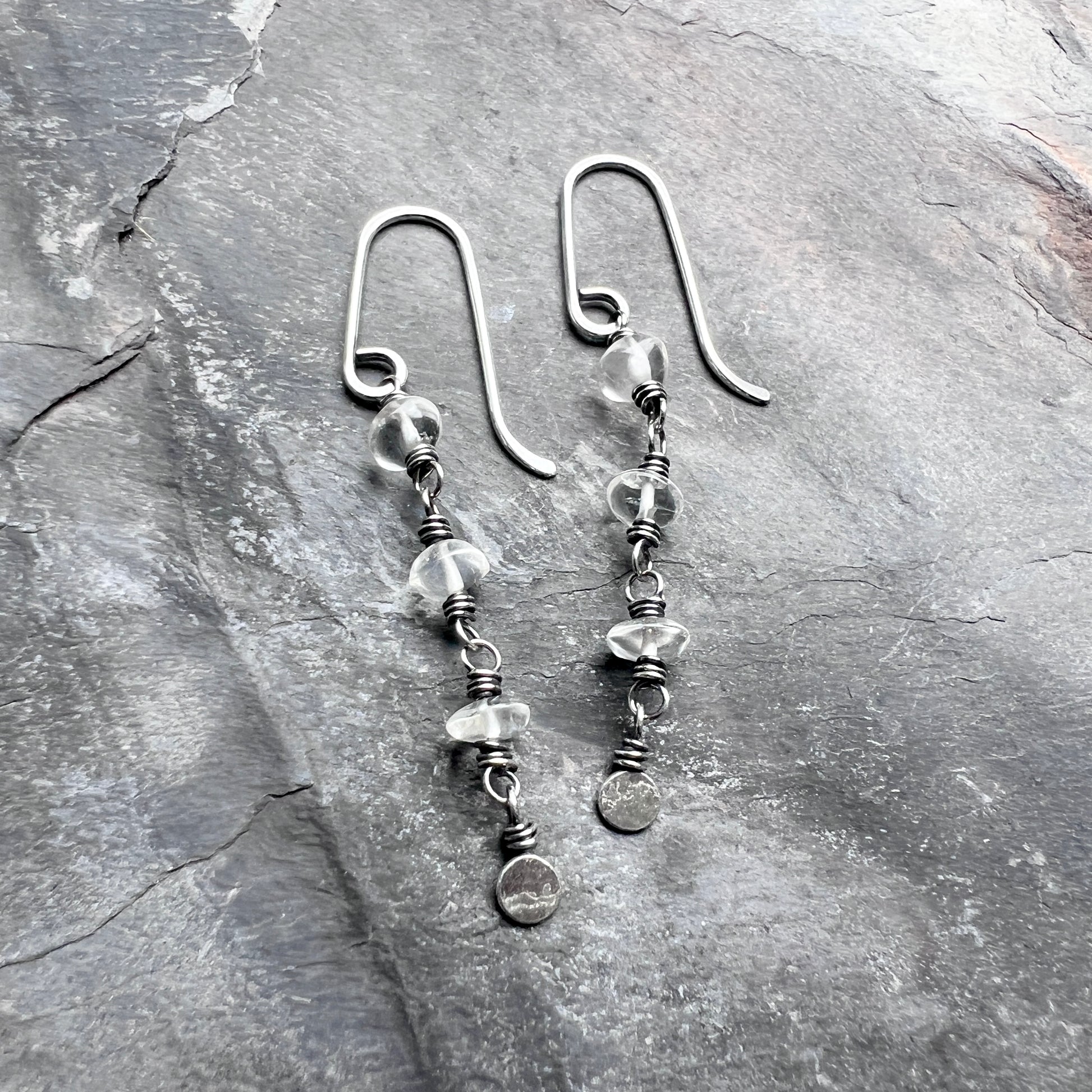 These wire-wrapped dangle earrings are handmade from genuine Citrine and sterling silver. The natural Citrine stones are almost crystal clear in color with the slightest pale yellow tint. I carefully wrap each small bead in sterling silver wire. At the bottom of each earring dangles a flattened silver pebble. The earrings hang from handformed sterling silver earwires. The silver has been oxidized and polished to create an antique patina finish.