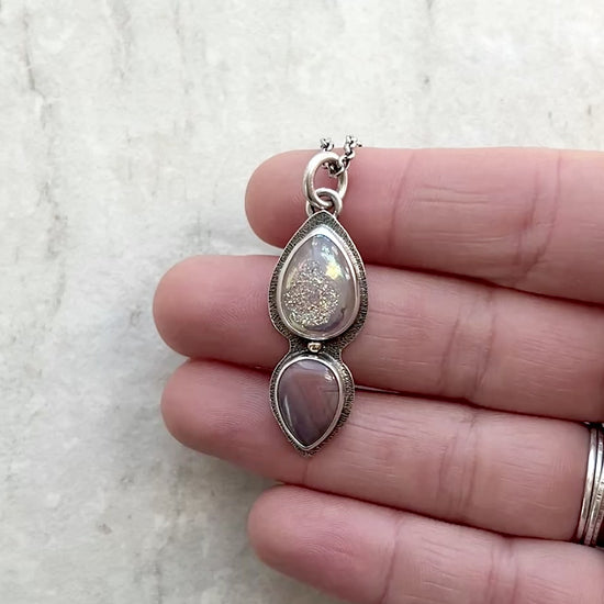 This pendant necklace design is handmade from raw druzy, banded agate, and sterling silver. The natural druzy and agate teardrop cabochons are set in sterling silver and are accented by a small granule of golden jeweler's brass. I make each unique necklace by sawing, soldering, texturing, and finishing the design entirely by hand. The silver has been oxidized and polished to create an antique patina finish.