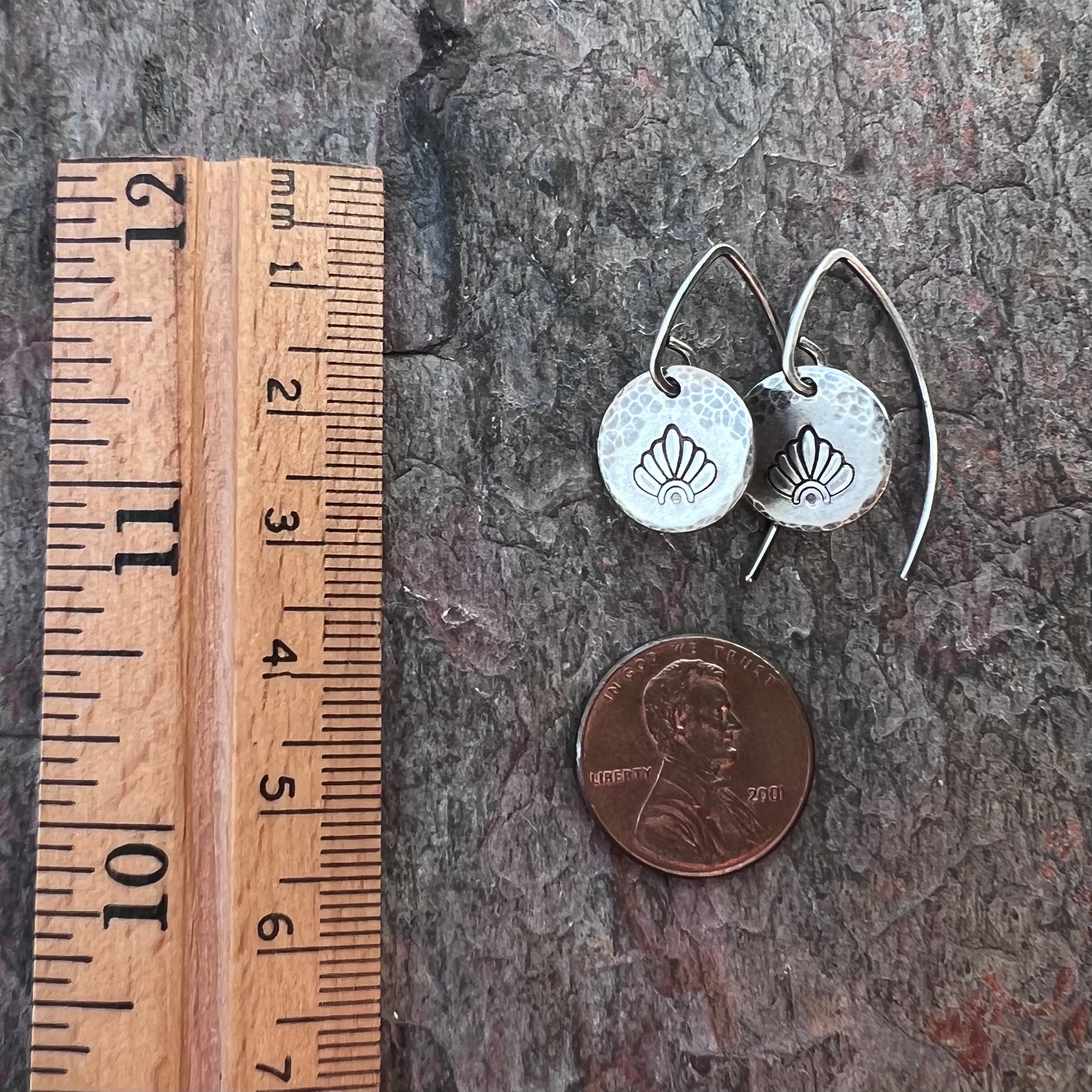 These small dangle earrings are made entirely from solid sterling silver. I have carefully cut two circular discs from a sheet of pure sterling silver. I then stamped a flower petal design and hammered the silver. These flower petal earrings dangle from handmade sterling silver earwires. The silver has been oxidized and polished to create an antique patina finish.