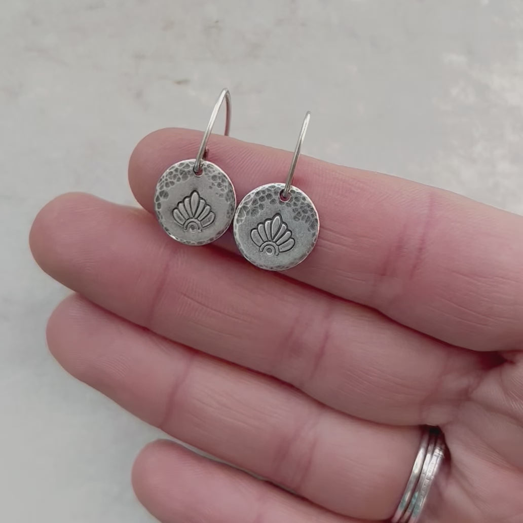 Sterling Silver Stamped Flower Petal Earrings | Small Hammered Circle Dangle Earrings
