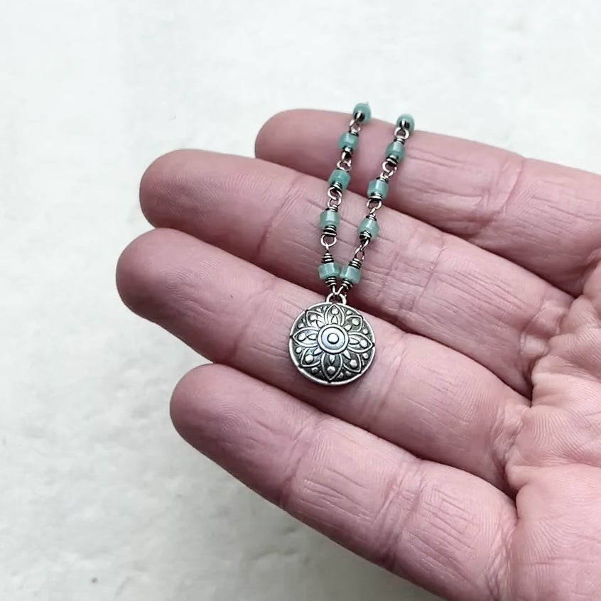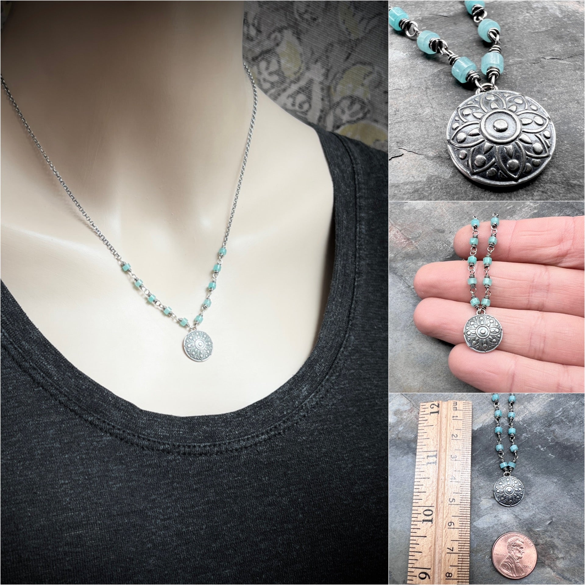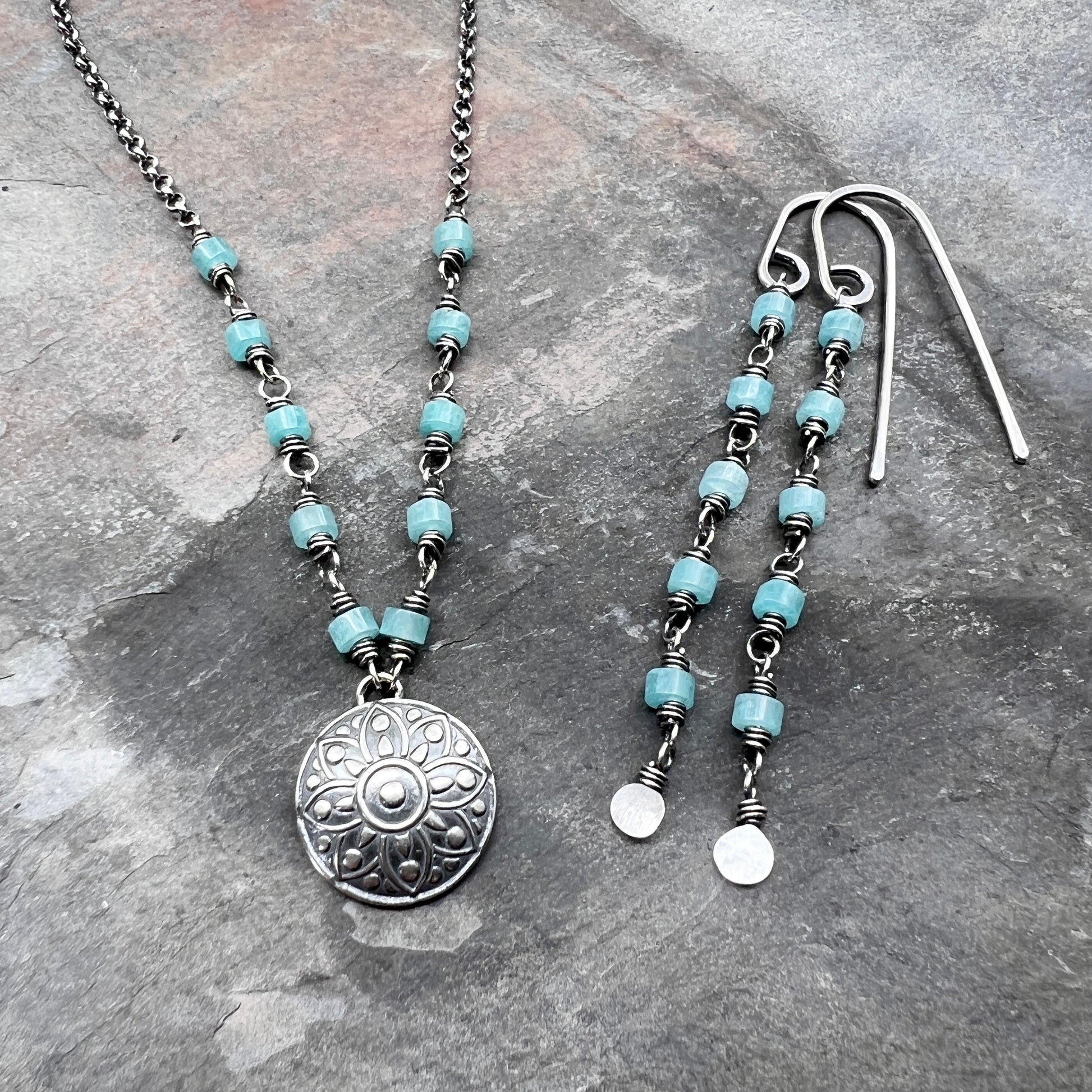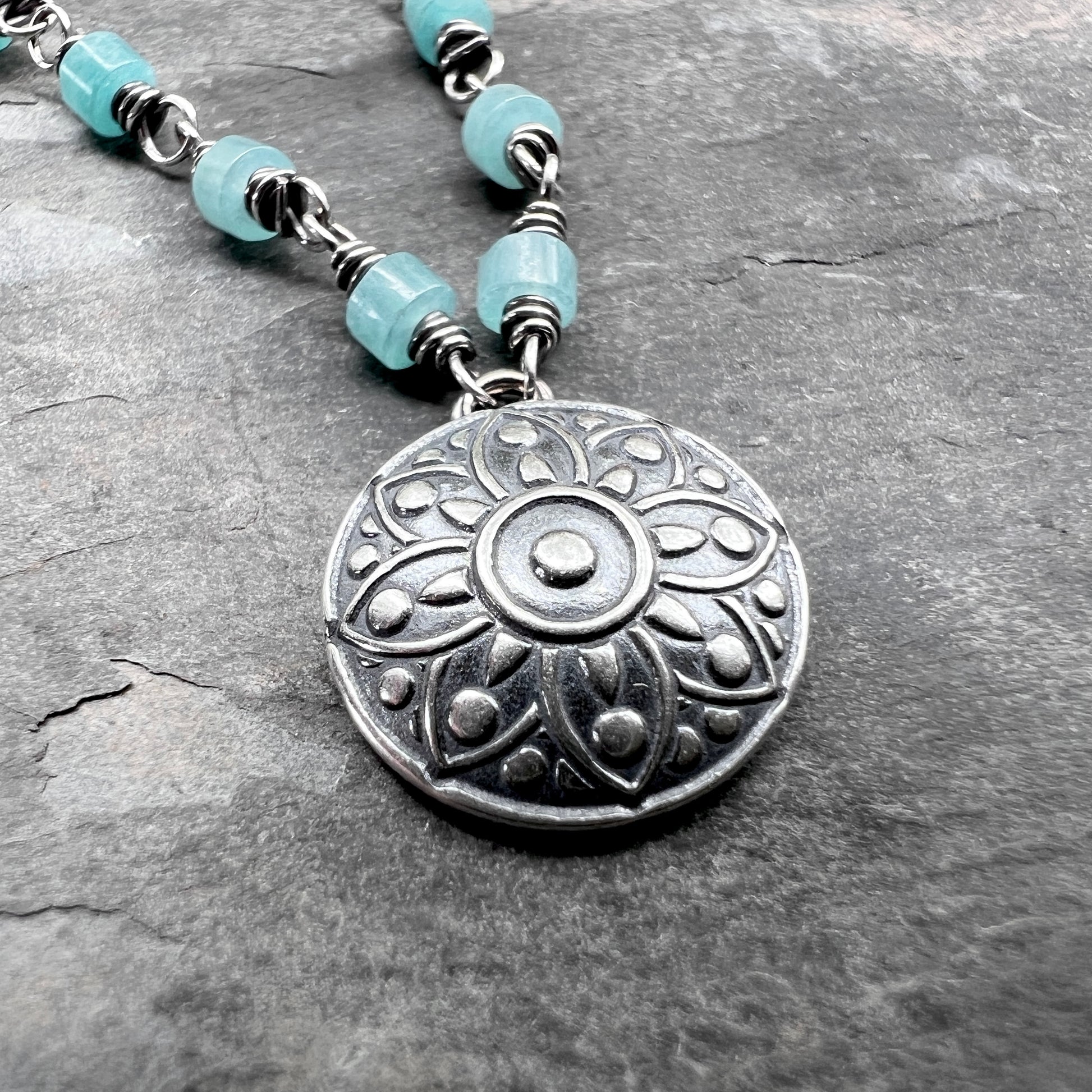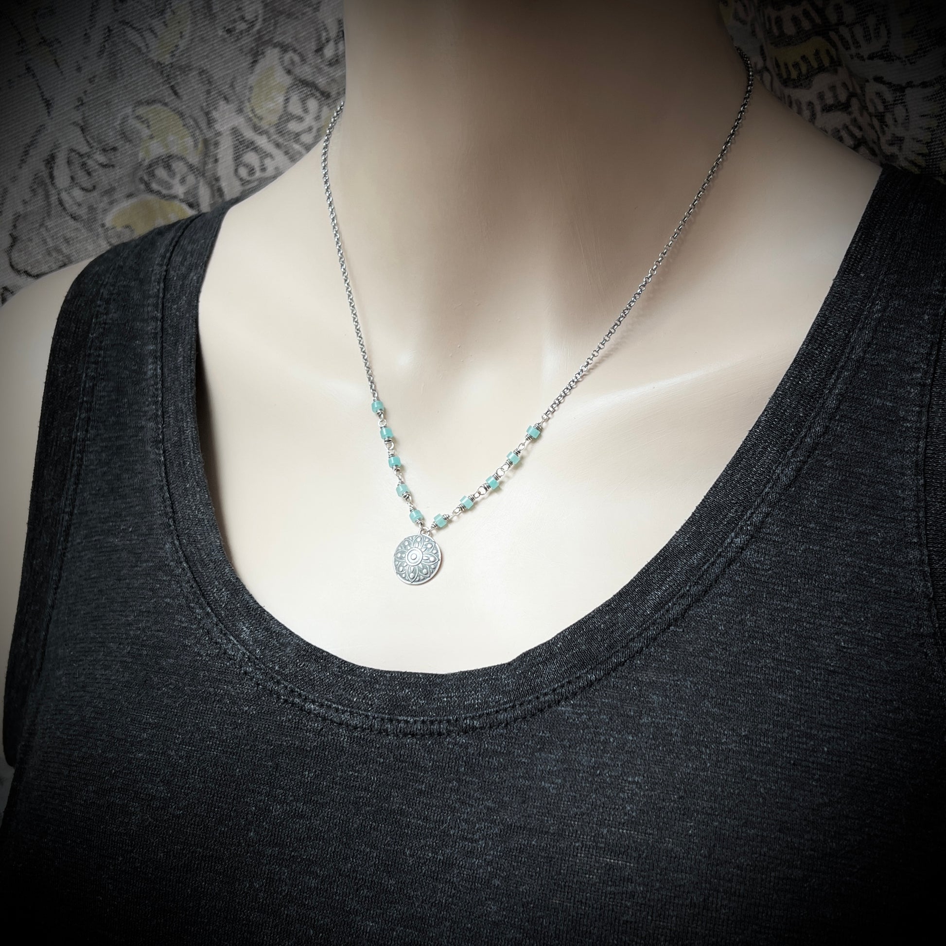 This pendant necklace is handmade from aqua Amazonite and sterling silver. I have impressed a symmetrical design into the silver to create the circular medallion pendant. Above the pendant is a set of natural Amazonite stone beads which I have carefully wrapped in sterling silver wire. The pendant and beads are suspended along a sterling silver chain which features a 3-inch extender allowing it to be slightly adjustable. The silver has been oxidized and polished to create an antique patina finish.
