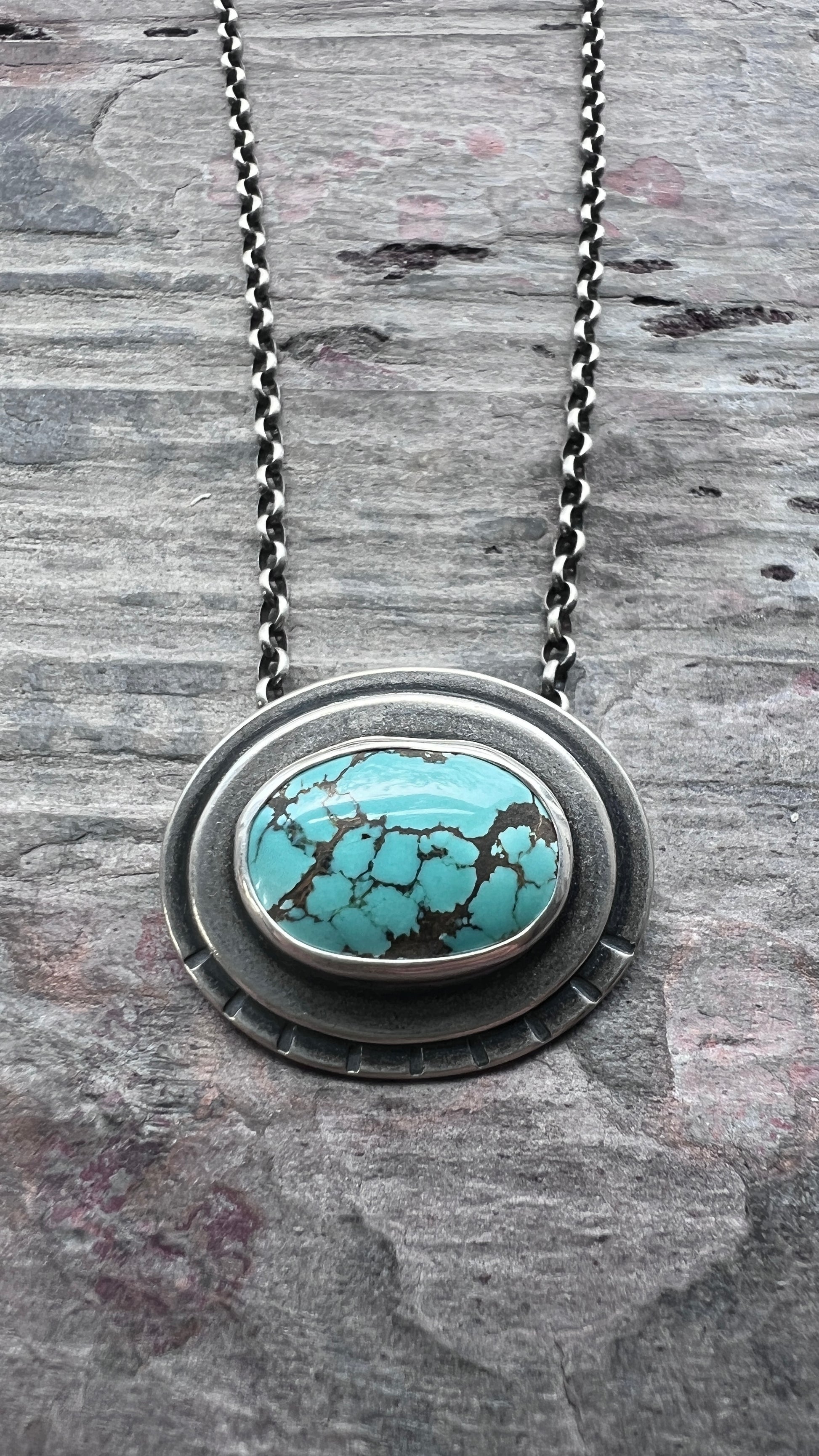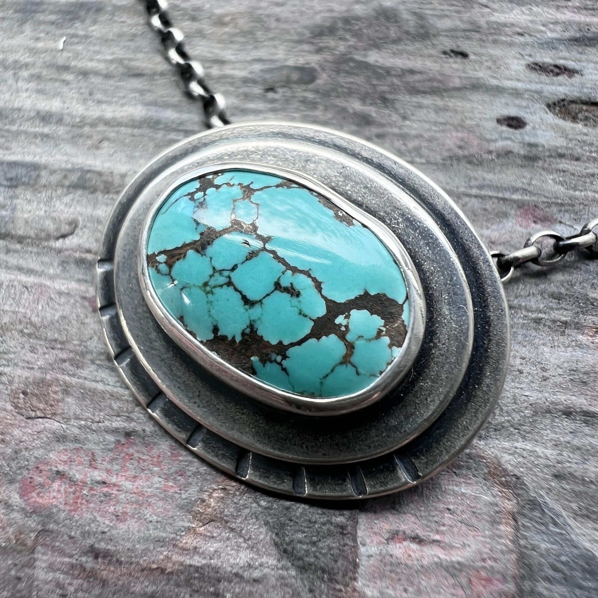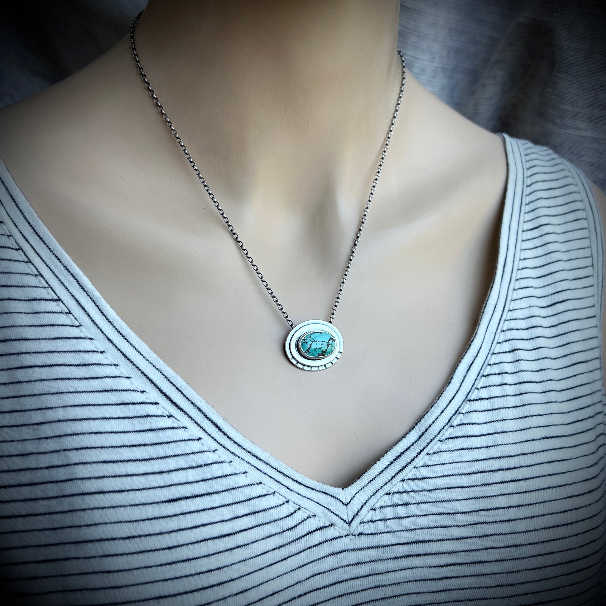 This pendant necklace is handmade from genuine turquoise and sterling silver. The natural stone cabochon is framed by two layers of silver. It is accented by a series of hand stamped lines. Each unique pendant has been formed, soldered, textured, and finished entirely by hand. I have oxidized and polished the silver to create an antique patina finish.