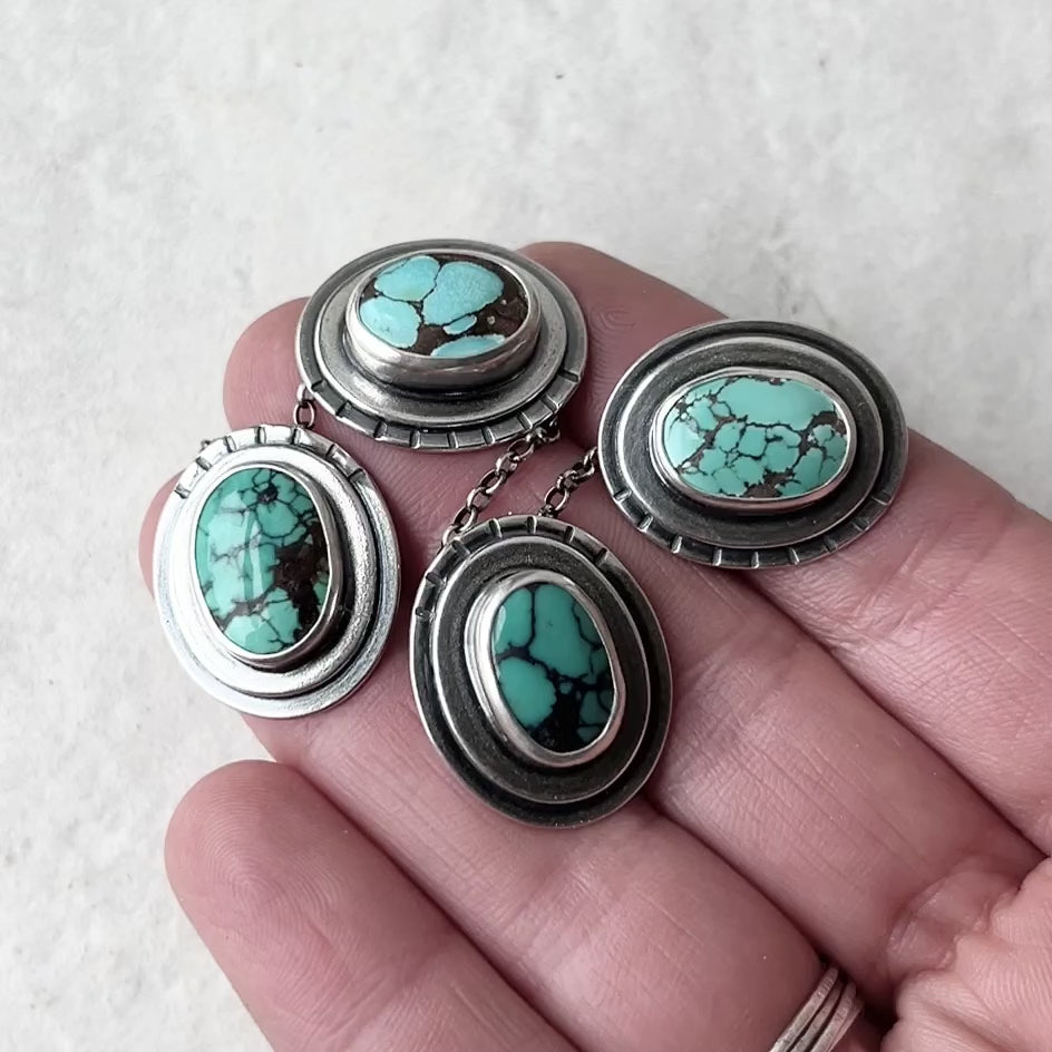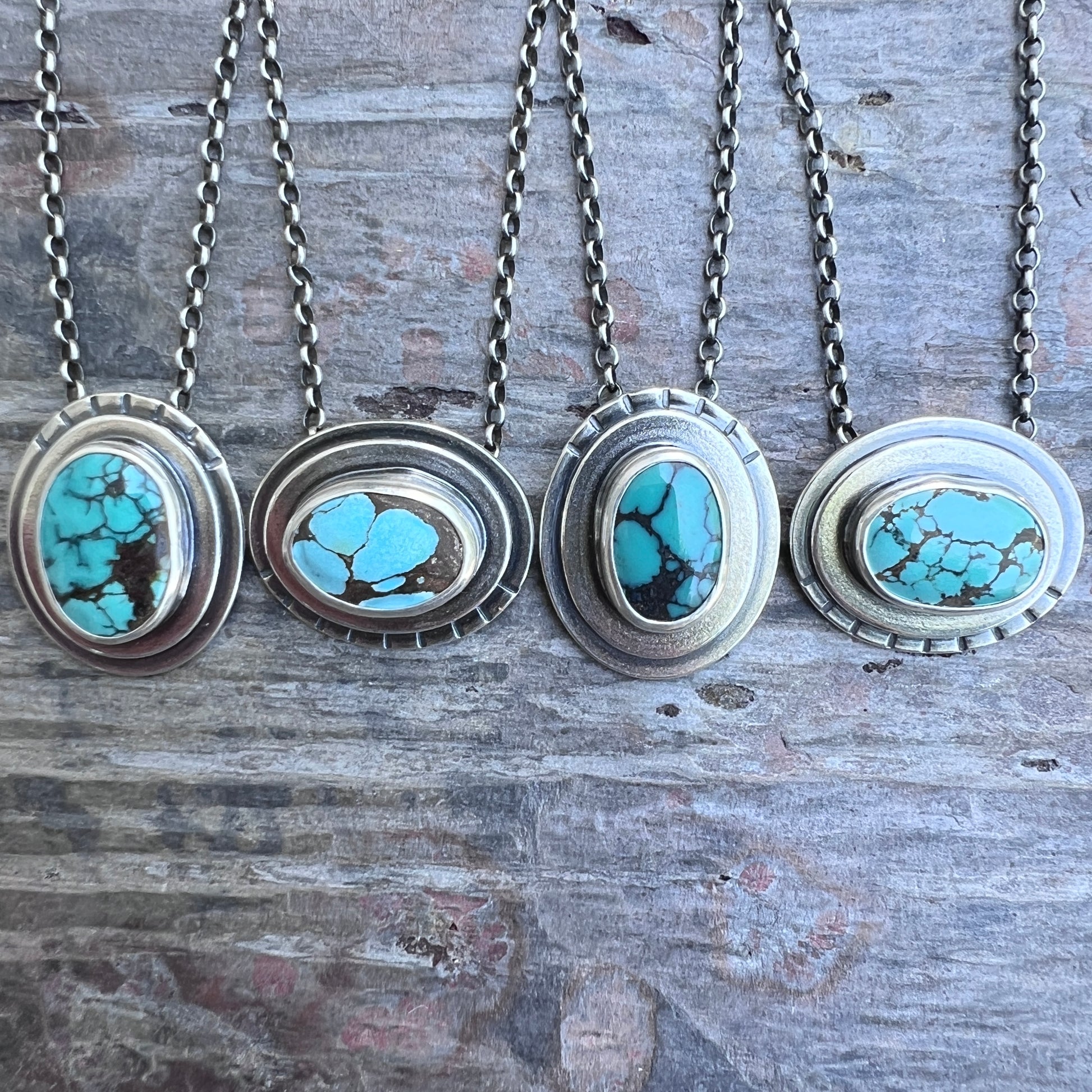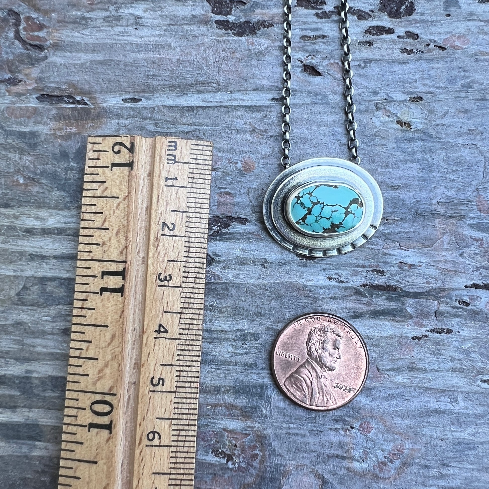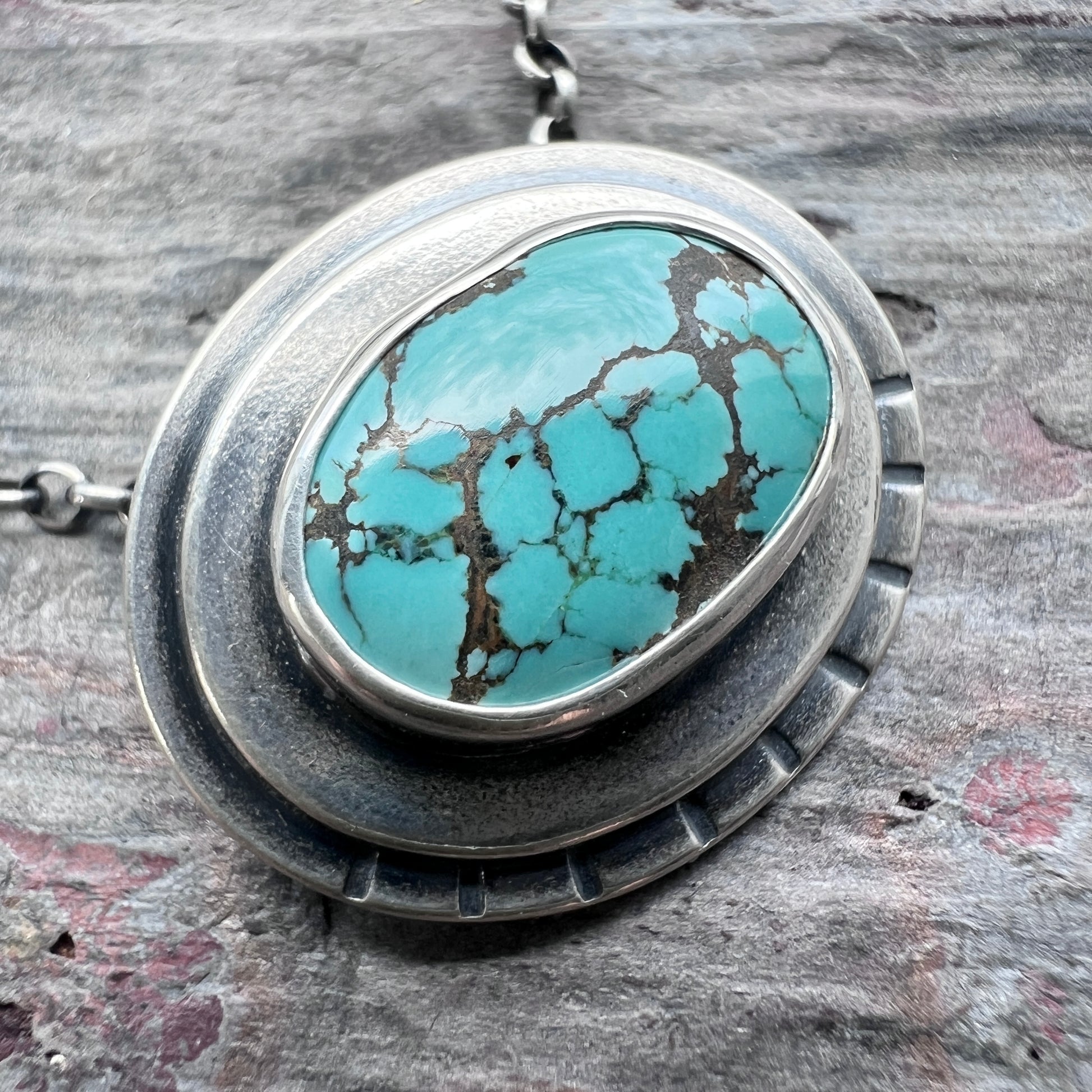 This pendant necklace is handmade from genuine turquoise and sterling silver. The natural stone cabochon is framed by two layers of silver. It is accented by a series of hand stamped lines. Each unique pendant has been formed, soldered, textured, and finished entirely by hand. I have oxidized and polished the silver to create an antique patina finish.
