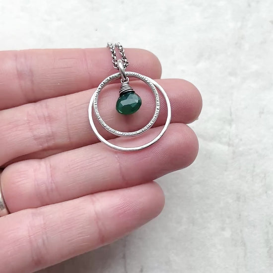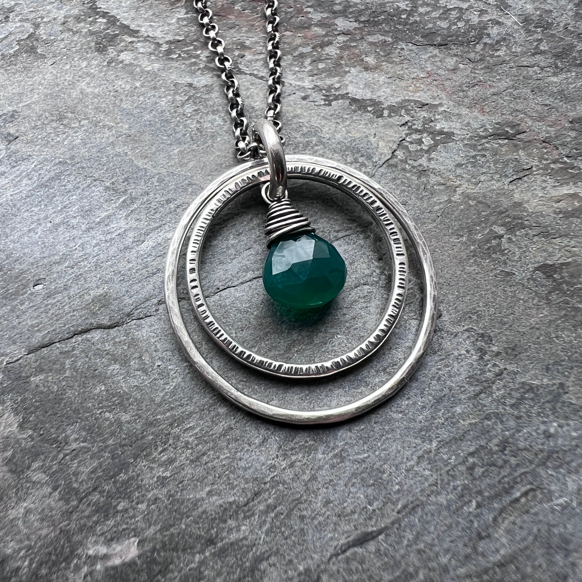 Sterling Silver Green Onyx Necklace | Emerald Green Stone in Hammered Rings Pendant