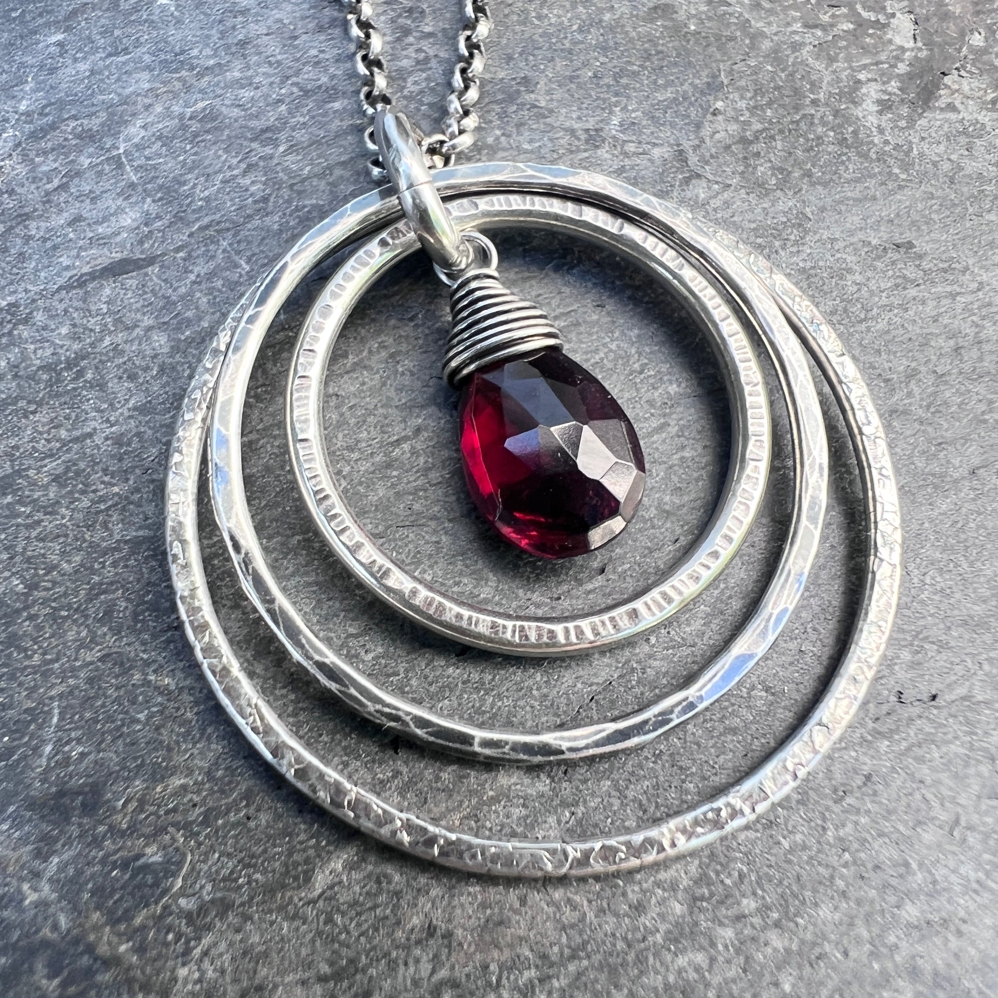 Genuine Garnet Sterling Silver Necklace | Deep Red Teardrop in Hammered Rings Pendant