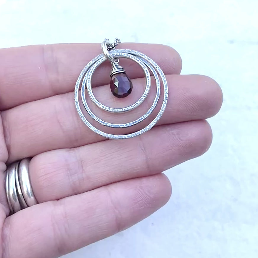 Surrounding the natural gemstone are silver rings which I have formed, soldered, and hammered by hand. I have used a series of different hammers to give each ring its own unique texture. The pendant hangs from a sterling silver chain which features a 3-inch extender allowing it to be slightly adjustable.