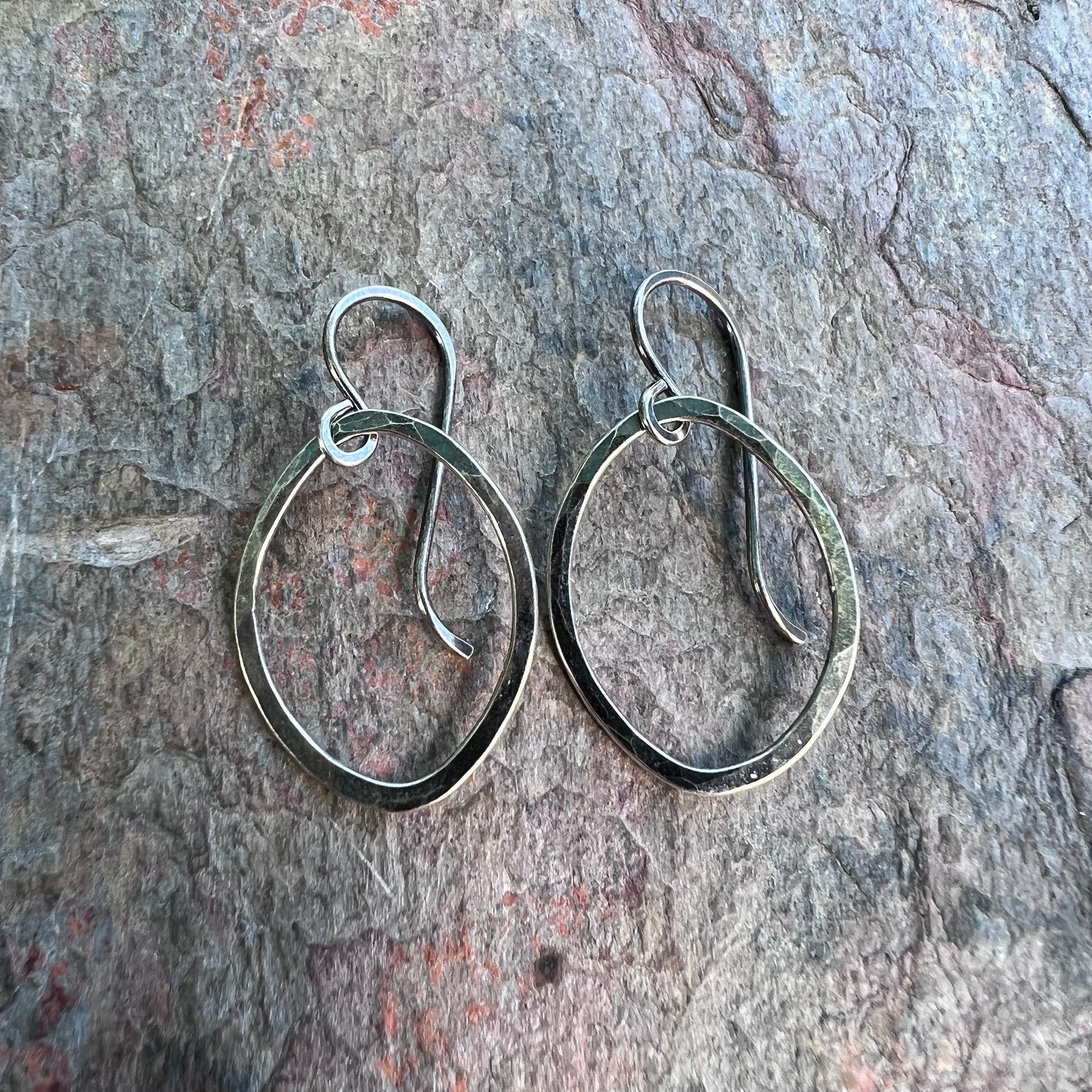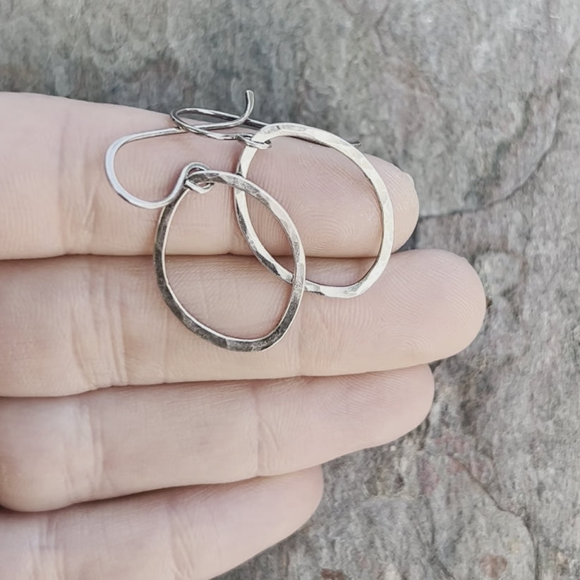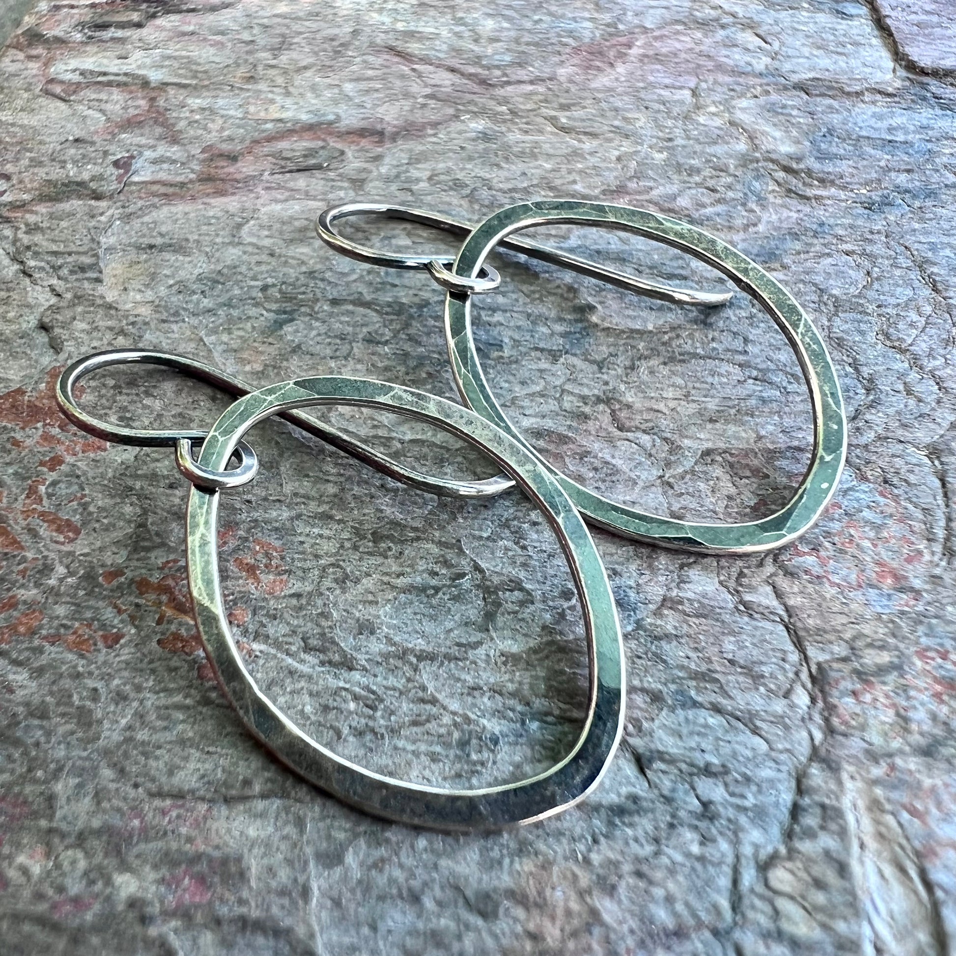 Two freeform organic ovals are created from solid sterling silver. I have carefully formed, soldered, and hammered each oval by hand. The earrings hang from handmade sterling silver earwires.