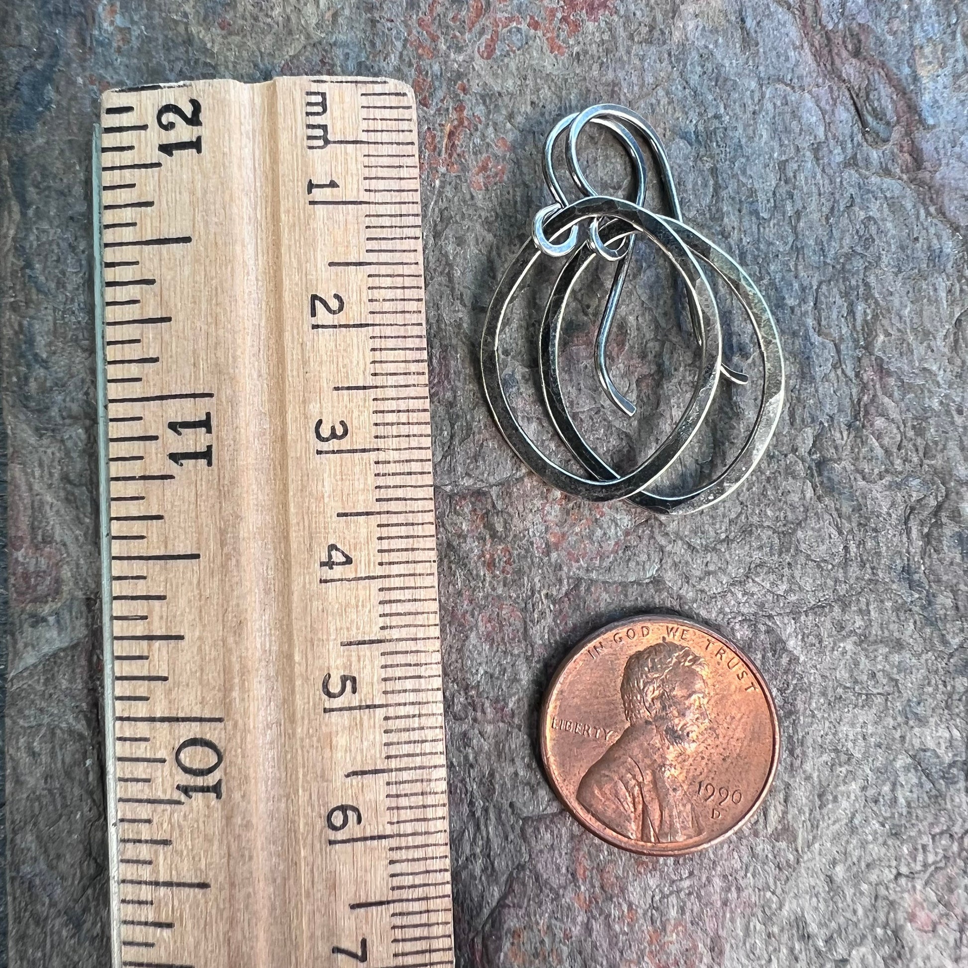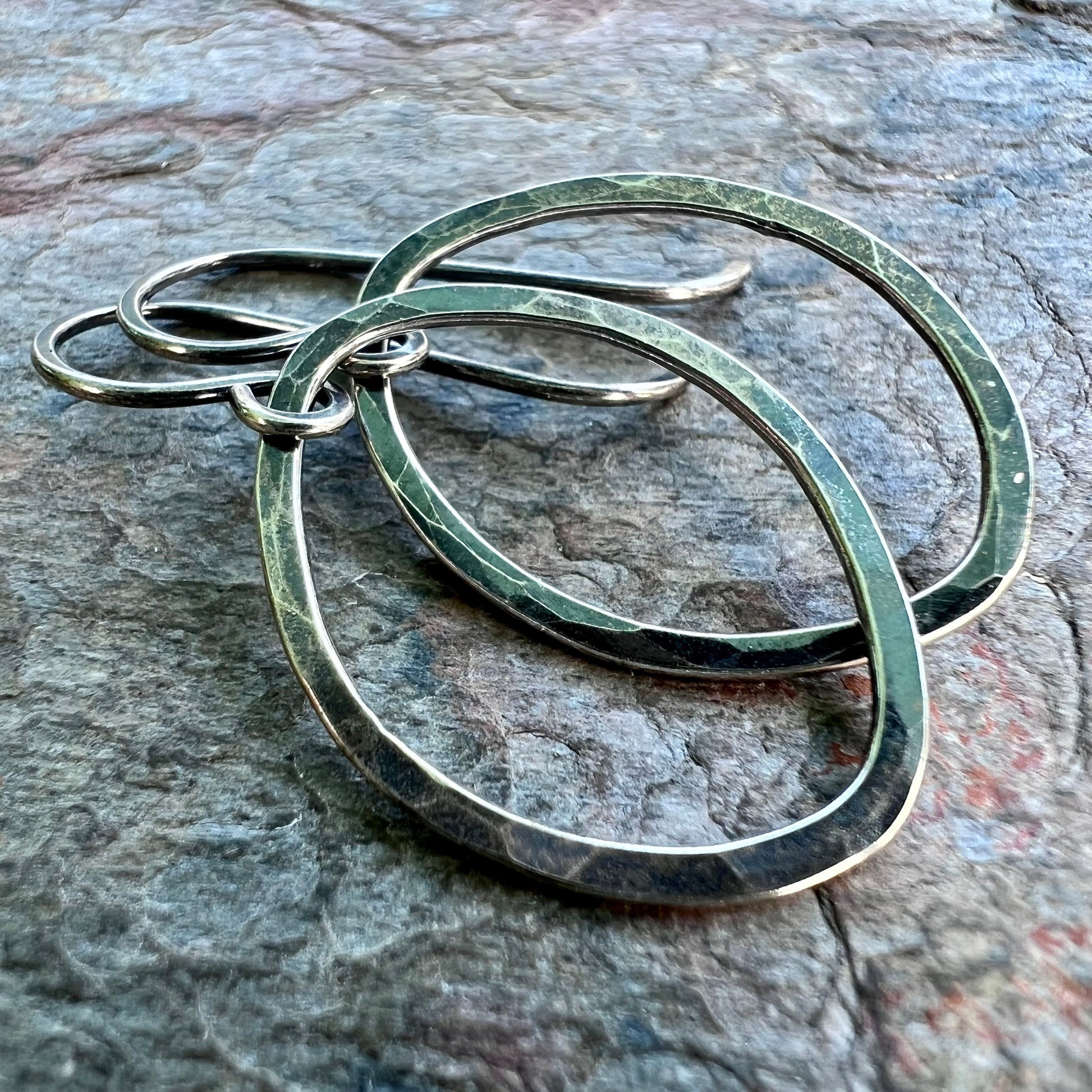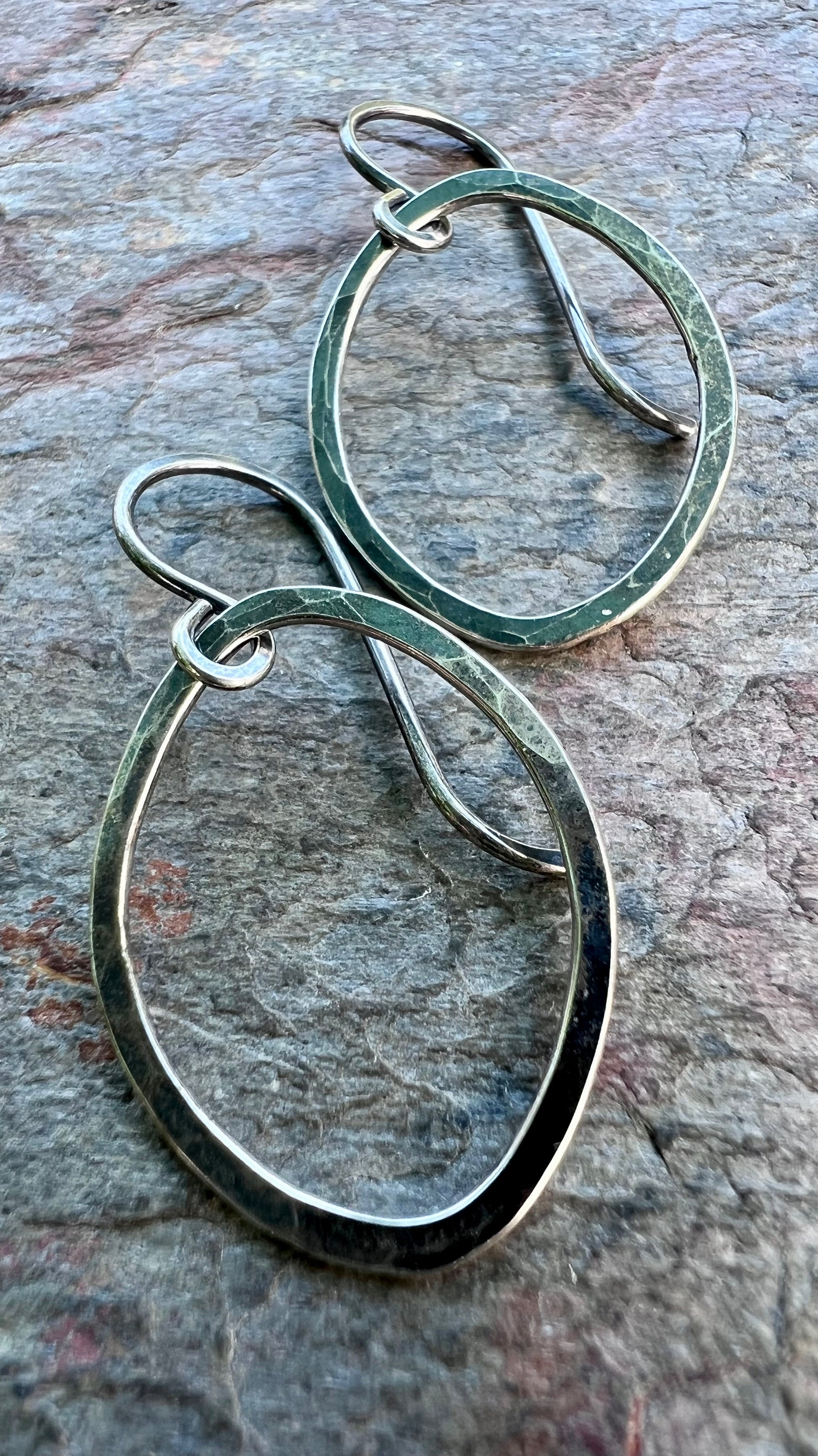 Two freeform organic ovals are created from solid sterling silver. I have carefully formed, soldered, and hammered each oval by hand. The earrings hang from handmade sterling silver earwires.