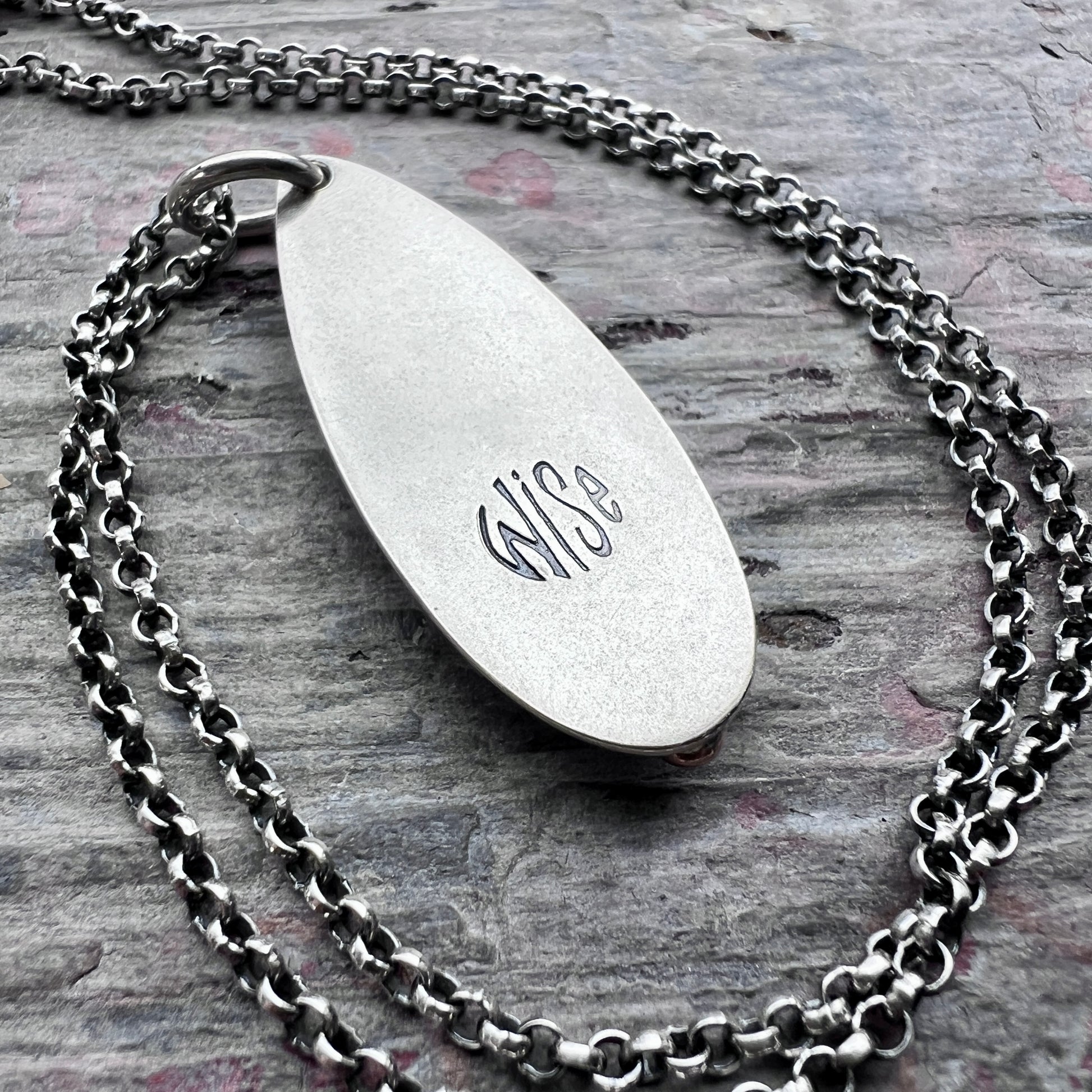 The pendant hangs from a sterling silver chain. The chain features a lobster claw clasp and a 3-inch extender allowing it to be slightly adjustable. Select your desired length when ordering. Note that the total length is measured from end-to-end and includes all parts of chain and clasp.