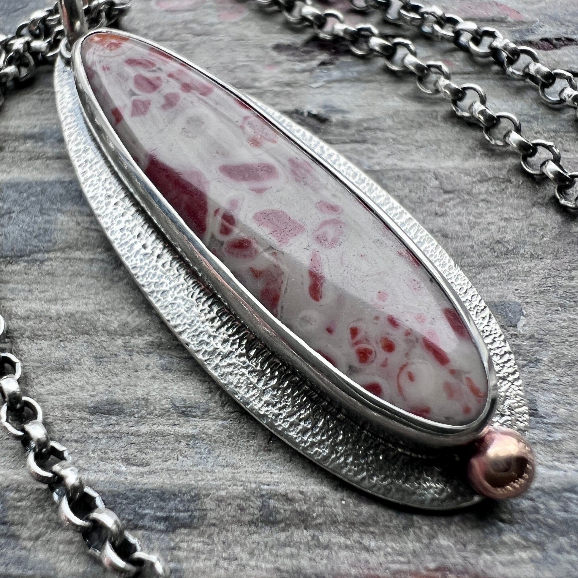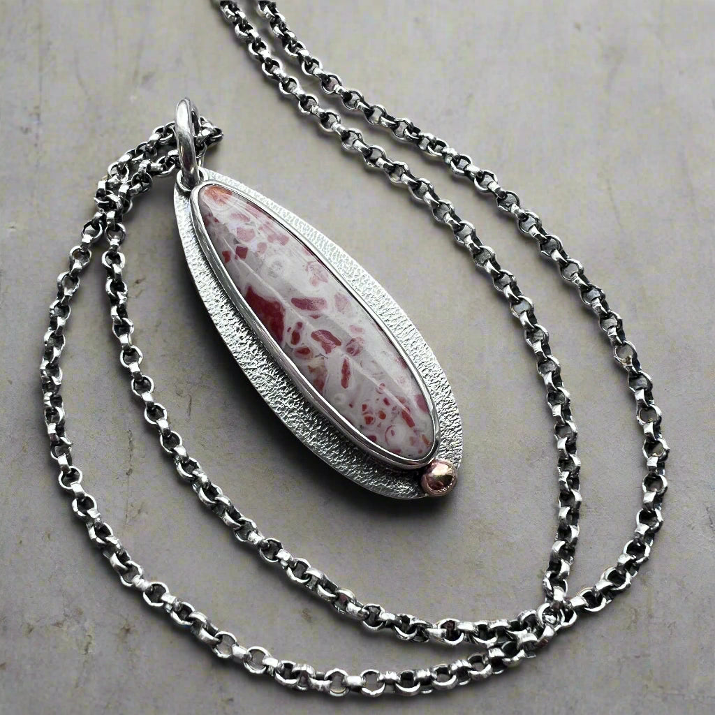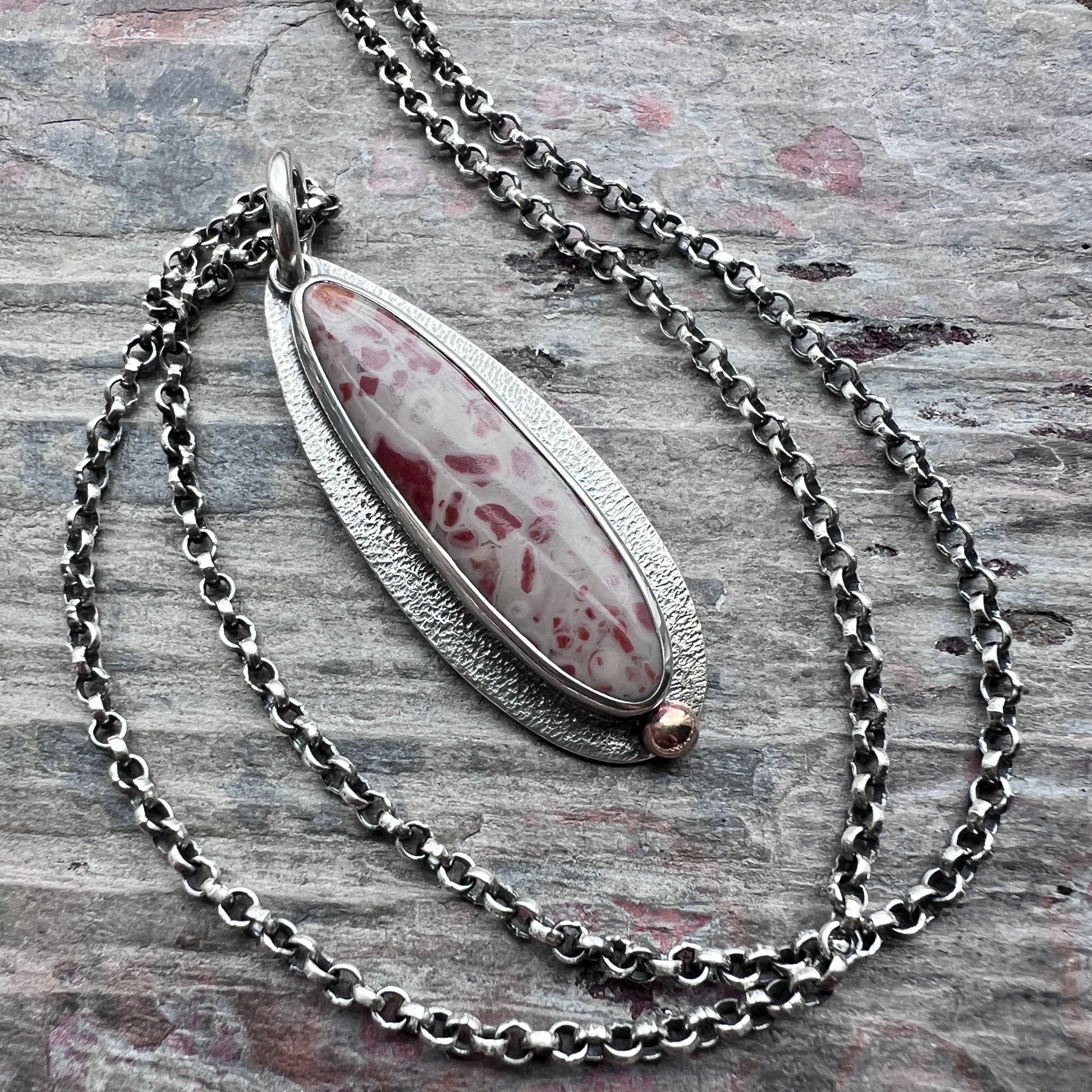 This pendant necklace is handmade from sterling silver and natural jasper. A jasper teardrop cabochon is set in sterling silver. This type of jasper is known as "leopard skin jasper" due to its spotted patterns. The teardrop is accented by a small granule of golden jeweler's grade brass. I create this unique style by sawing, soldering, and finishing the design entirely by hand. The silver has been oxidized and polished to create an antique patina finish.