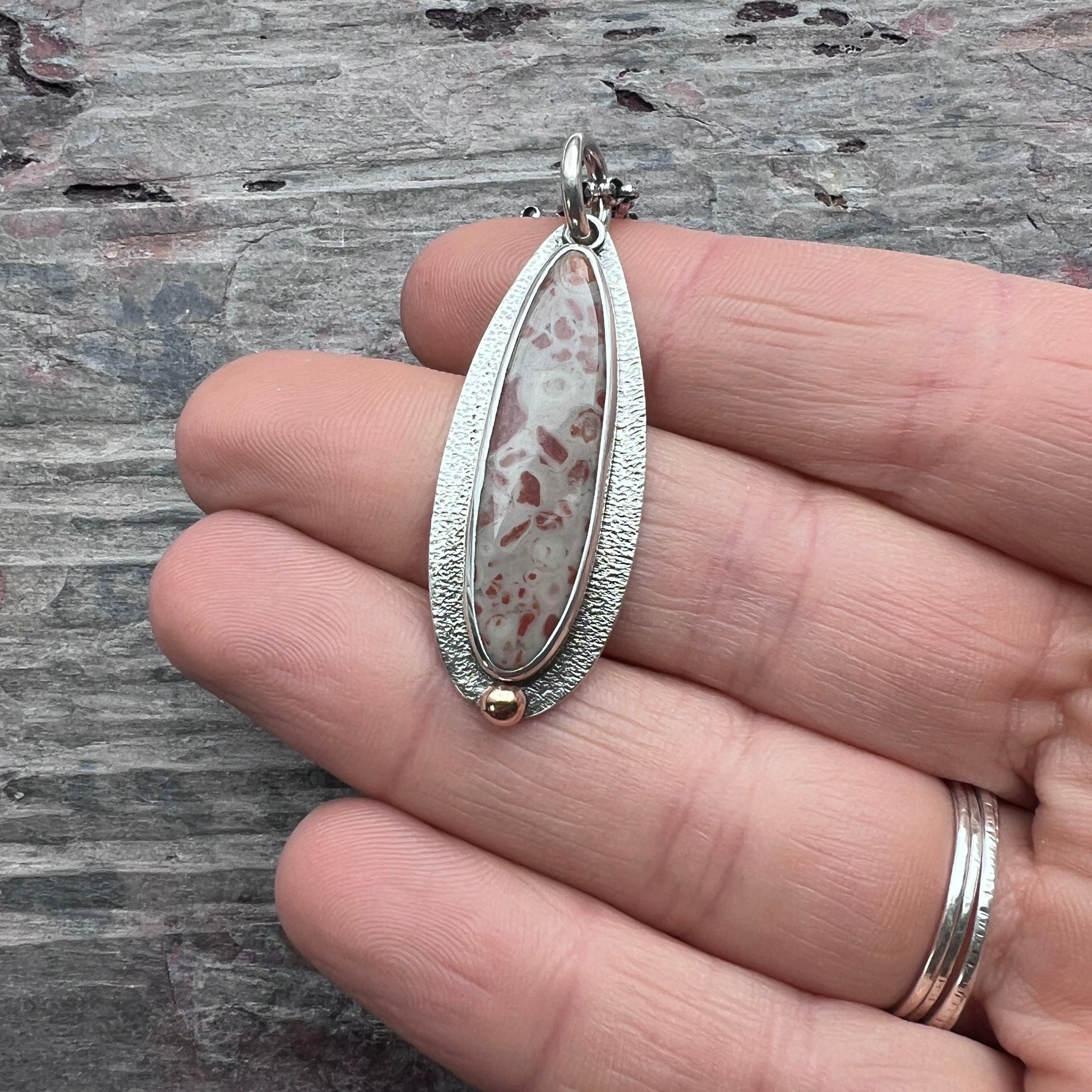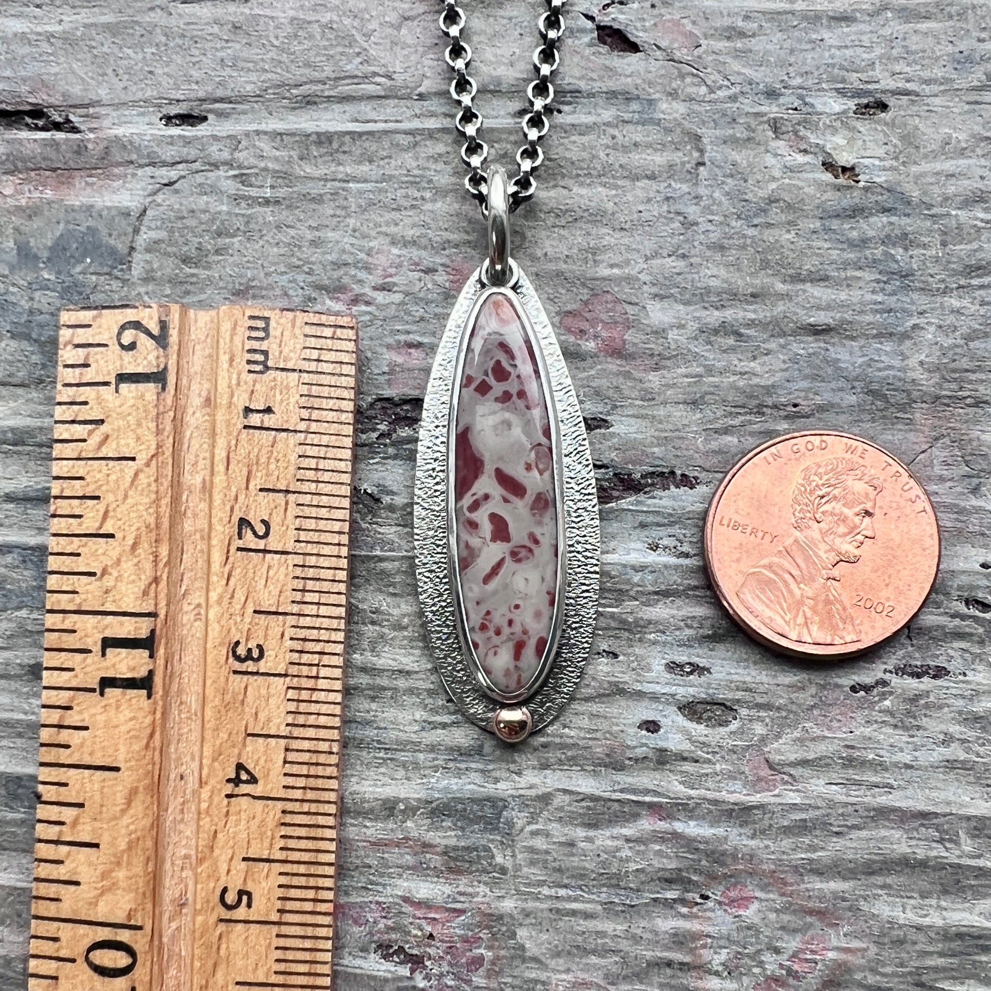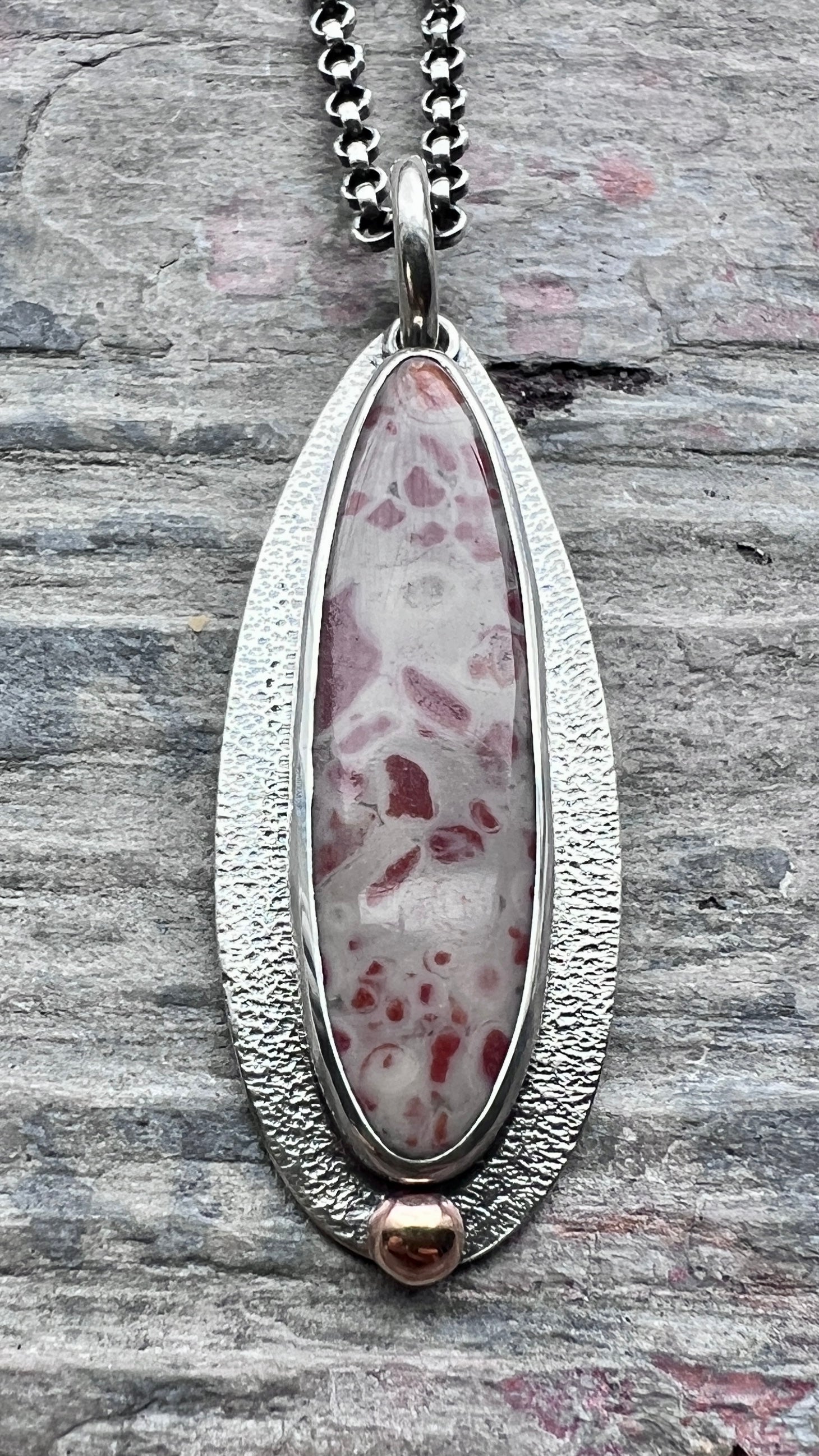This pendant necklace is handmade from sterling silver and natural jasper. A jasper teardrop cabochon is set in sterling silver. This type of jasper is known as "leopard skin jasper" due to its spotted patterns. The teardrop is accented by a small granule of golden jeweler's grade brass. I create this unique style by sawing, soldering, and finishing the design entirely by hand. The silver has been oxidized and polished to create an antique patina finish.