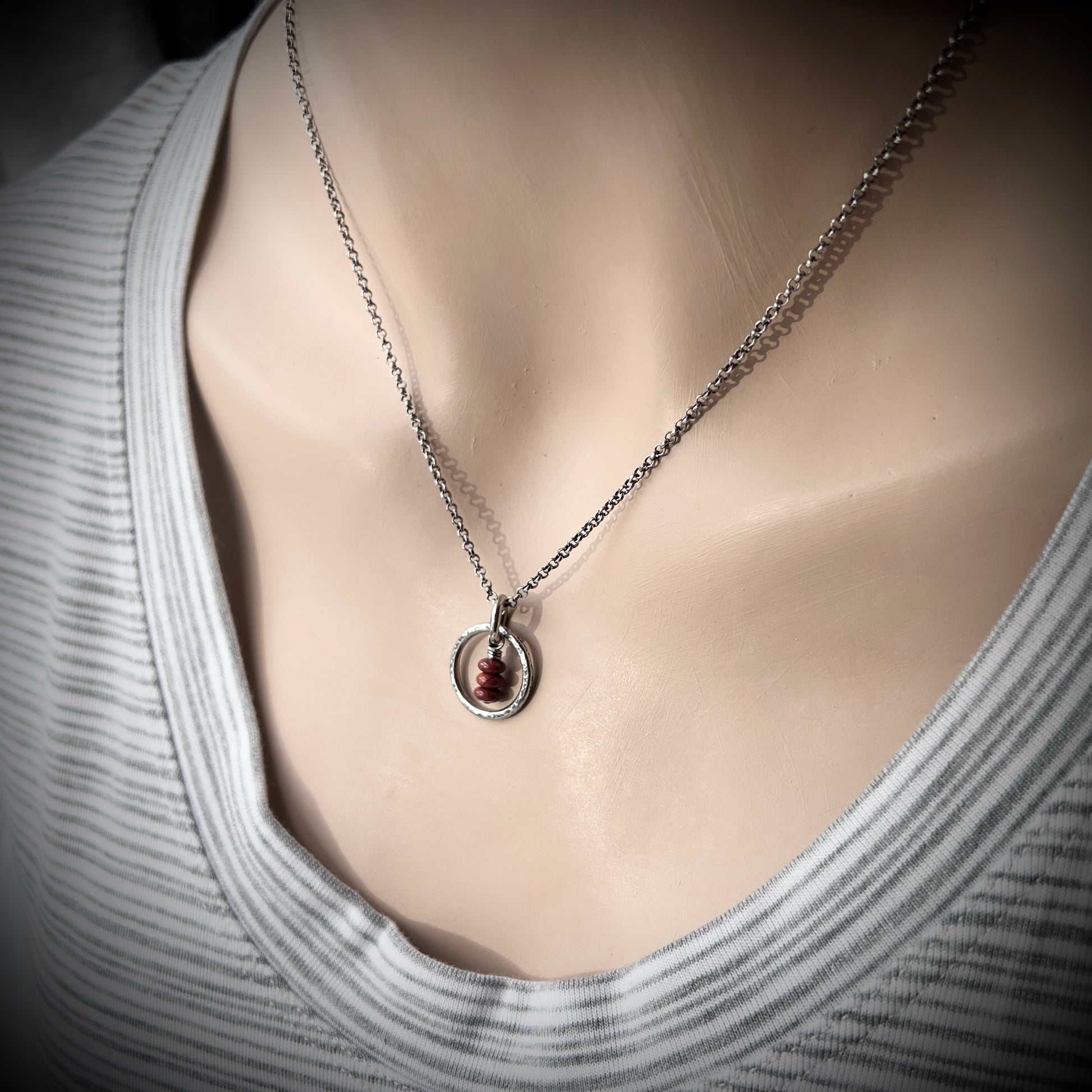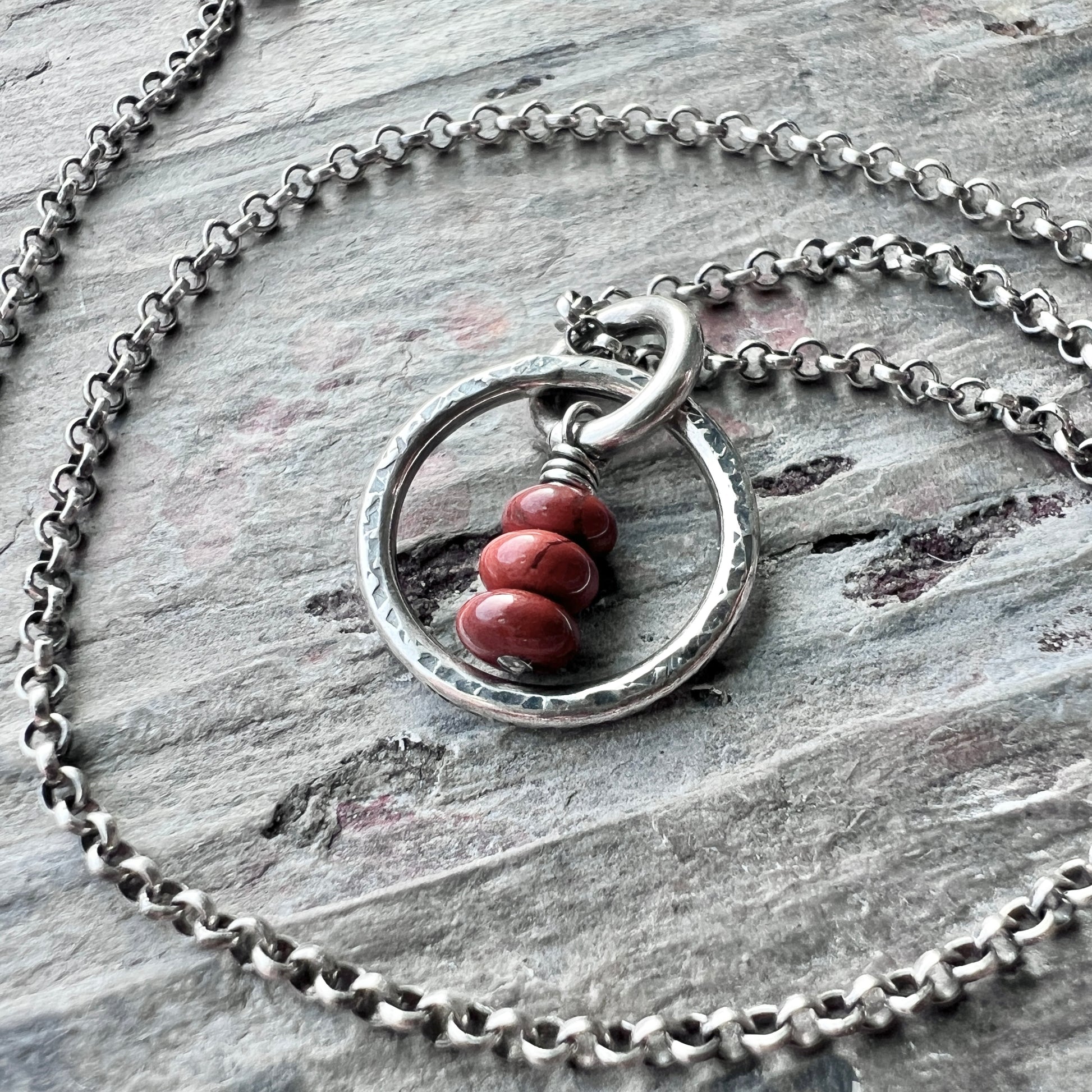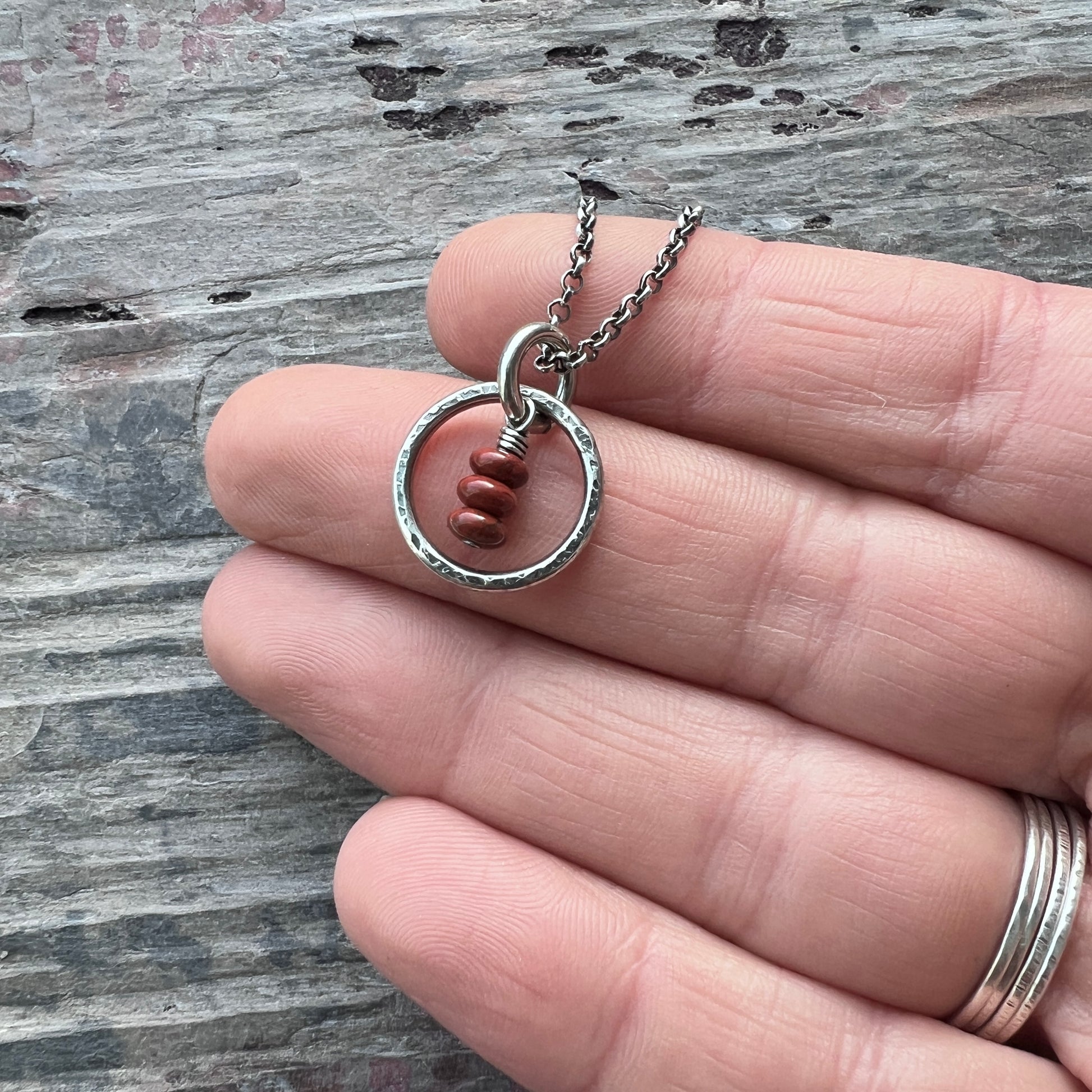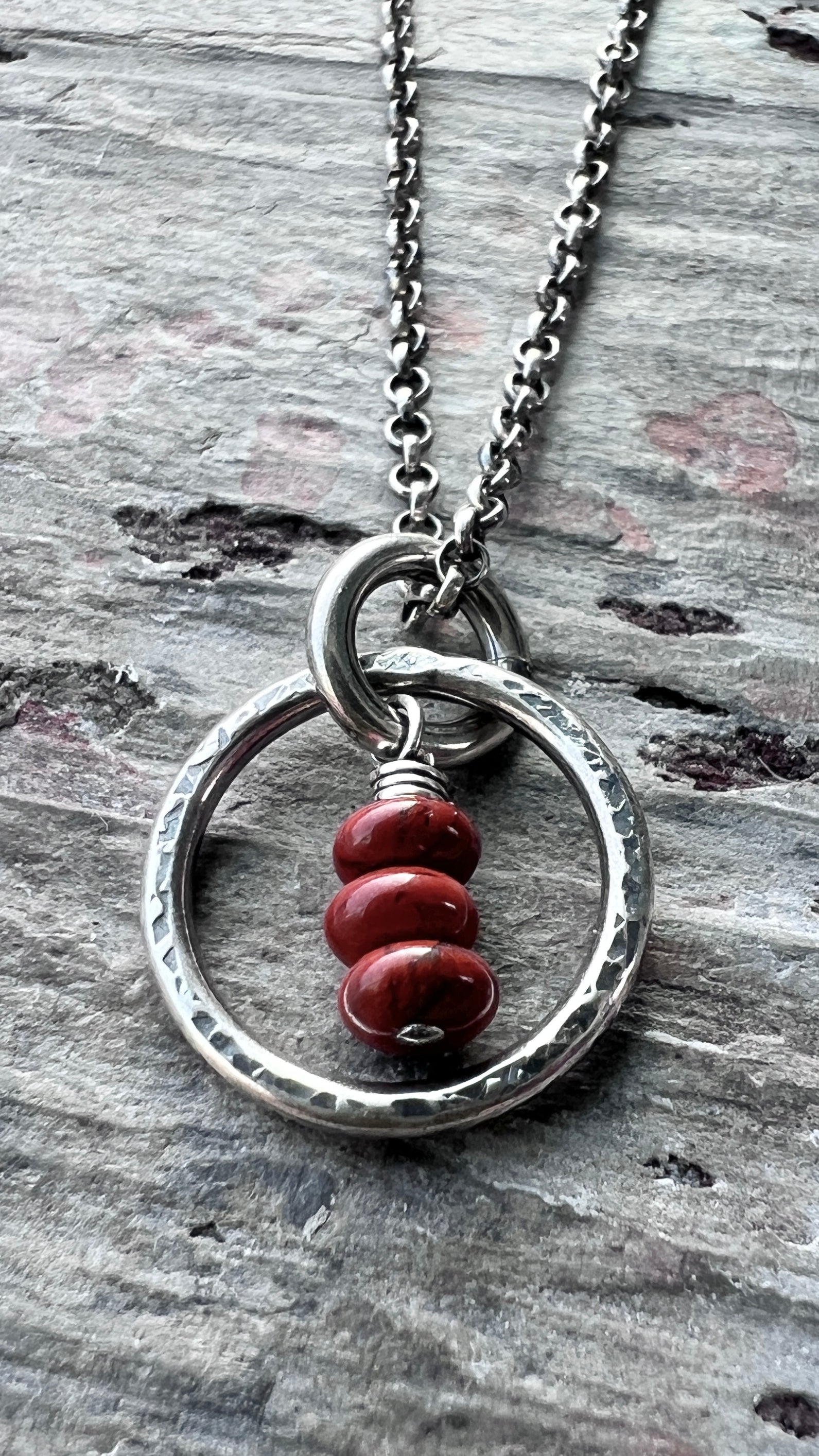 Sterling Silver Red Jasper Necklace | Natural Stones in Hammered Ring Pendant