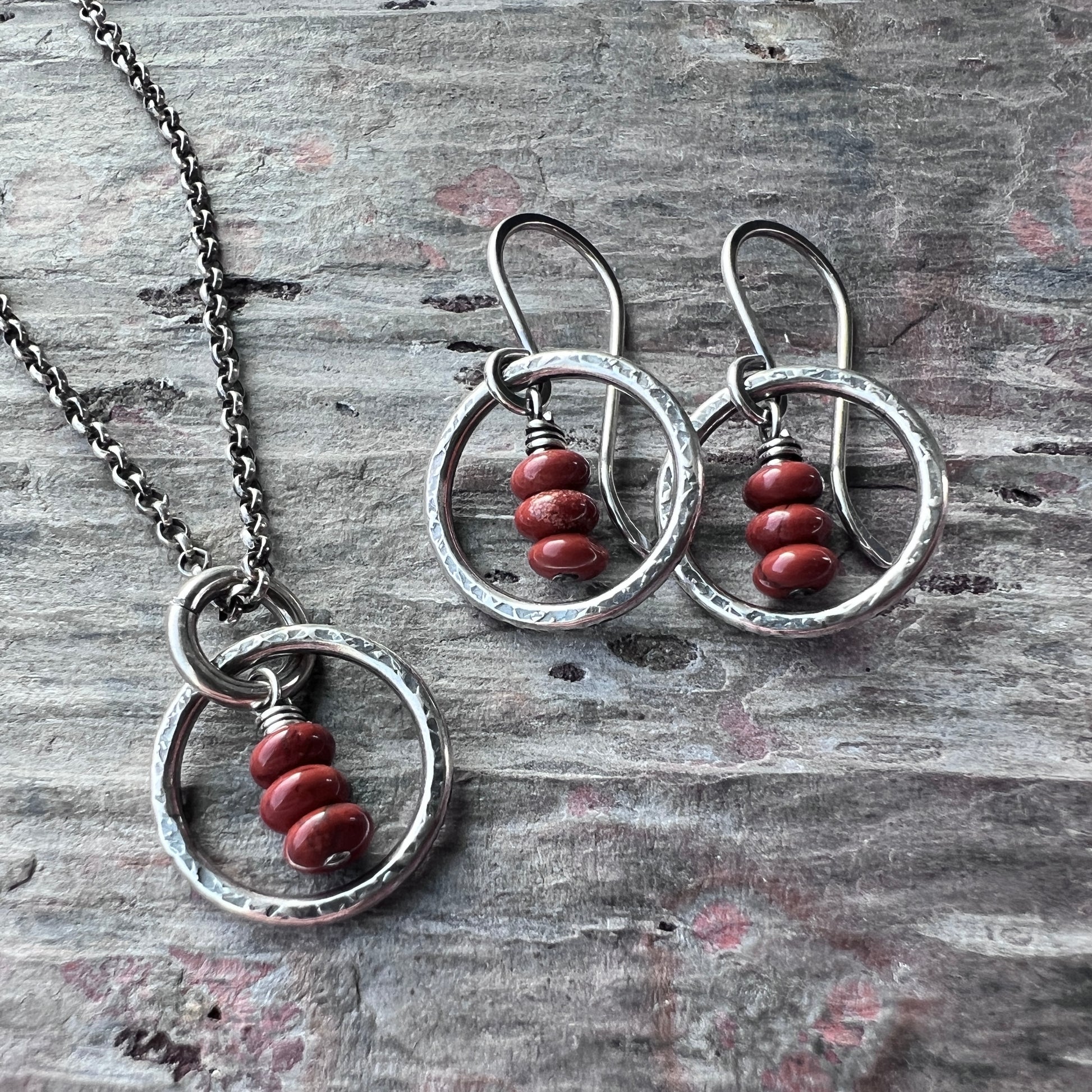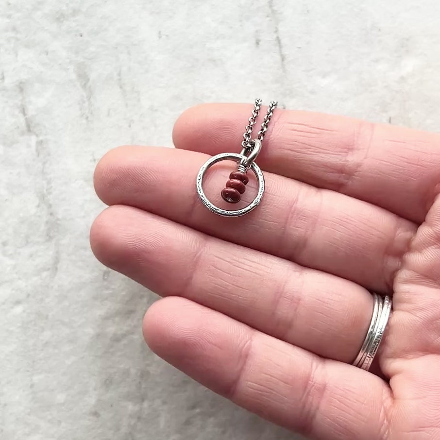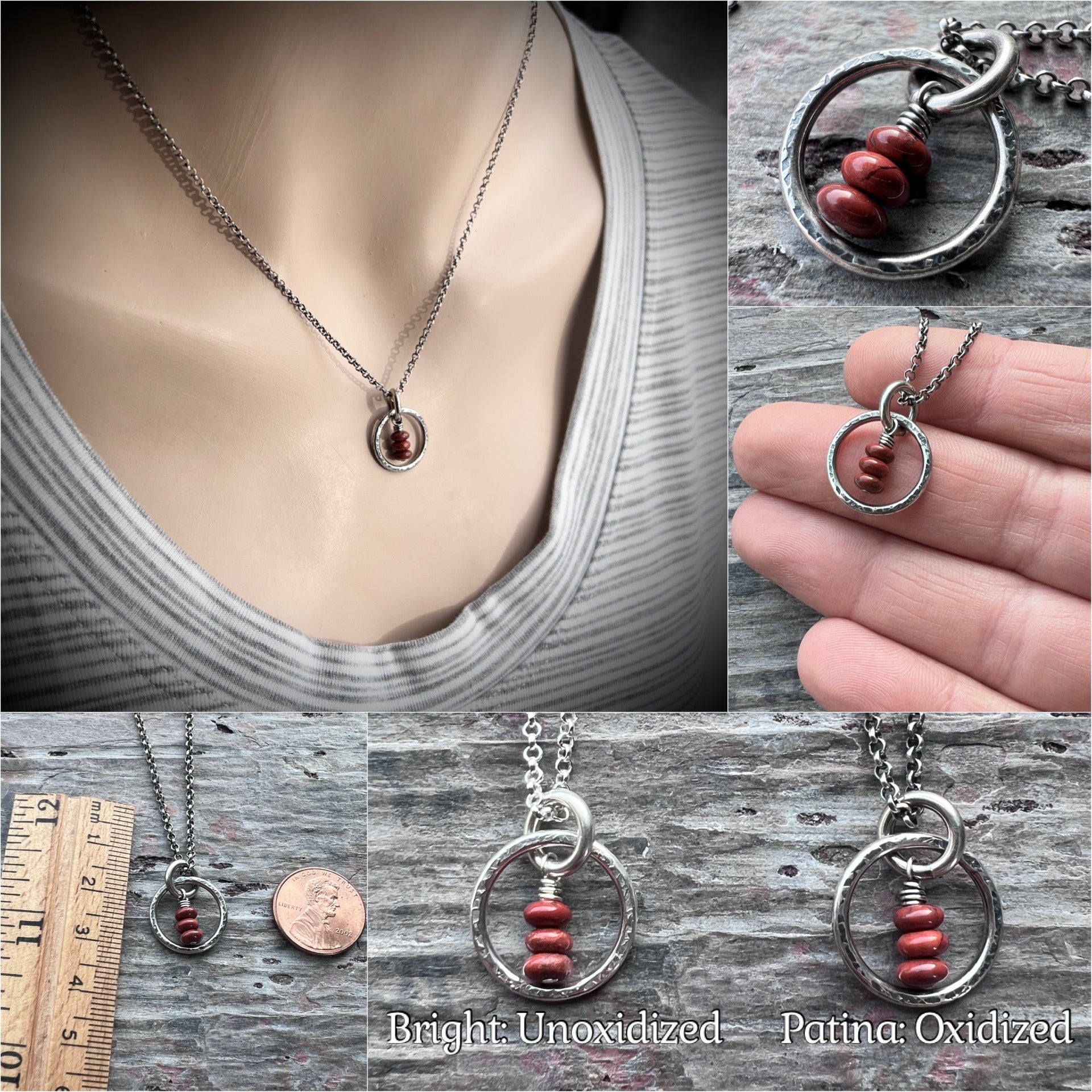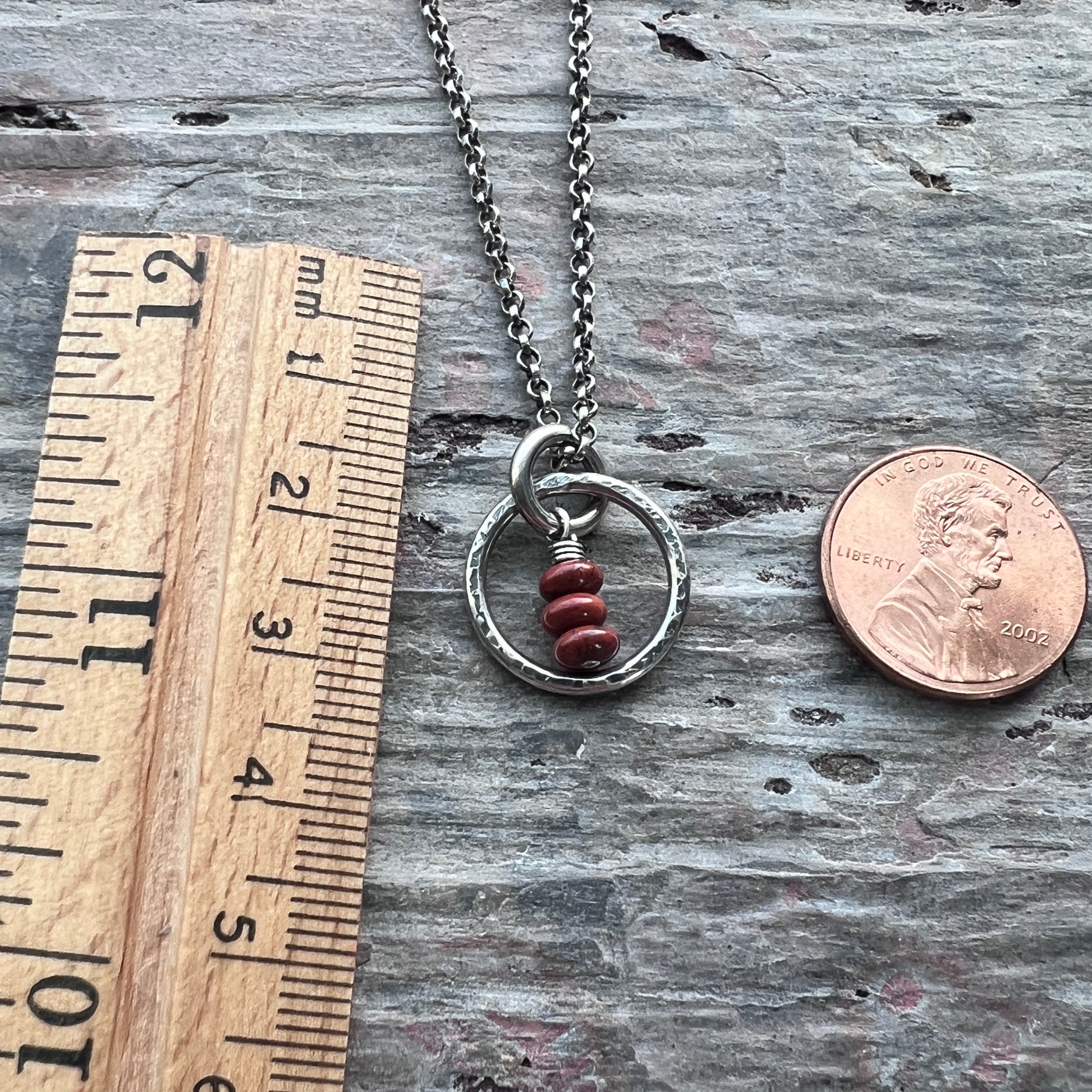 Sterling Silver Red Jasper Necklace | Natural Stones in Hammered Ring Pendant