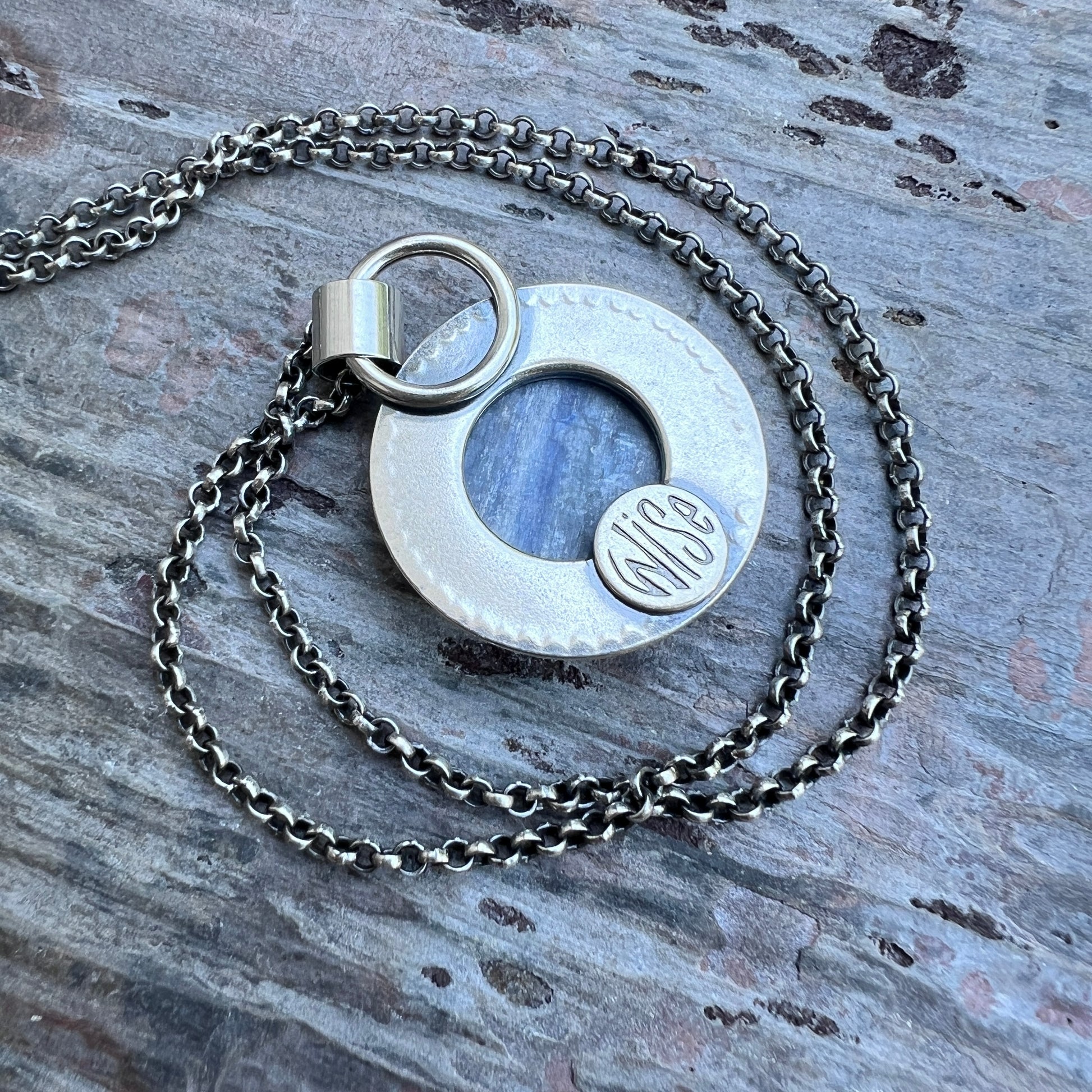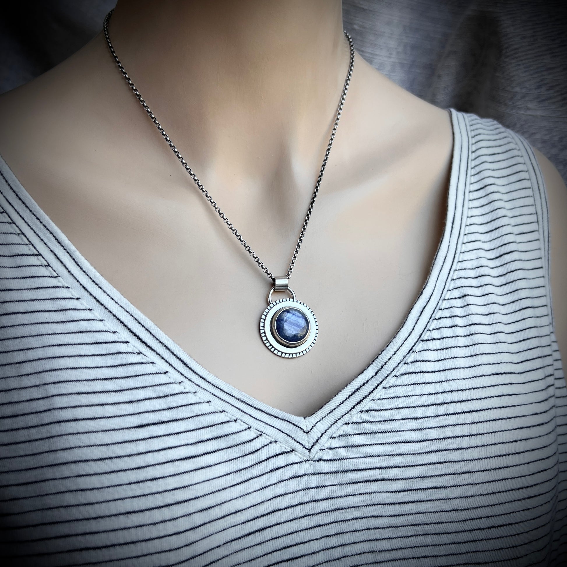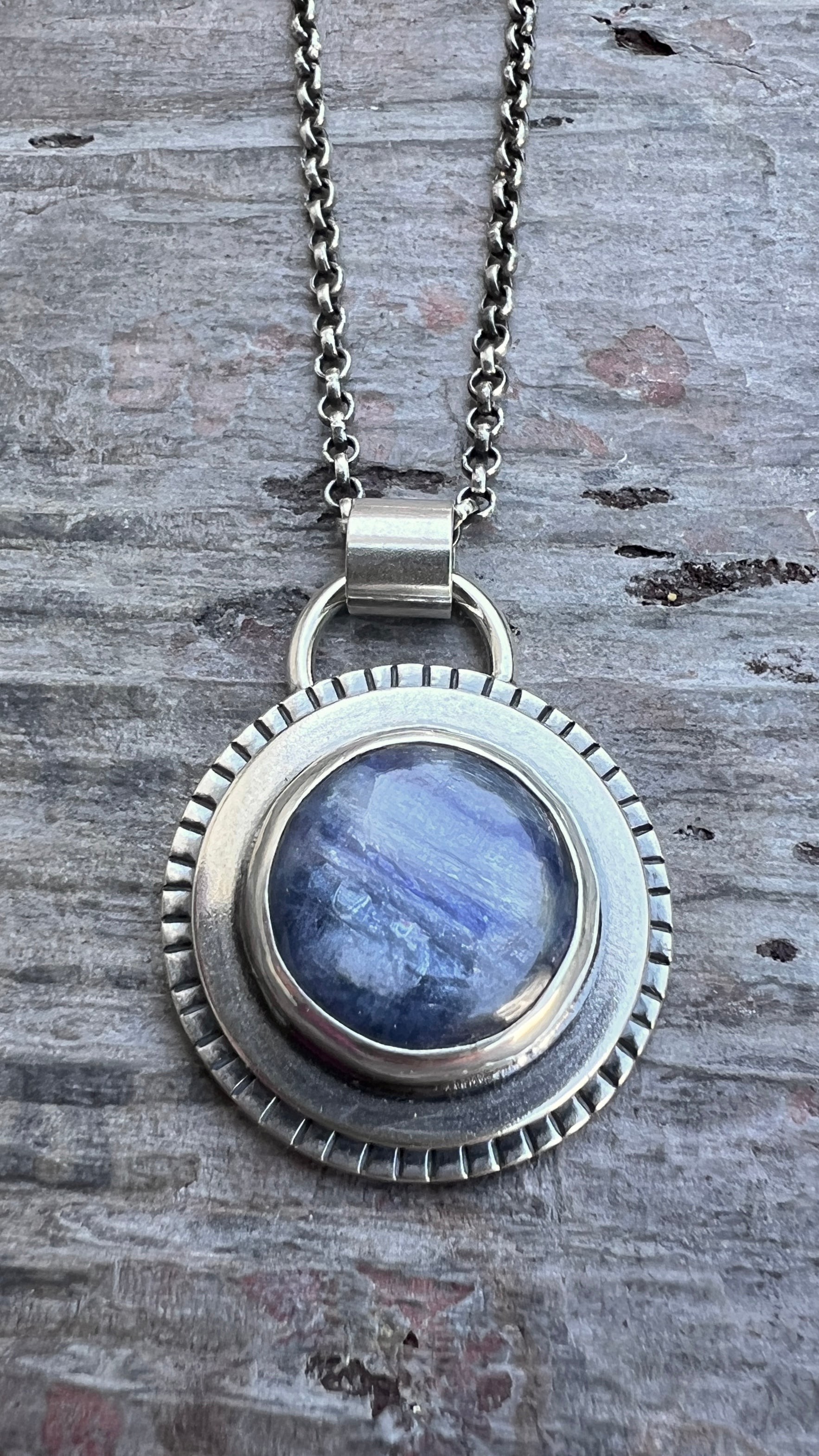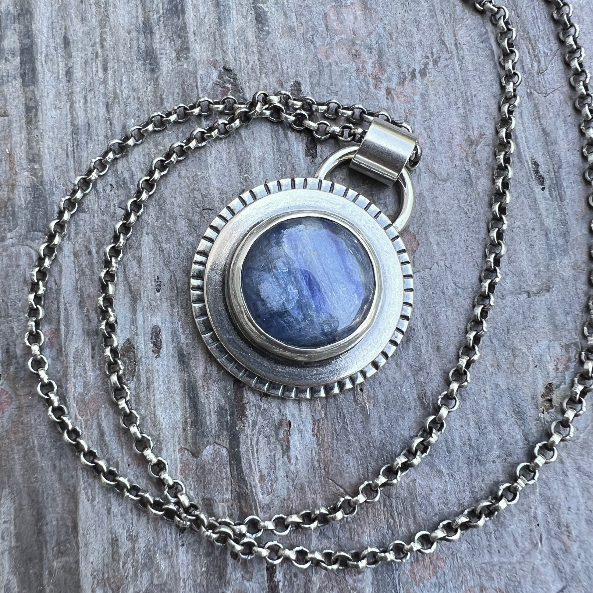 This pendant necklace is handmade from sterling silver and a round kyanite cabochon. The natural stone is set in two layers of sterling silver. It is accented by a hand stamped lined pattern. I have made this unique pendant by sawing, soldering, and finishing the design entirely by hand. The silver has been oxidized and polished to create an antique patina finish.