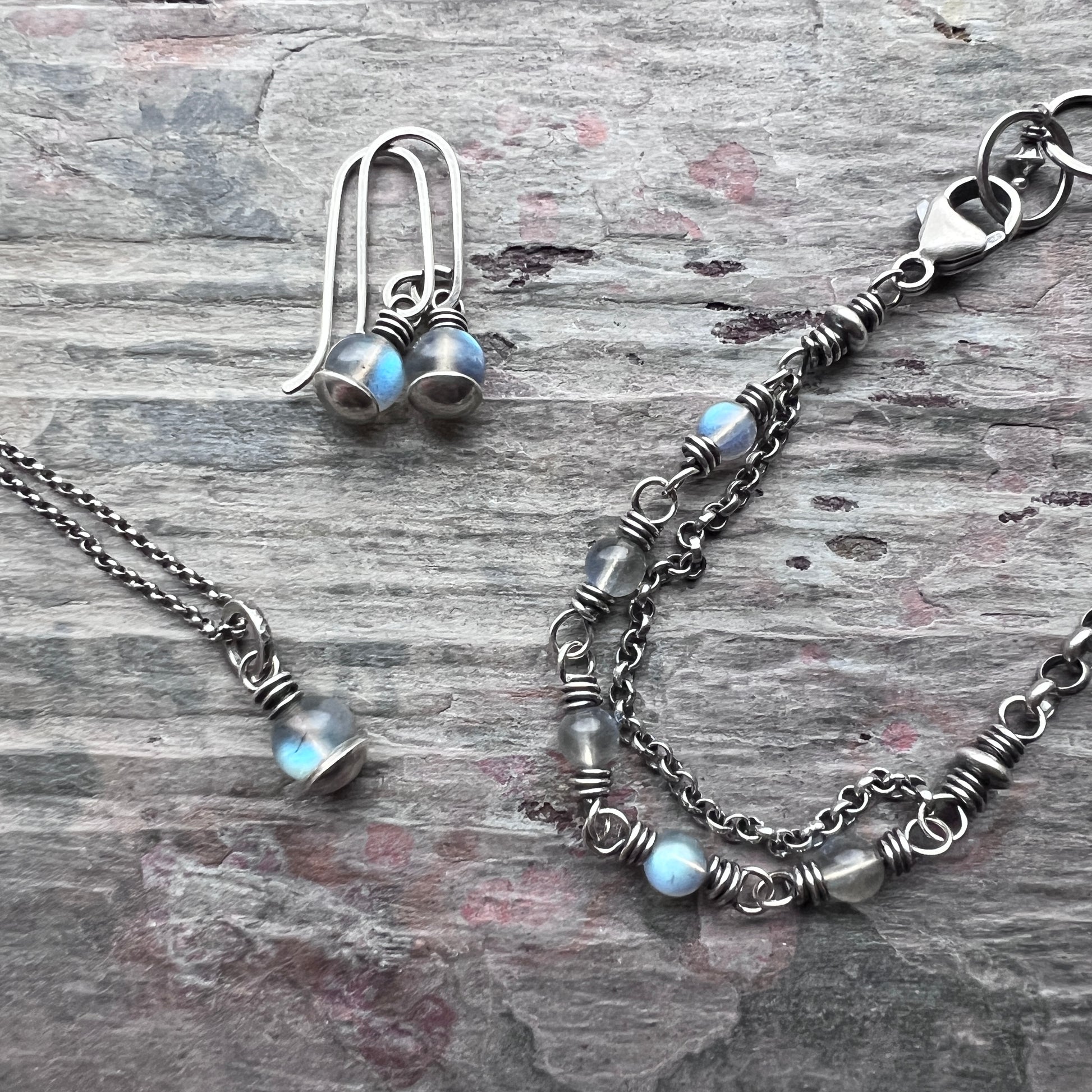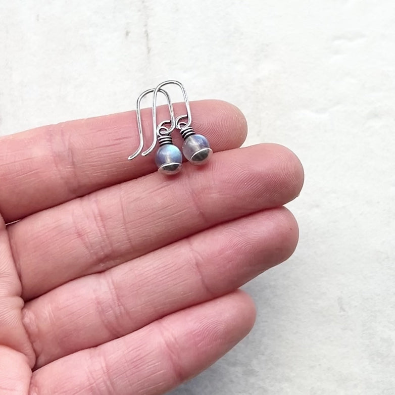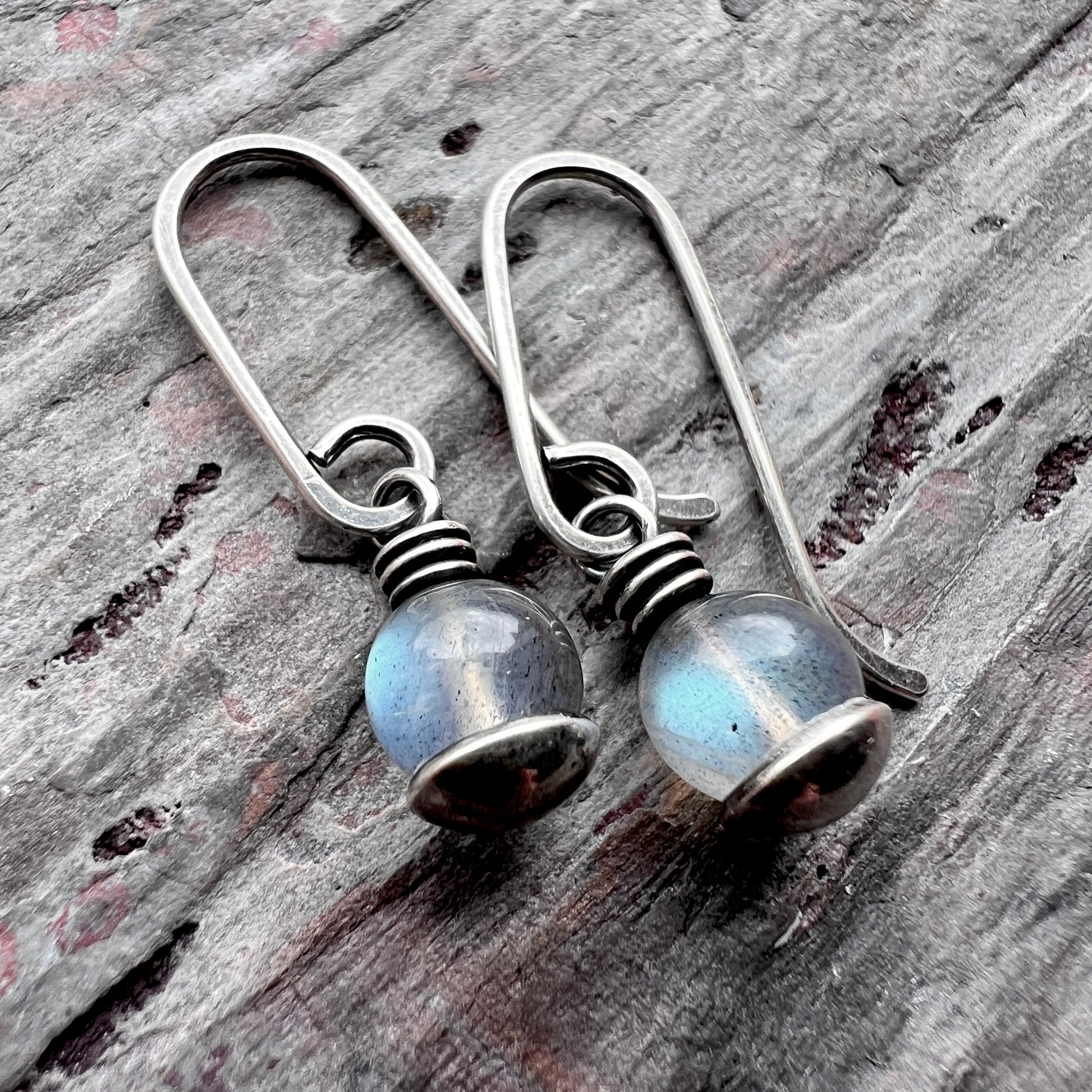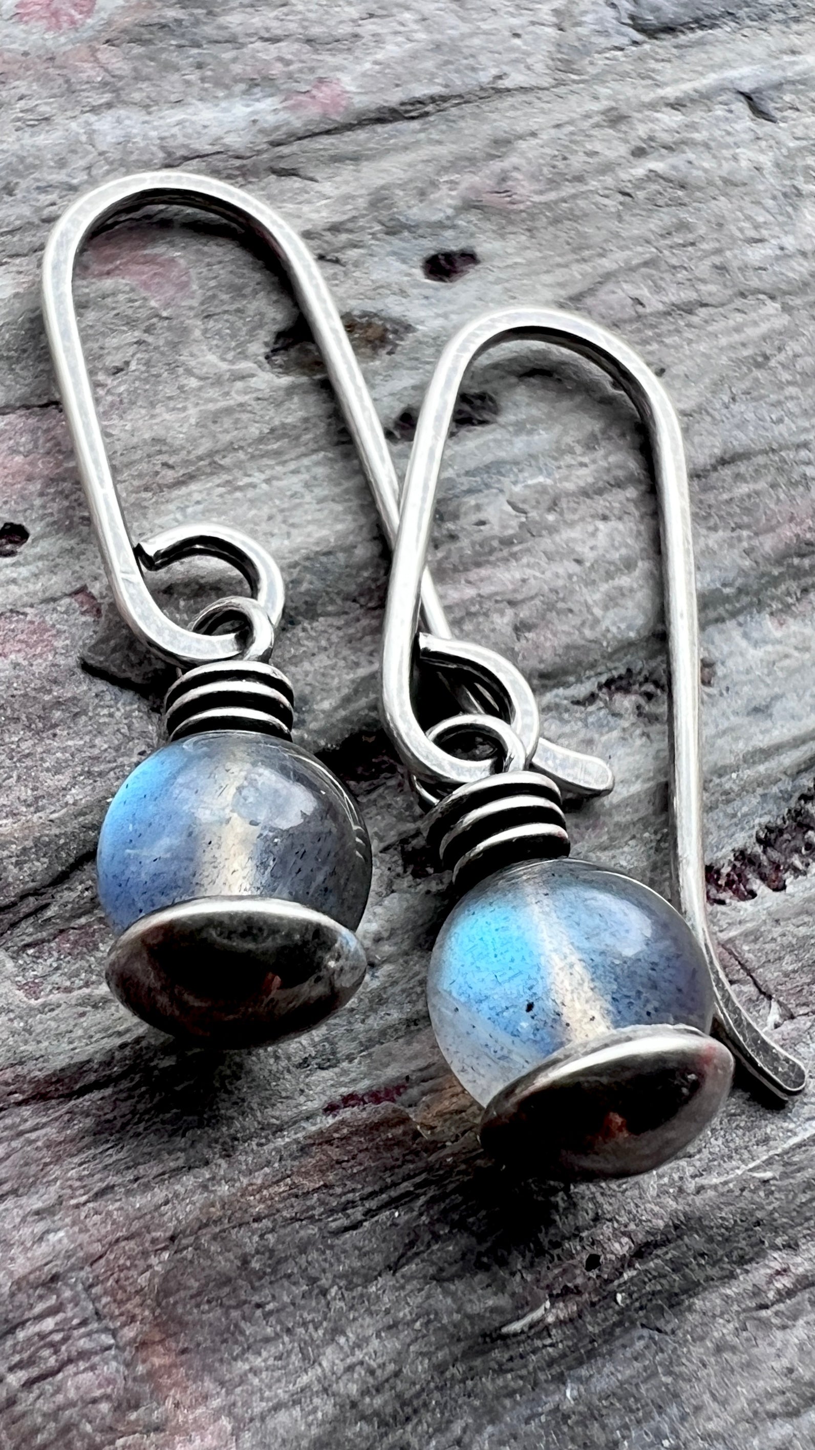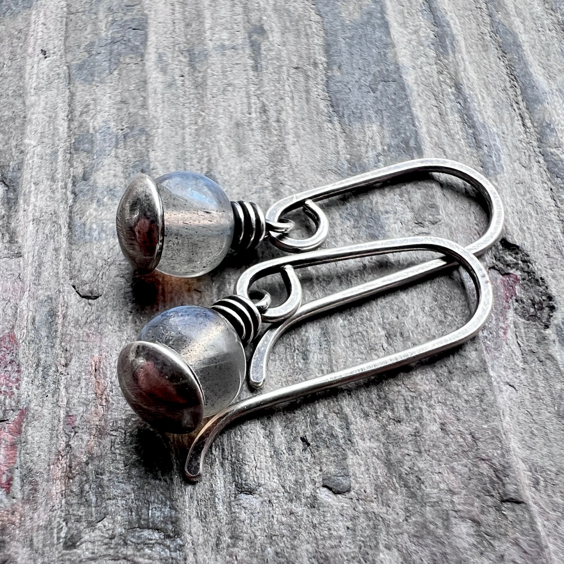 These handmade dangle earrings are created from genuine labradorite and sterling silver. The small round natural stones are nestled inside domed sterling silver circles which I have cut and formed by hand. The labradorite drops dangle below handformed sterling silver earwires.