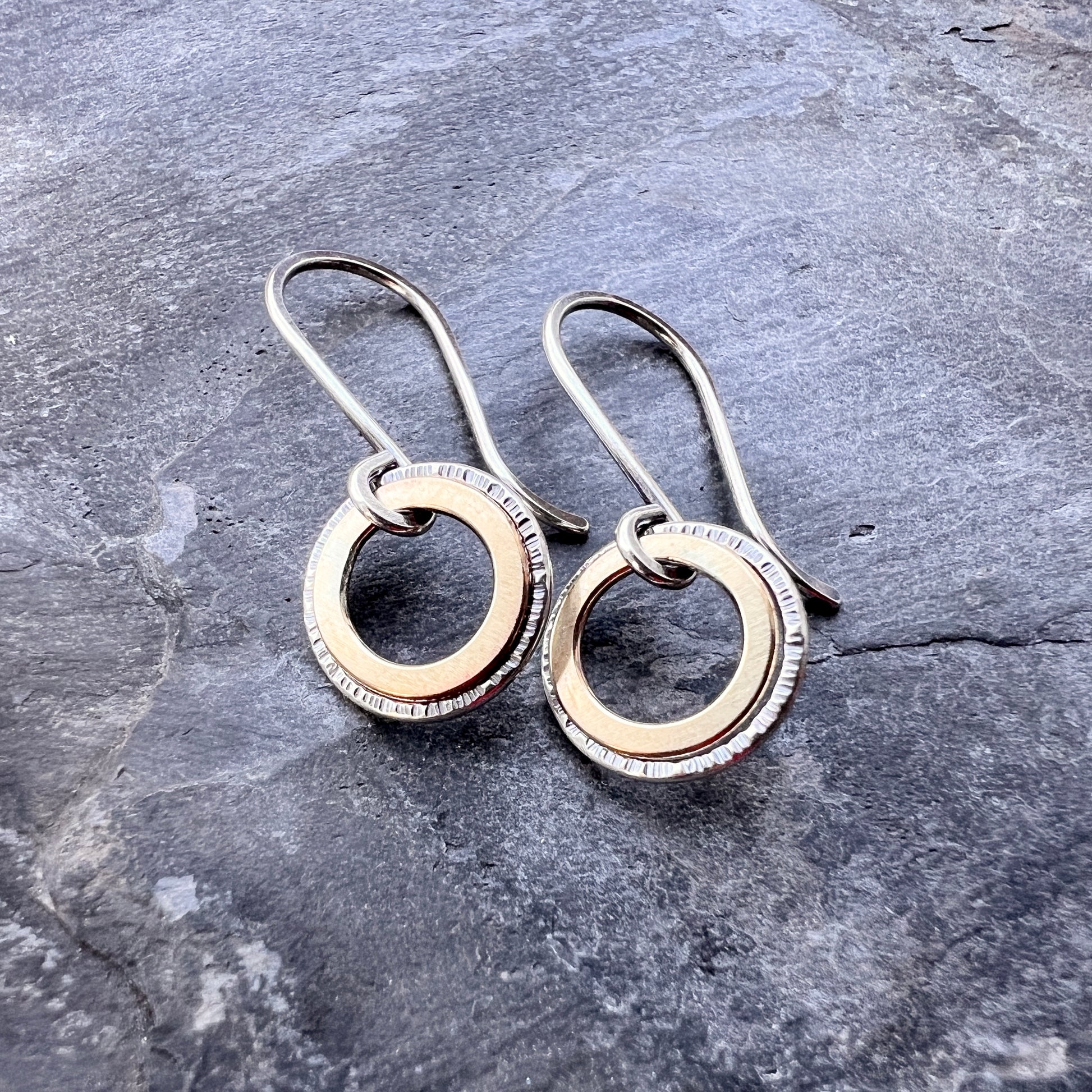 Sterling Silver and Brass Earrings | Mixed Metal Tiny Ring Dangles
