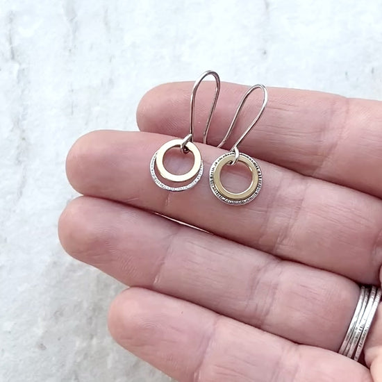 These tiny dangle earrings are handmade from sterling silver and golden brass. I create this mixed metal style by forming, soldering, and hammering solid silver and jeweler's brass. Smooth brass circles are framed by textured silver rings. The earrings dangle from handmade sterling silver earwires.