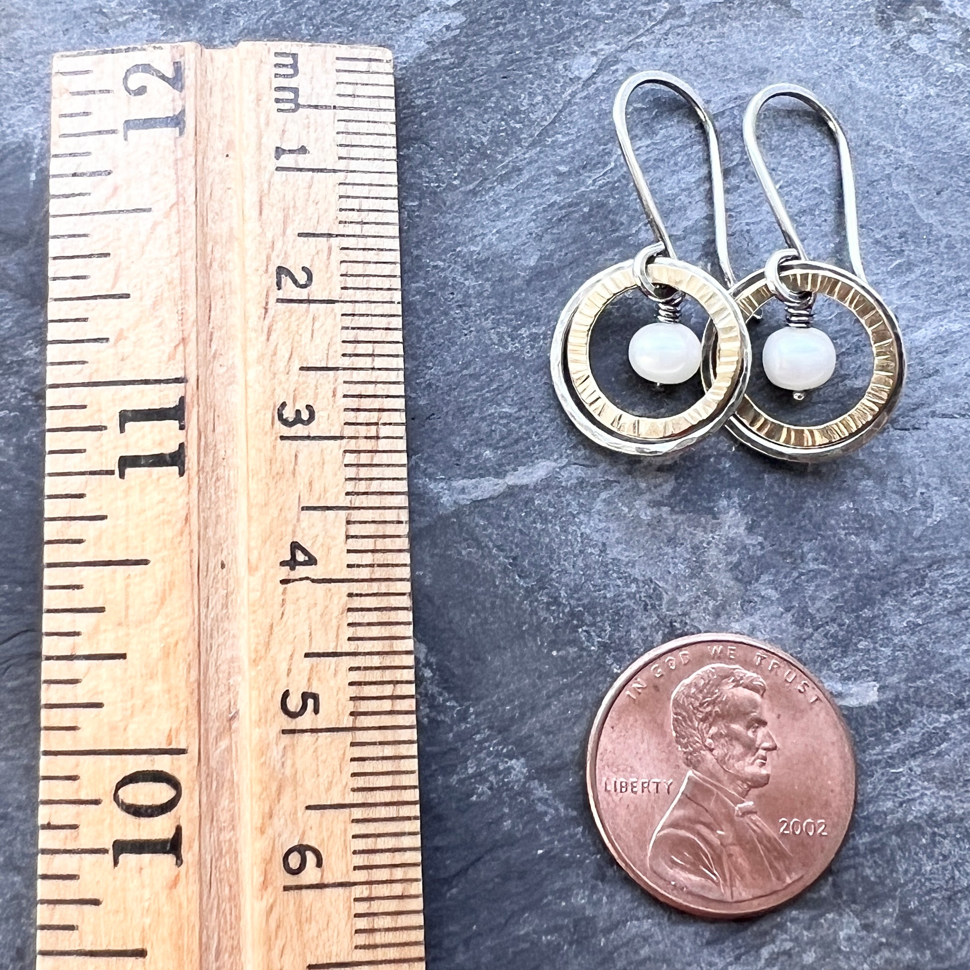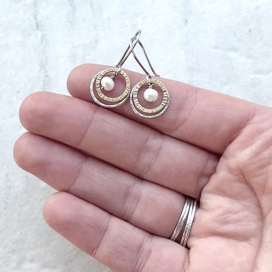 These dangle earrings are handmade from genuine freshwater pearls, sterling silver, and golden brass. The small white pearls have been wrapped in sterling silver. The pearls are framed by circles made from solid sterling silver and jeweler's brass. I have formed, soldered, and textured the design entirely by hand. The earrings dangle from handformed sterling silver earwires.