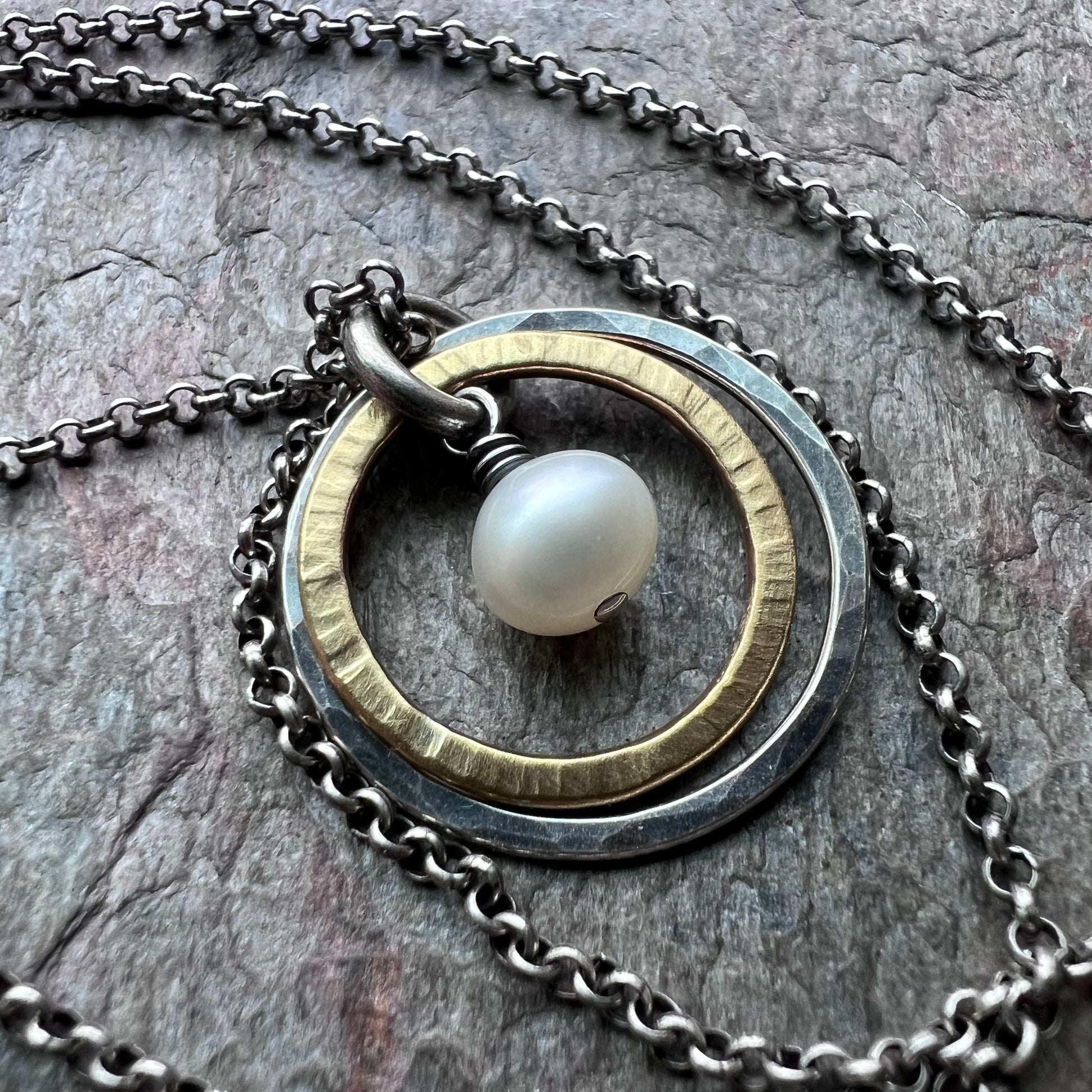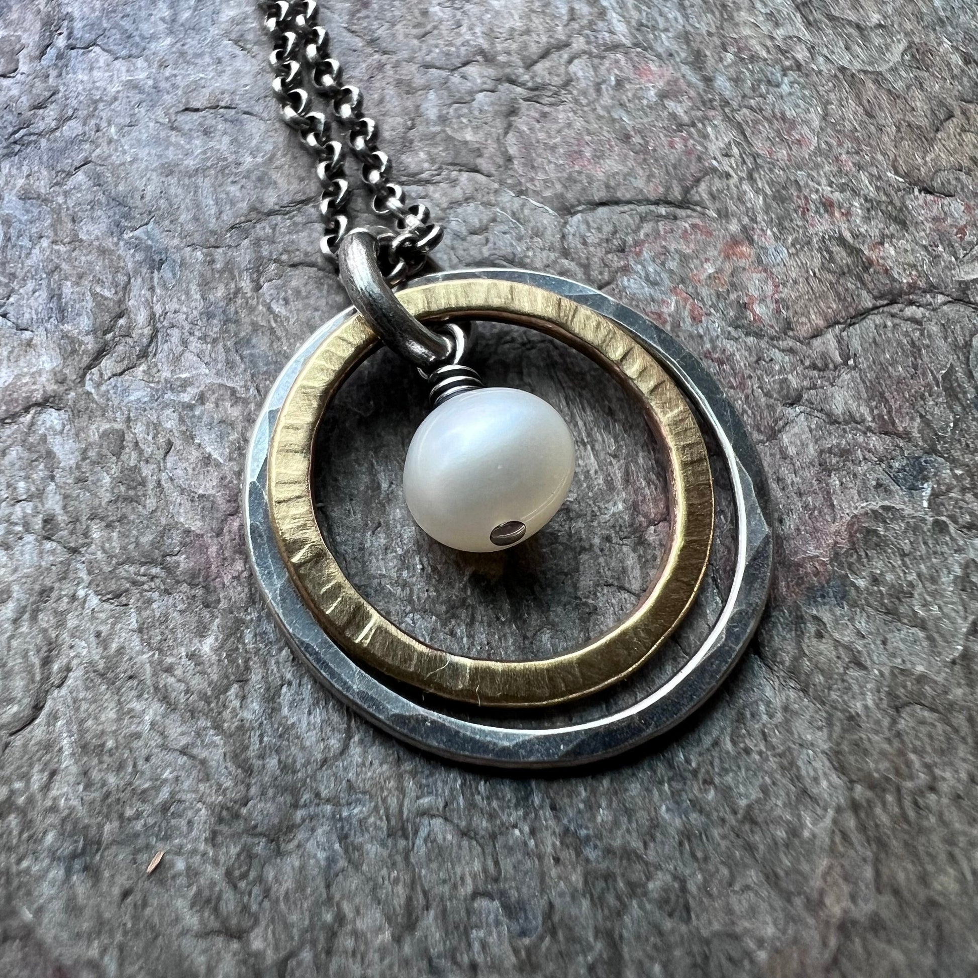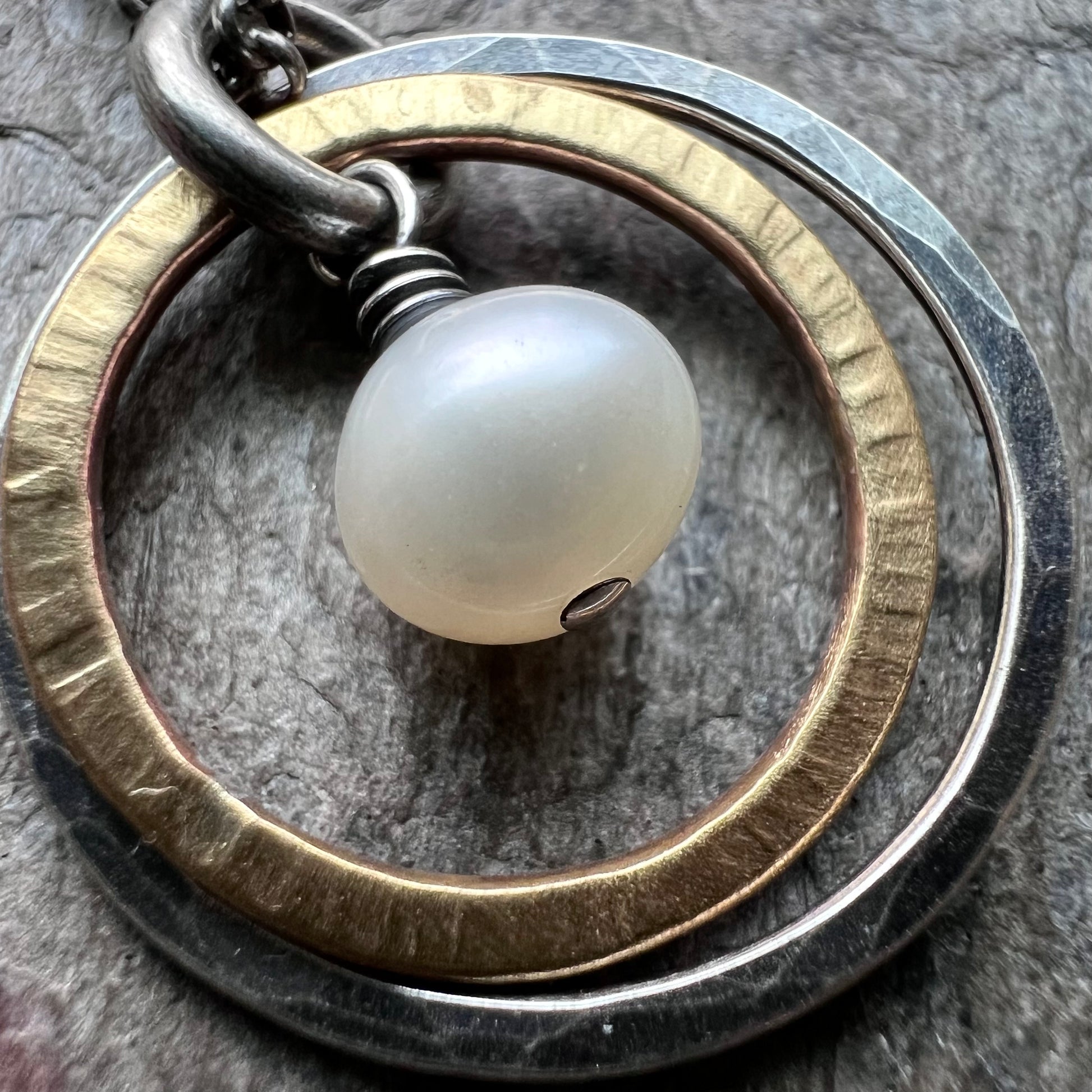 A genuine freshwater pearl has been wrapped in sterling silver. The pearl is framed by circles made from solid sterling silver and jeweler's grade brass. I have formed, soldered, and textured the pendant entirely by hand. The pendant hangs from a sterling silver chain.