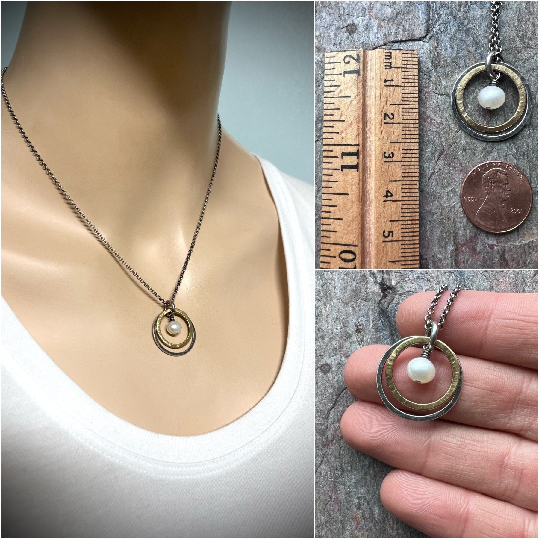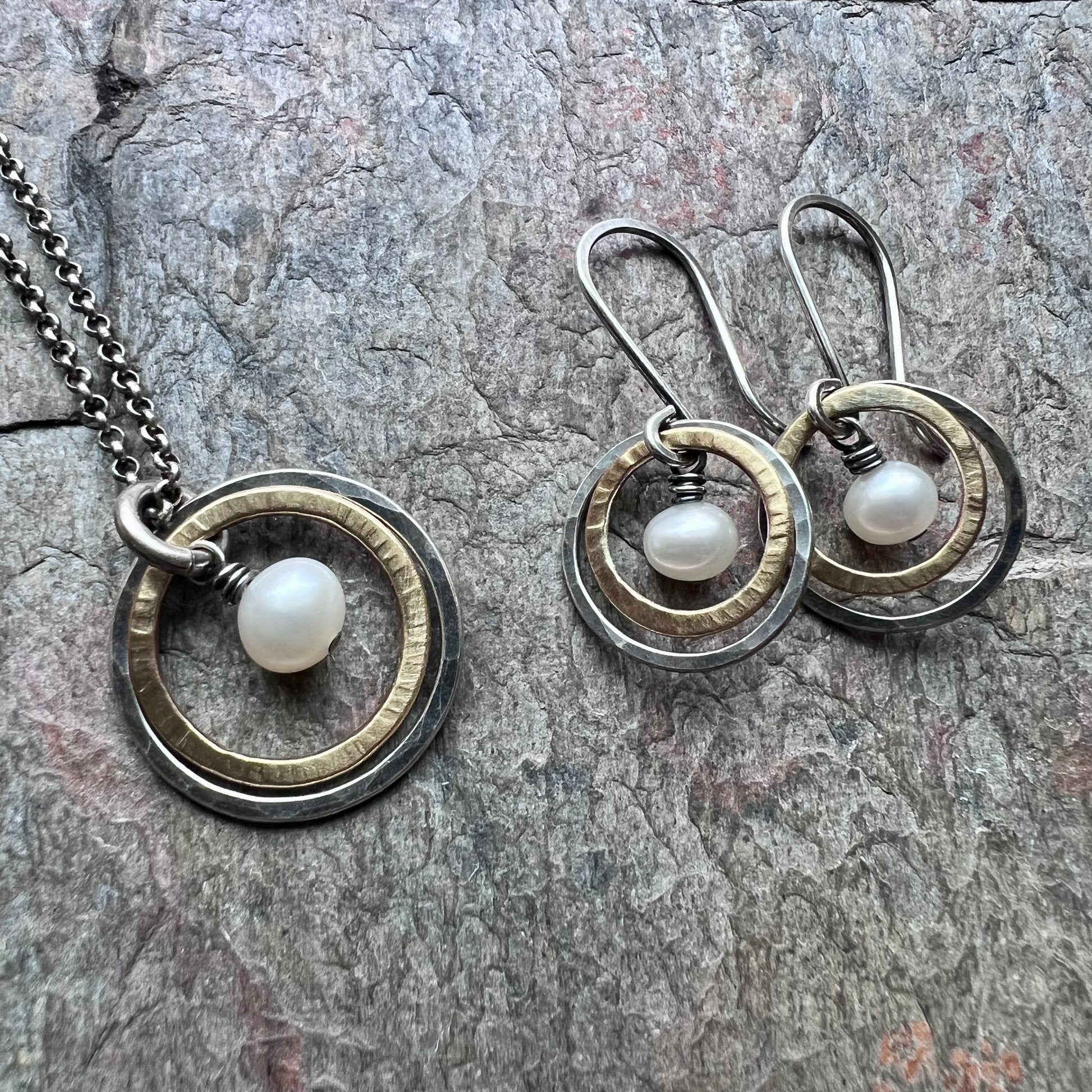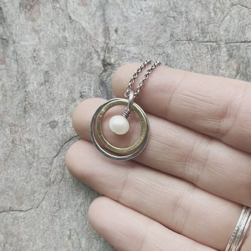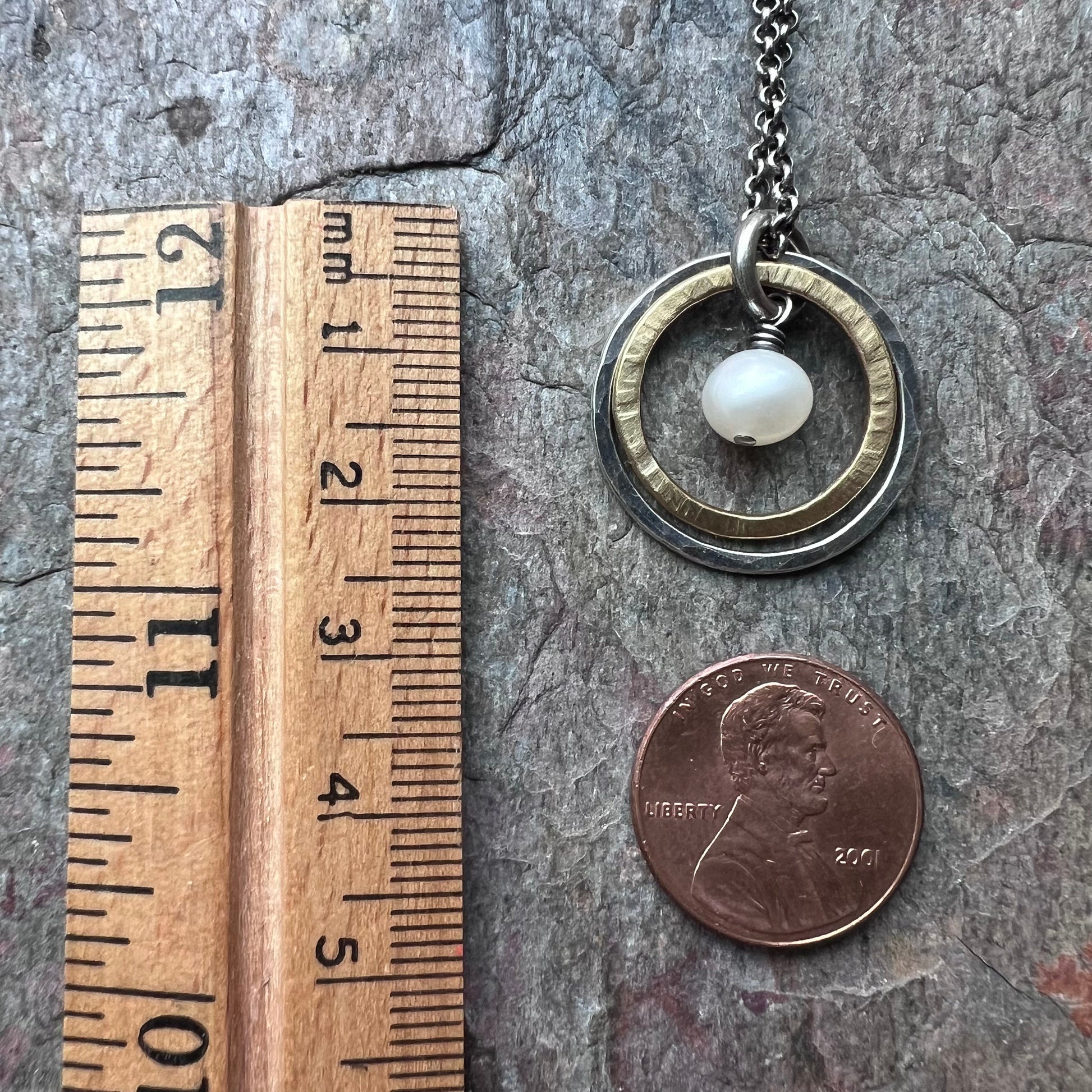 A genuine freshwater pearl has been wrapped in sterling silver. The pearl is framed by circles made from solid sterling silver and jeweler's grade brass. I have formed, soldered, and textured the pendant entirely by hand. The pendant hangs from a sterling silver chain.