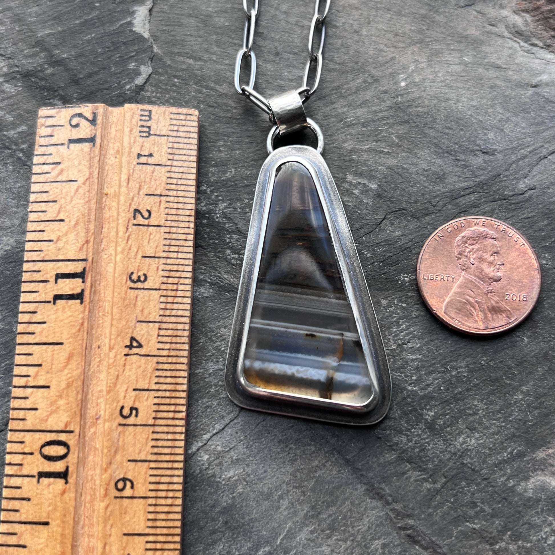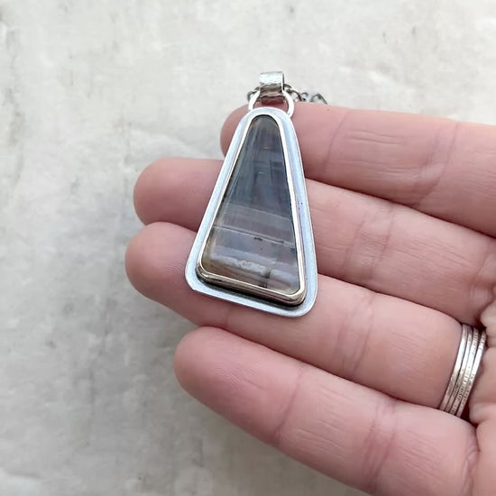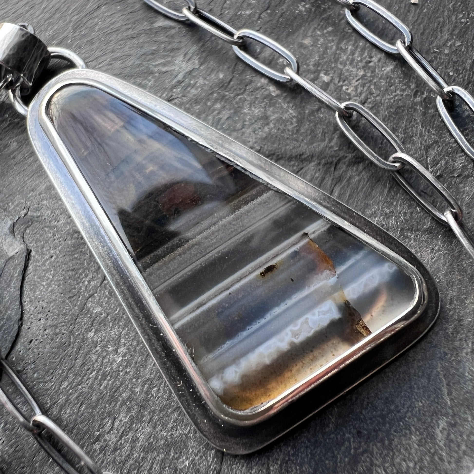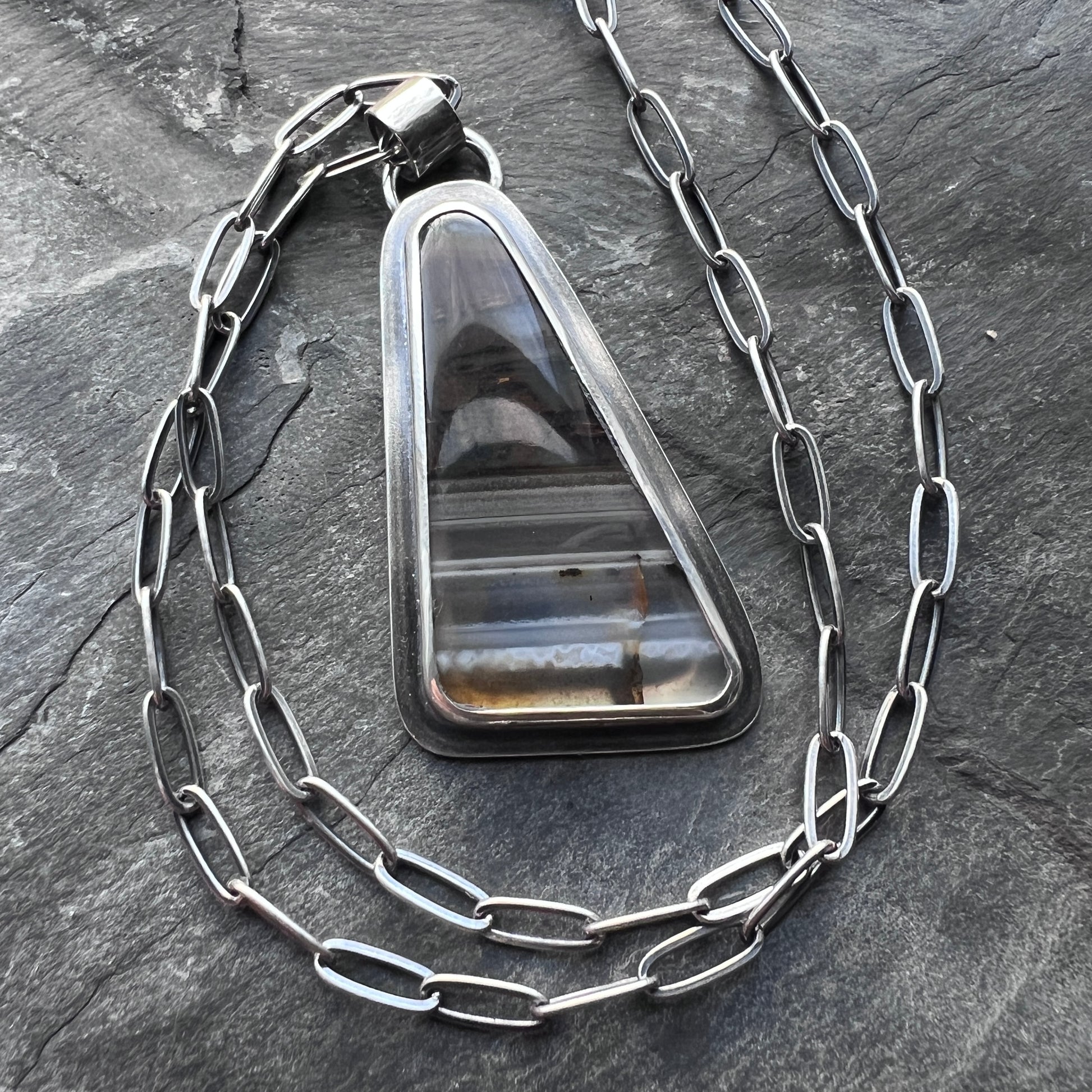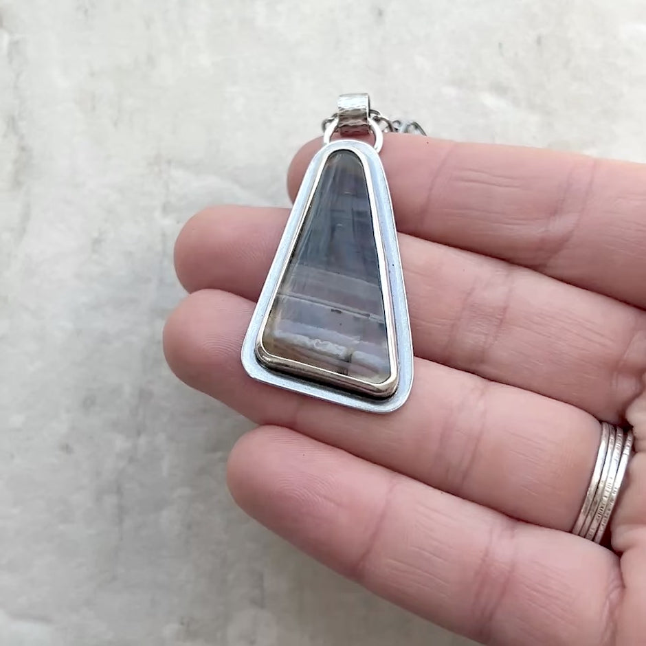 This pendant necklace is handmade from genuine Montana agate and sterling silver. The natural stone cabochon has been cut into a triangular shape. It features bands of brown, gray, and white coloring. The geometric design of the pendant is complemented by a sterling silver rectangular chain. I have made this unique necklace by sawing, soldering, and finishing the design entirely by hand. The silver has been oxidized and polished to create an antique patina finish.