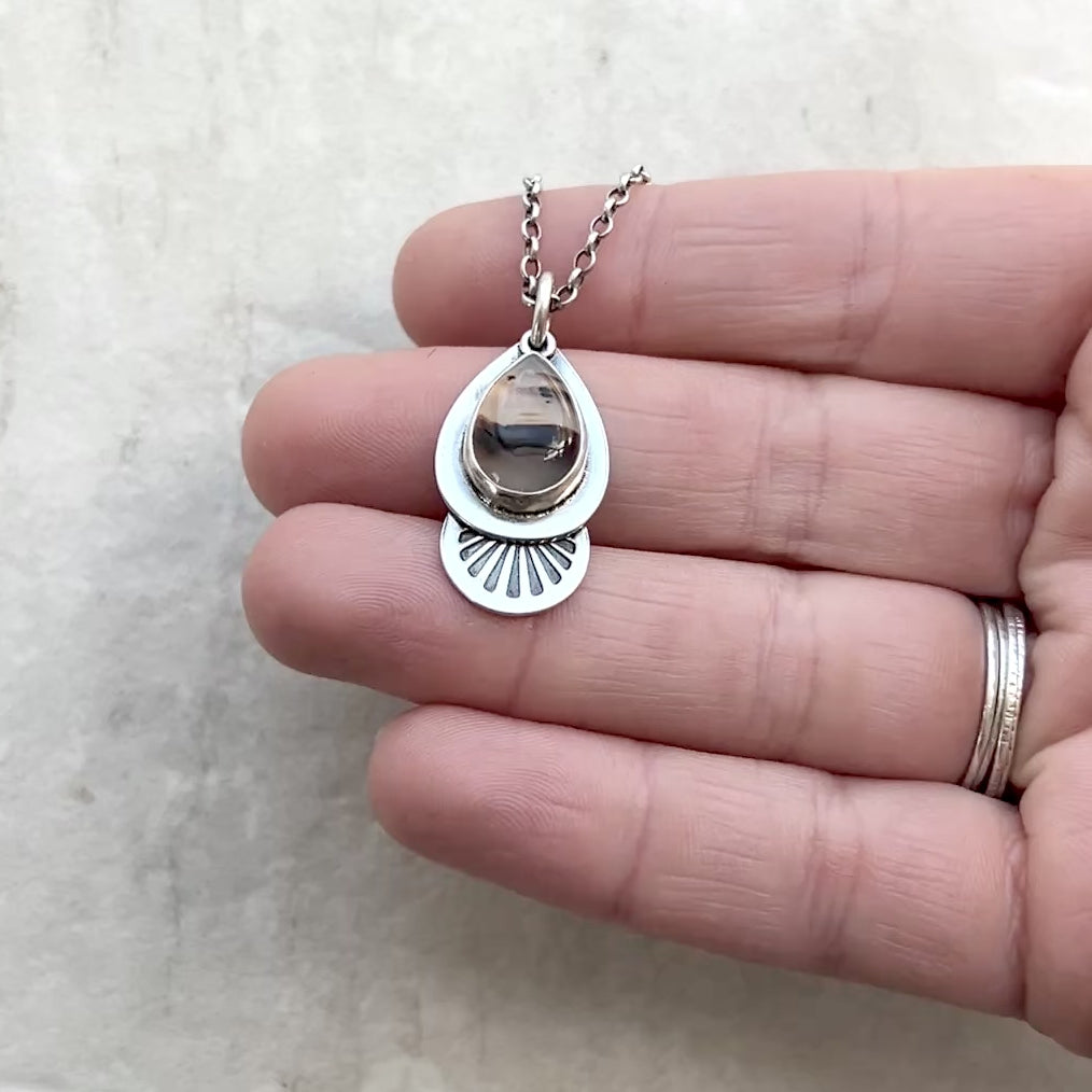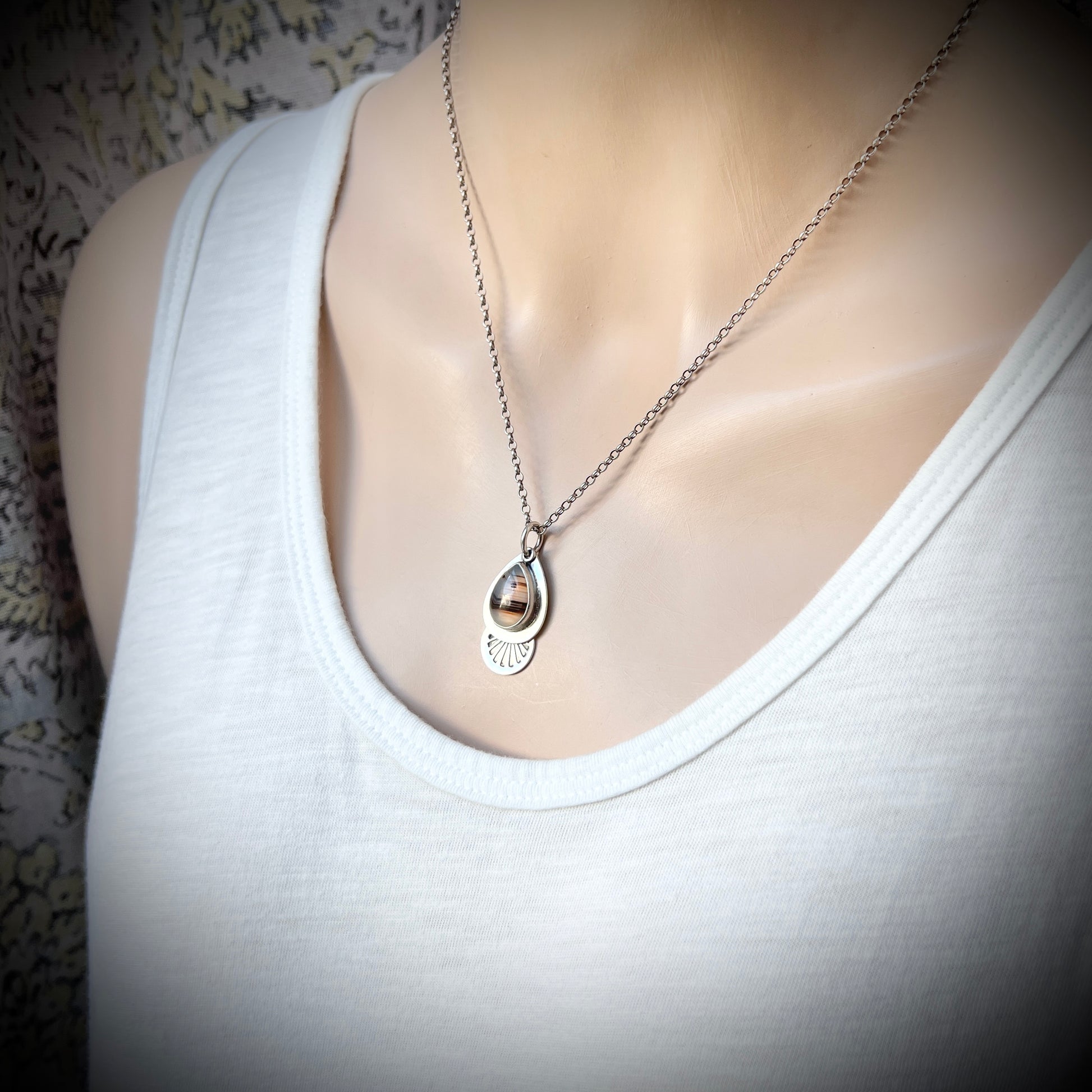 This pendant necklace design is handmade from sterling silver and natural Montana agate. A genuine agate cabochon is set in a sterling silver teardrop. Below the stone is a stamped radiating line pattern. I make each unique pendant by sawing, soldering, texturing, and finishing the design entirely by hand. The silver has been oxidized and polished to create an antique patina finish.
