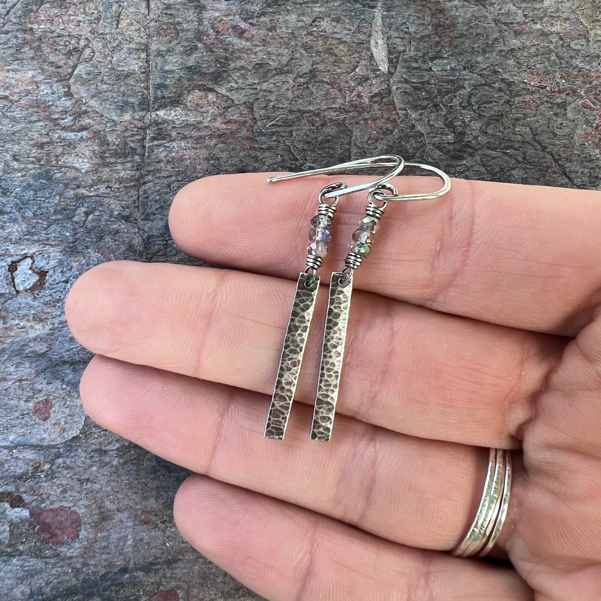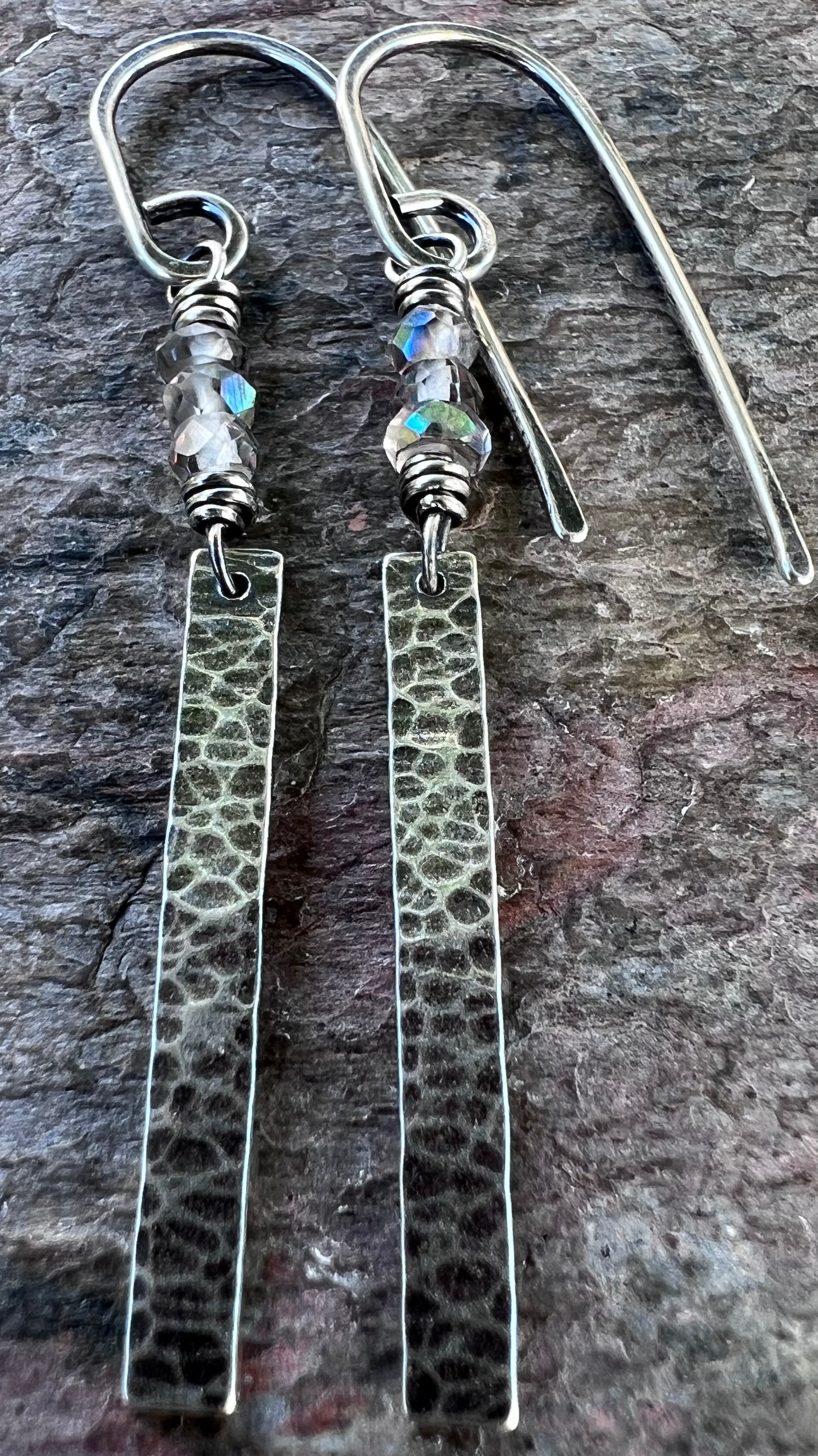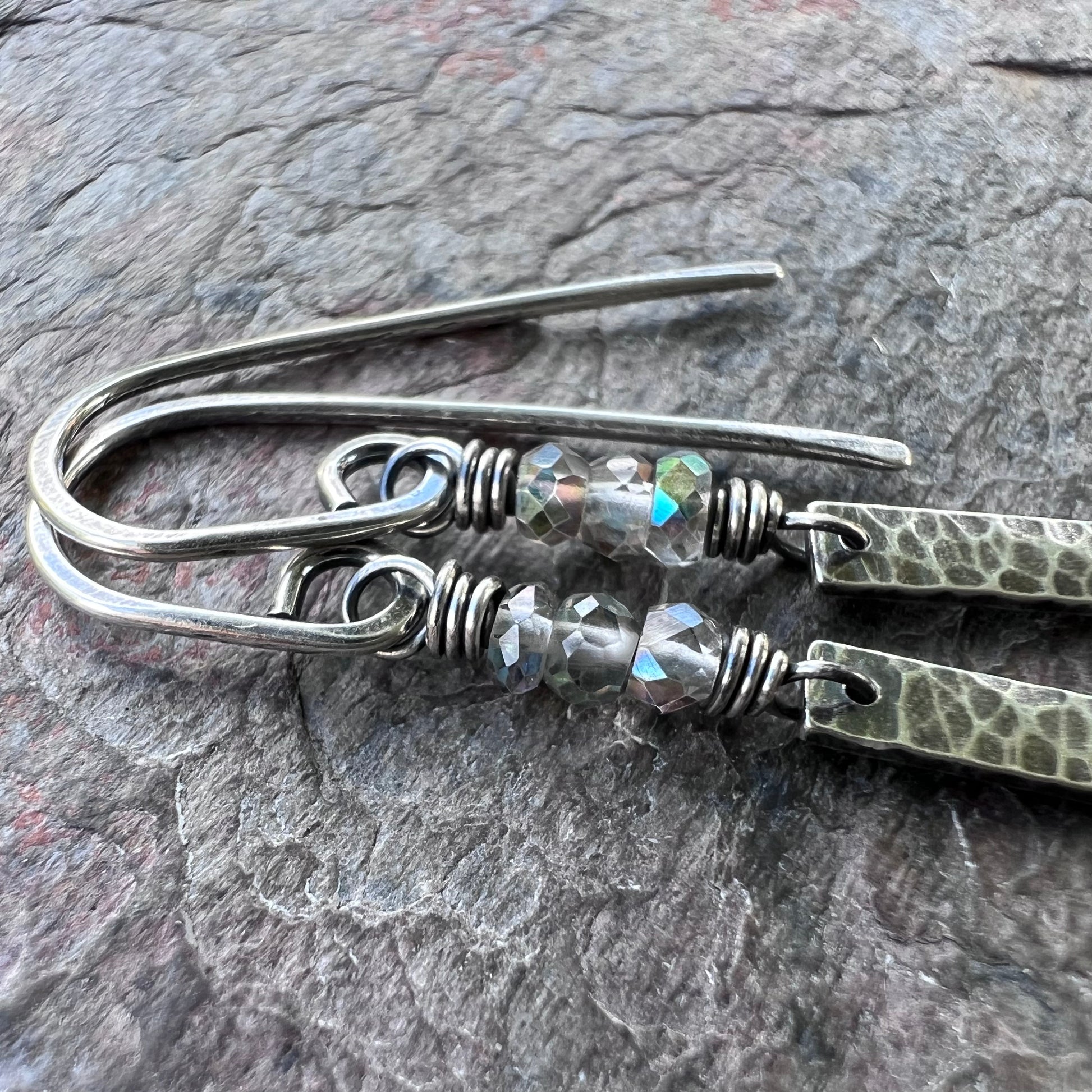 A set of tiny and sparkling genuine mystic topaz gems have been wrapped in sterling silver wire. Below the stones dangle sterling silver bars which I have cut, hammered, and finished by hand. The earrings hang from handformed sterling silver earwires.