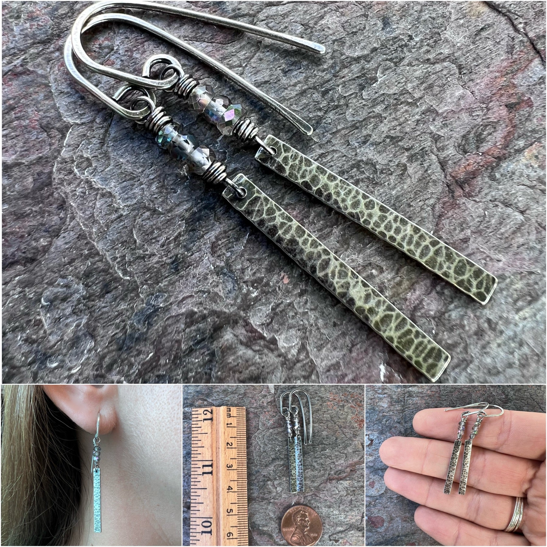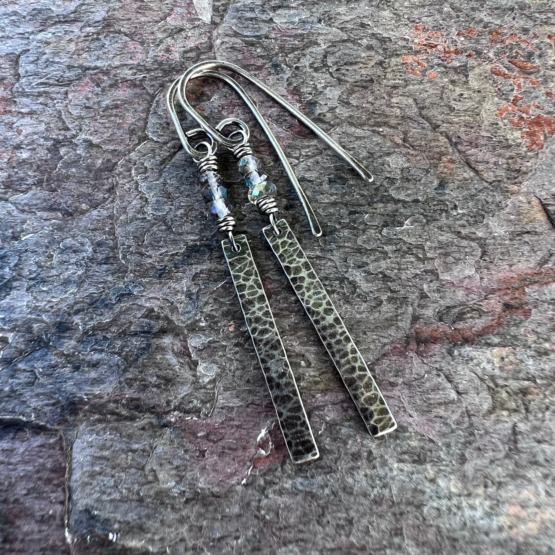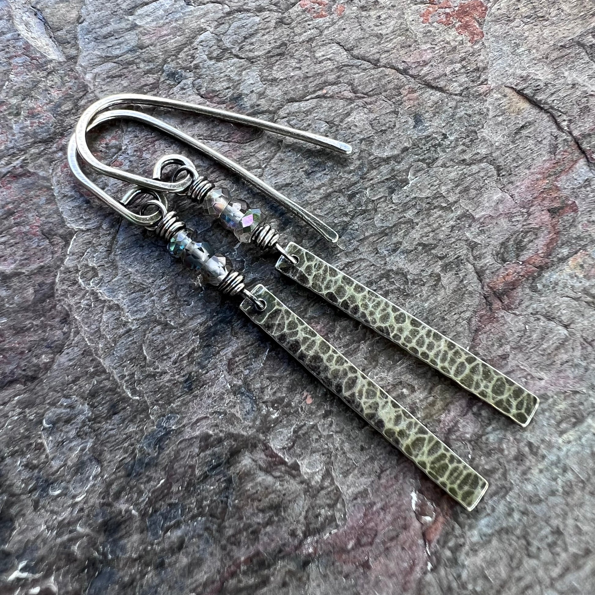 A set of tiny and sparkling genuine mystic topaz gems have been wrapped in sterling silver wire. Below the stones dangle sterling silver bars which I have cut, hammered, and finished by hand. The earrings hang from handformed sterling silver earwires.