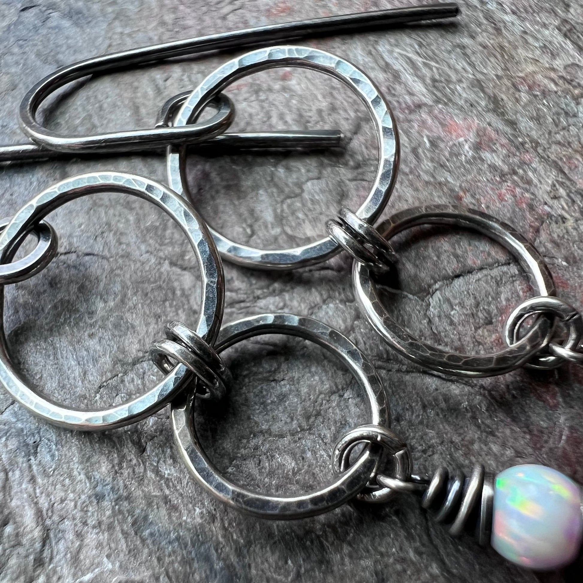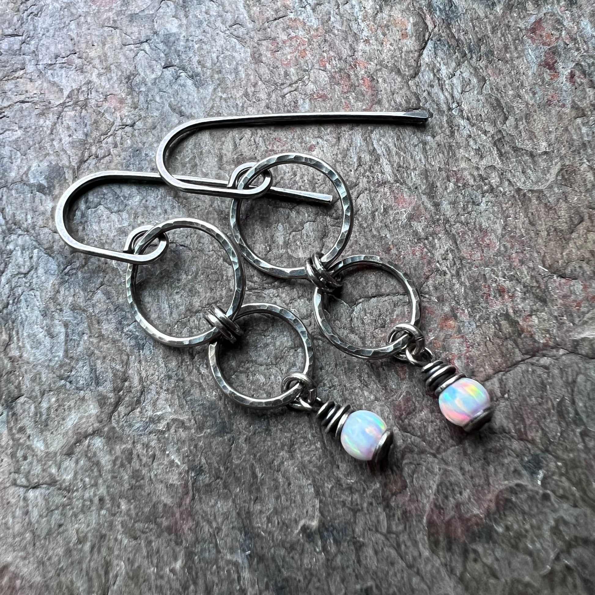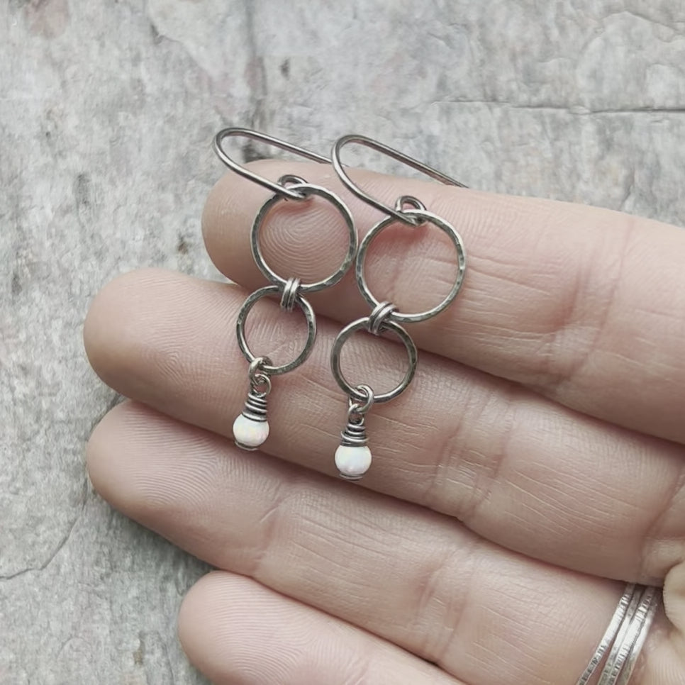 Two tiny simulated opals are wrapped in sterling silver. The beads dangle below a set of sterling silver circles. I have formed, soldered, and textured the design entirely by hand. The earrings hang from handformed sterling silver earwires. The silver has been oxidized and polished to create a patina finish.