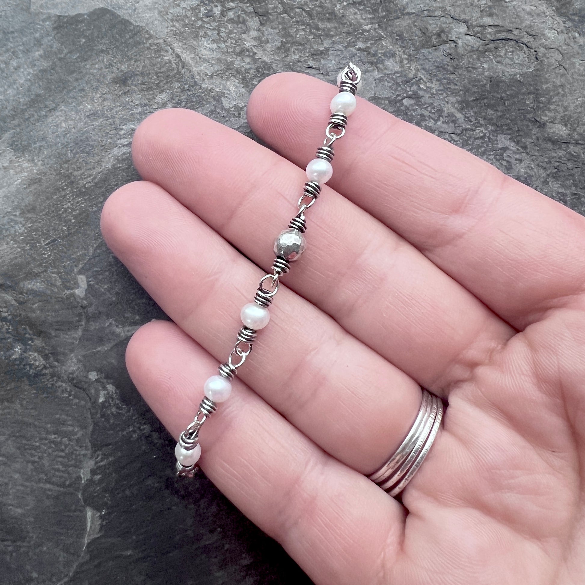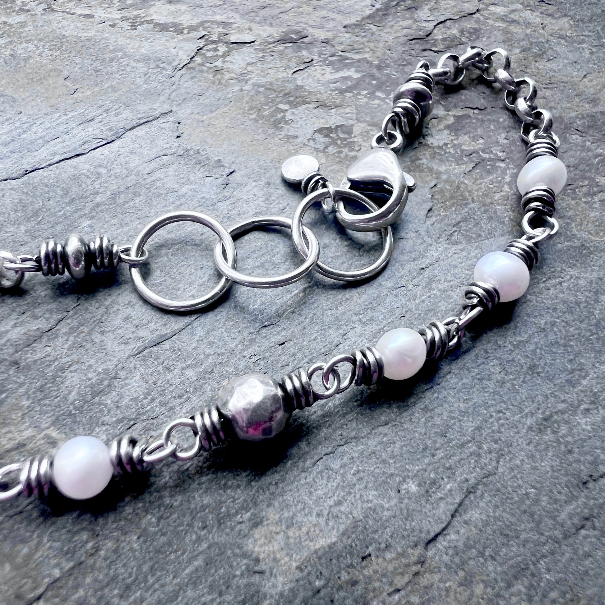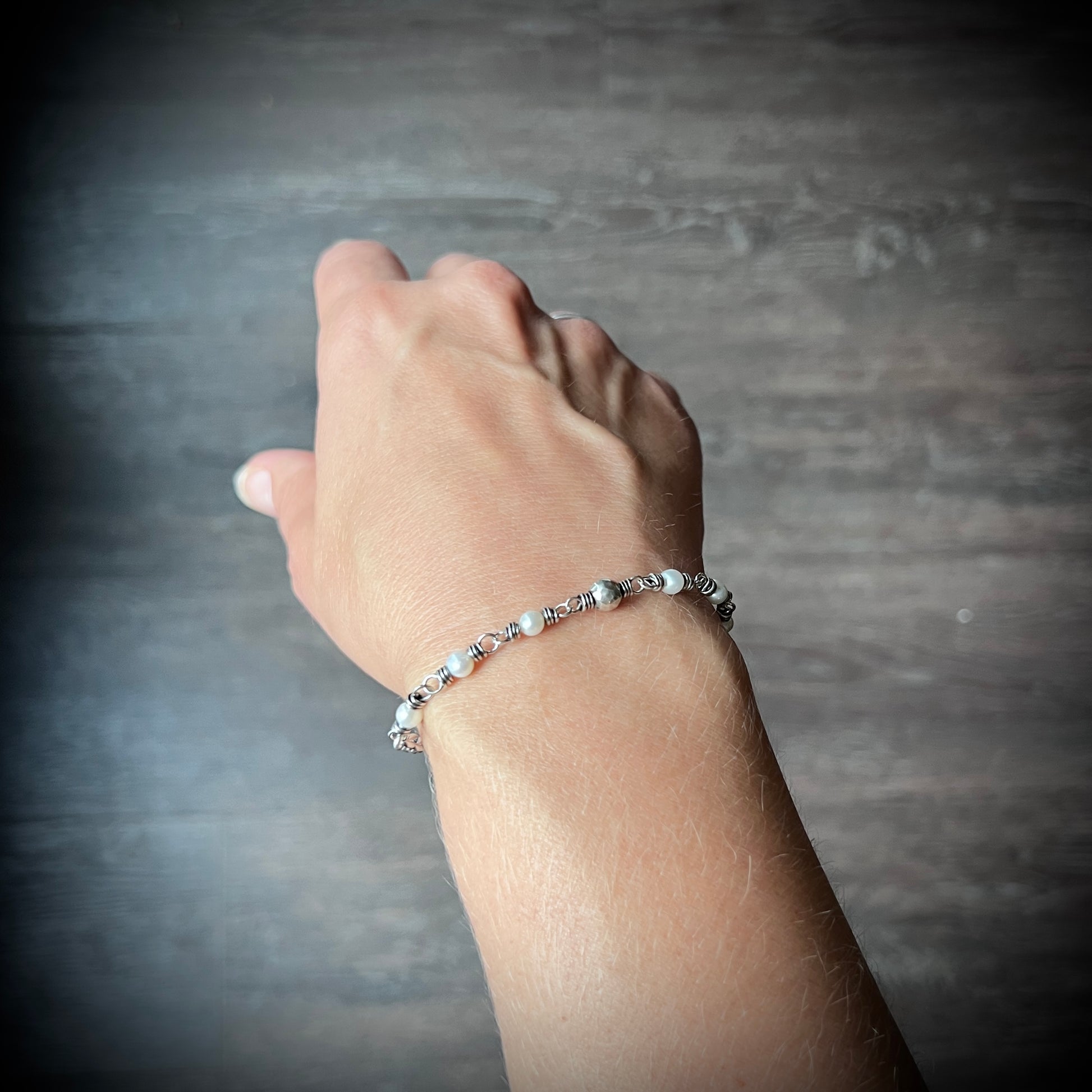 Sterling Silver Pearl Bracelet | Wire-wrapped Natural Pearl and Hammered Ball Bracelet