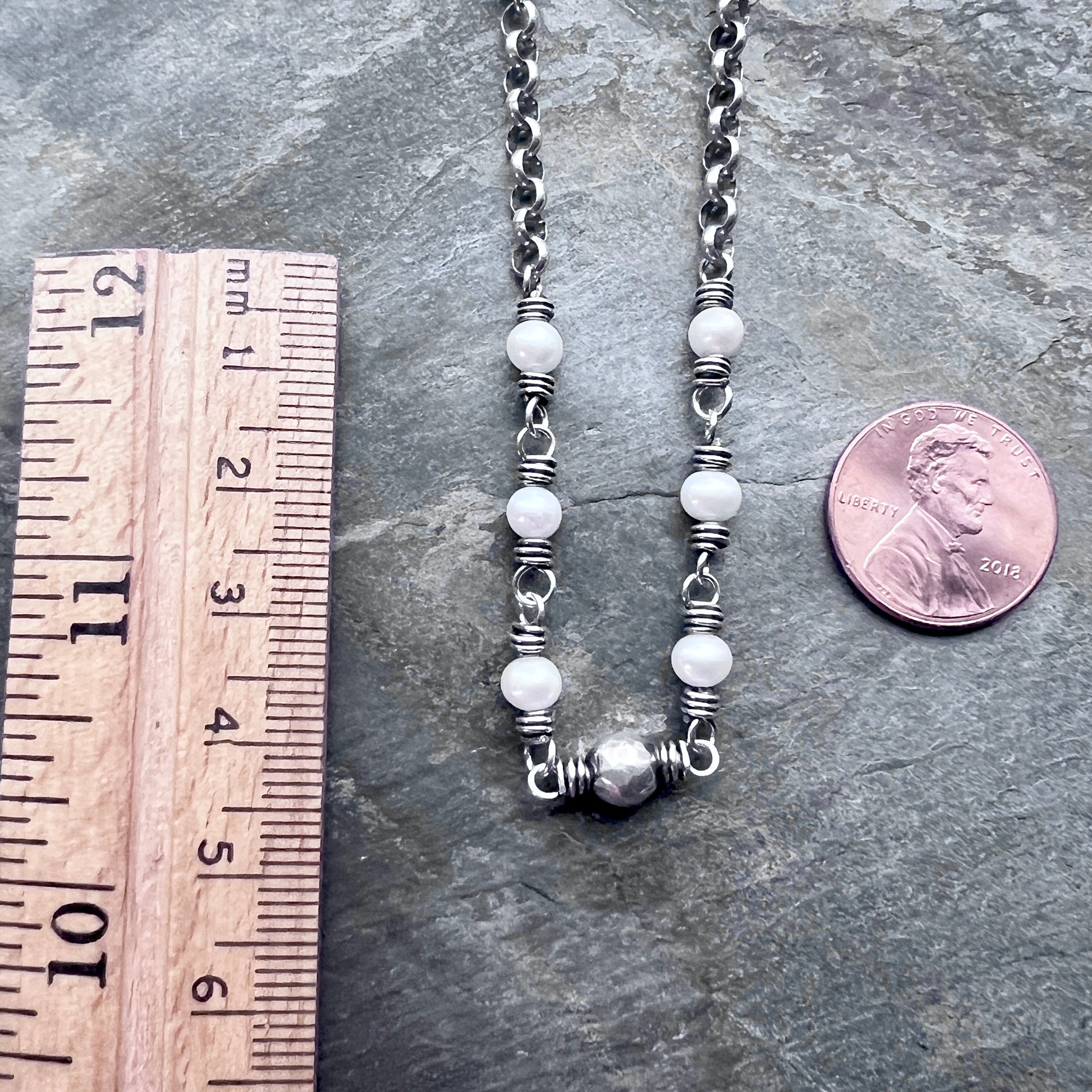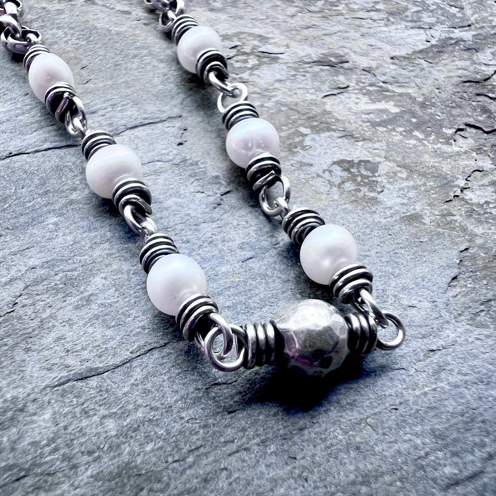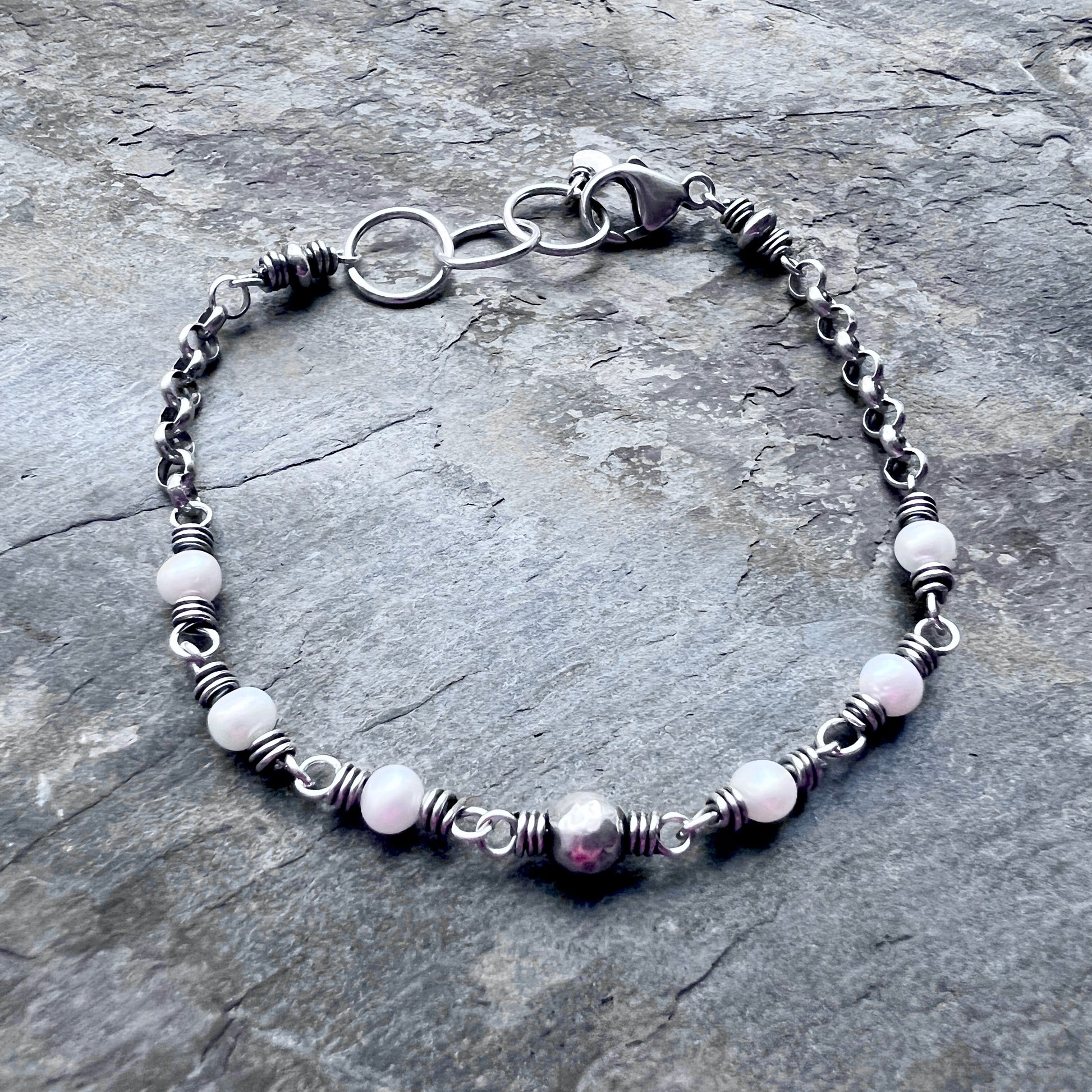 Sterling Silver Pearl Bracelet | Wire-wrapped Natural Pearl and Hammered Ball Bracelet