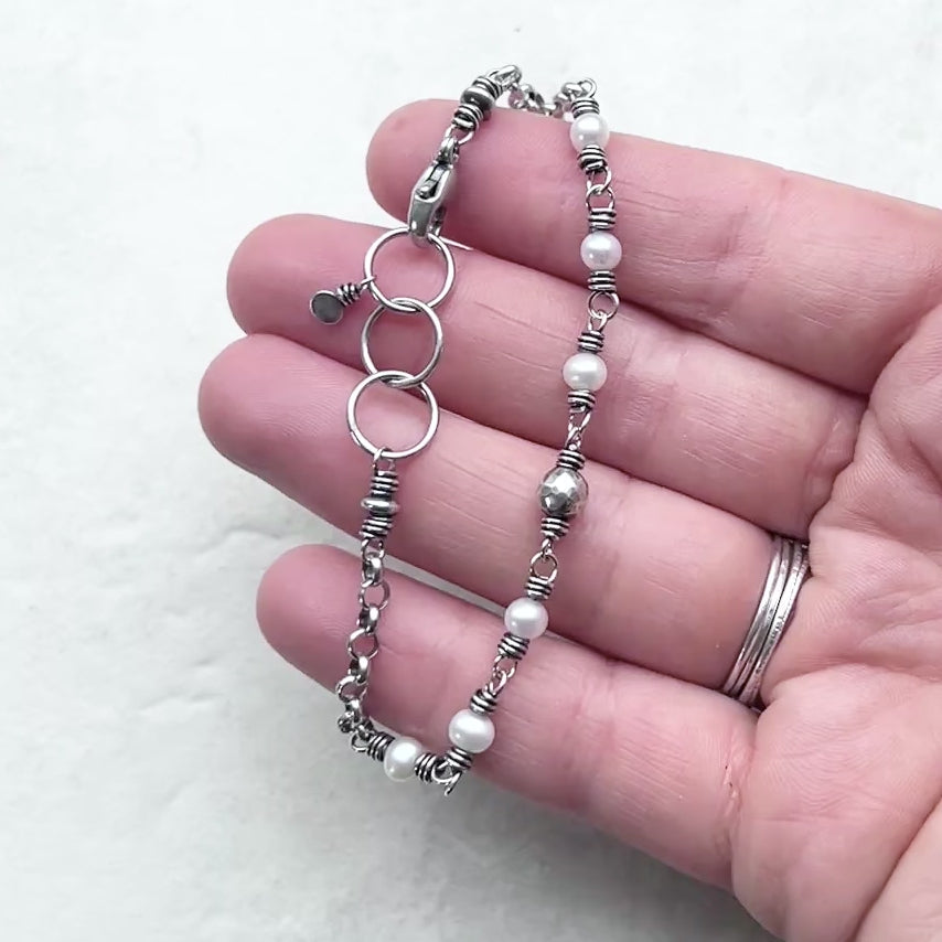 This beaded bracelet is created from genuine pearls and sterling silver. A hammered sterling silver ball is framed by six small freshwater pearls which have been wrapped in sterling silver wire. The beads are framed by sterling silver rolo chains. The end of the bracelet features a lobster claw clasp and a 1-inch extender allowing it to be slightly adjustable.