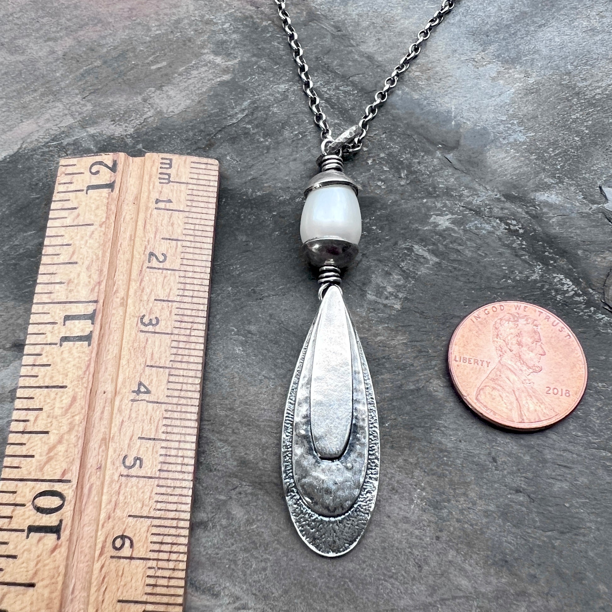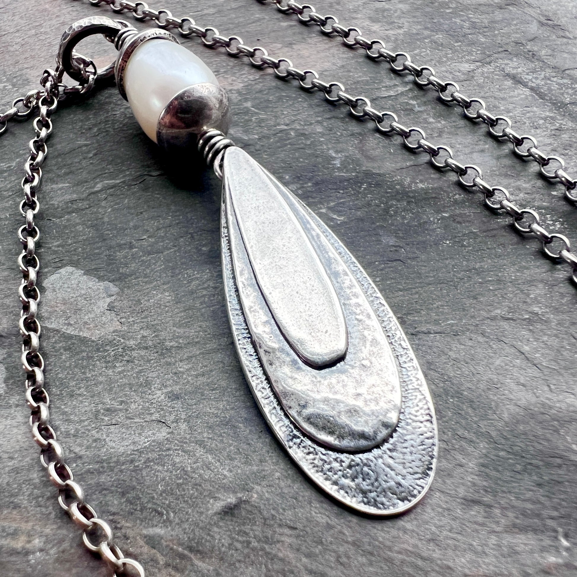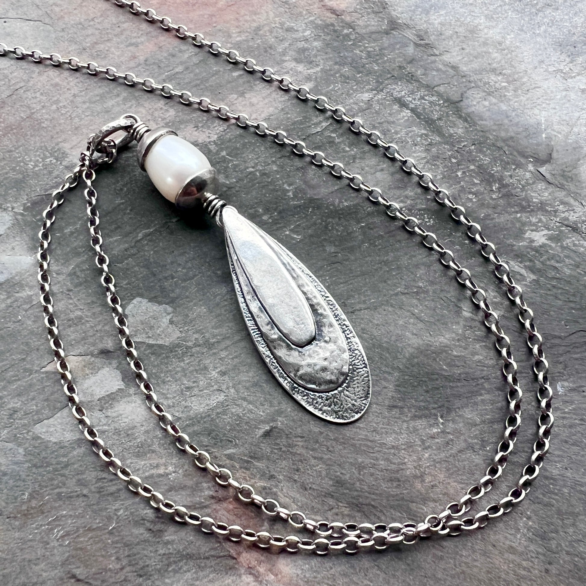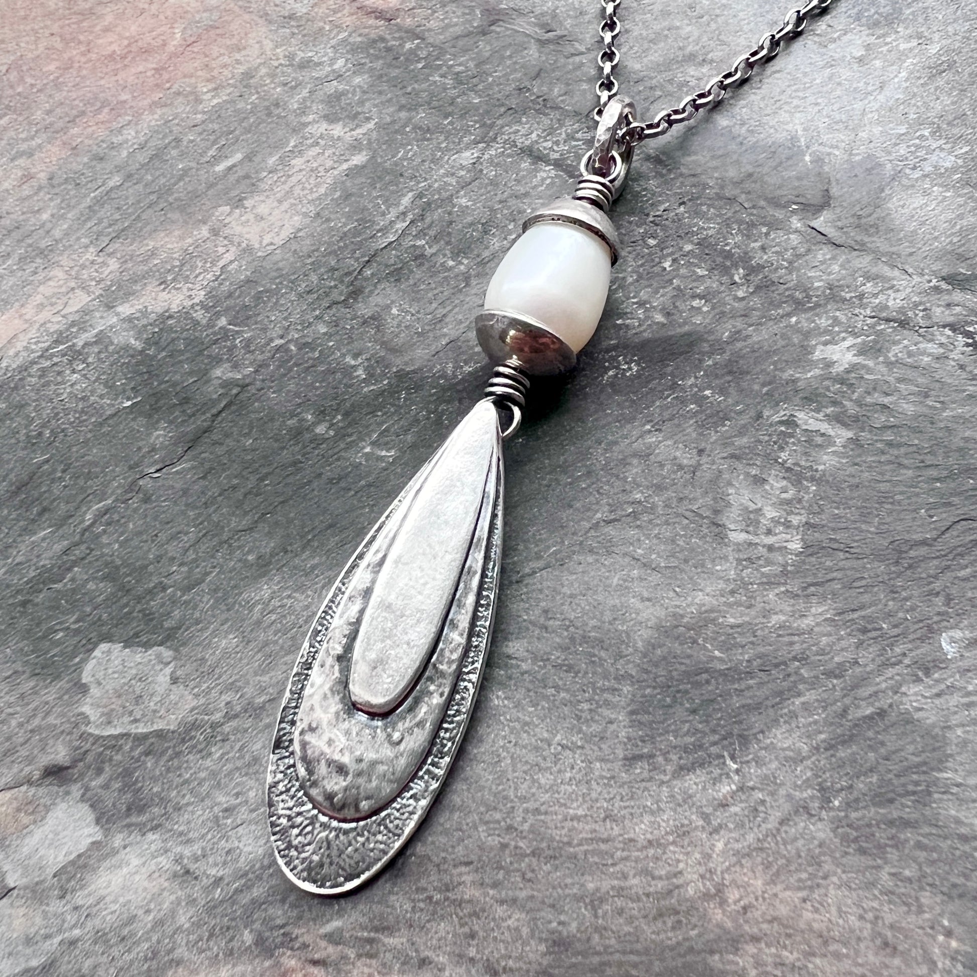 Sterling Silver Teardrop and Pearl Necklace | Hammered Teardrop and White Pearl Pendant