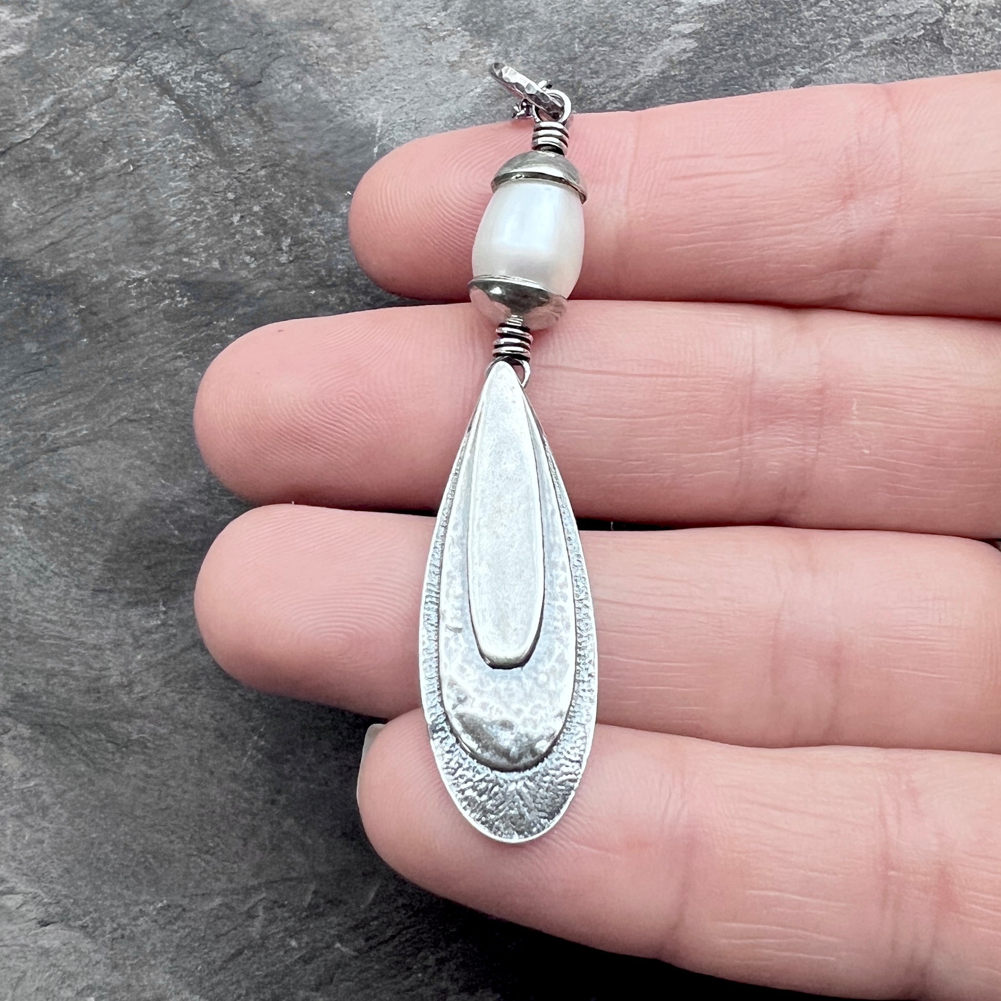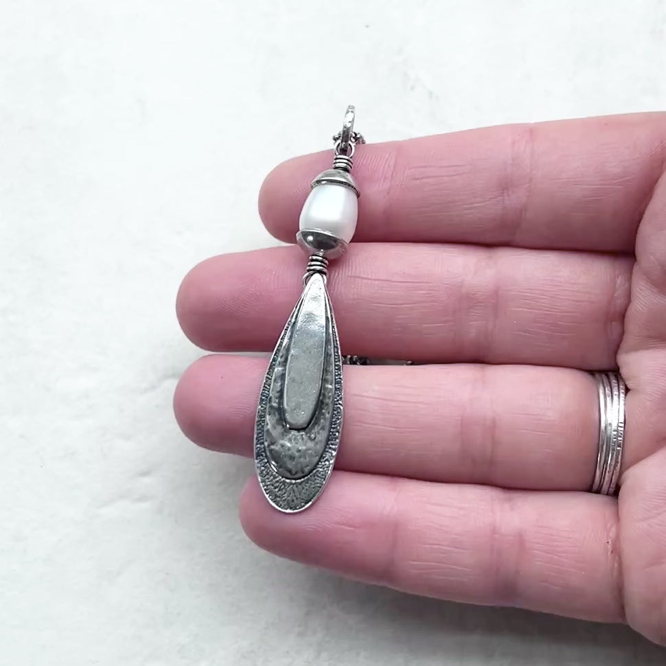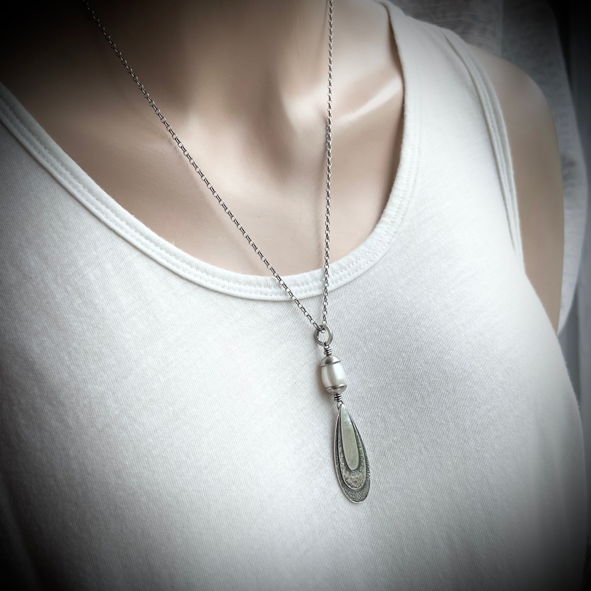The white natural pearl has been framed in silver. Below the pearl is an hammered teardrop which I have created by combining three layers of sterling silver. Each layer has its own unique texture. The silver has been oxidized and polished to create an antique patina finish.