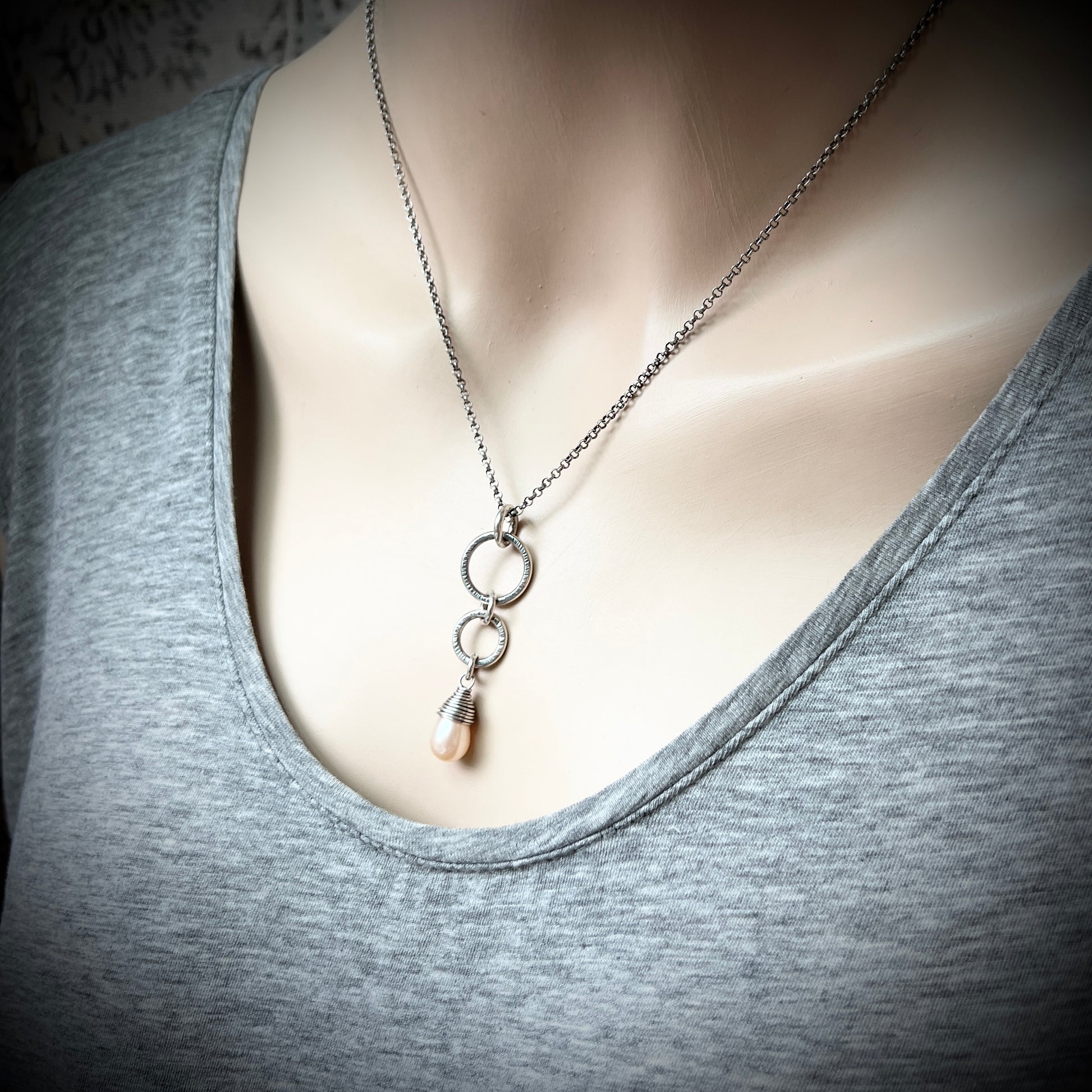 This necklace is handmade from a genuine freshwater pearl and sterling silver. The pale peach natural pearl has been wrapped in silver wire. Above the pearl are hammered rings which I have formed, soldered, and hammered by hand. The silver has been oxidized and polished to create a patina finish.